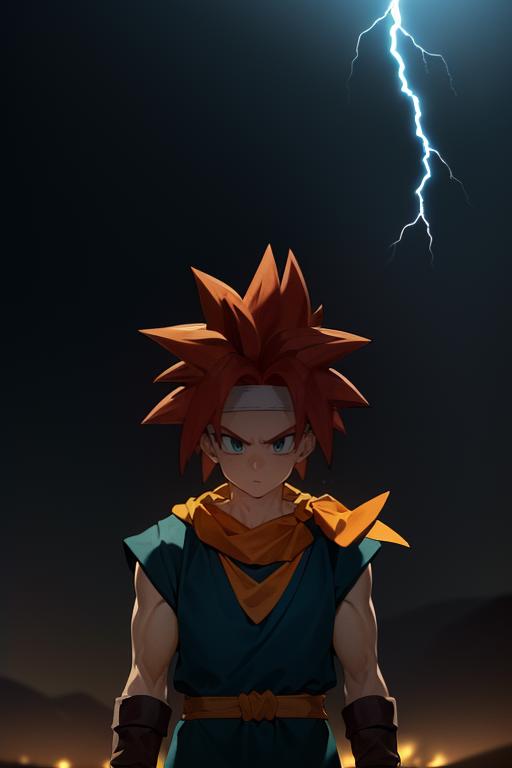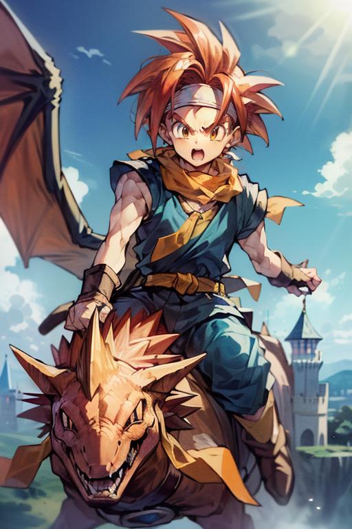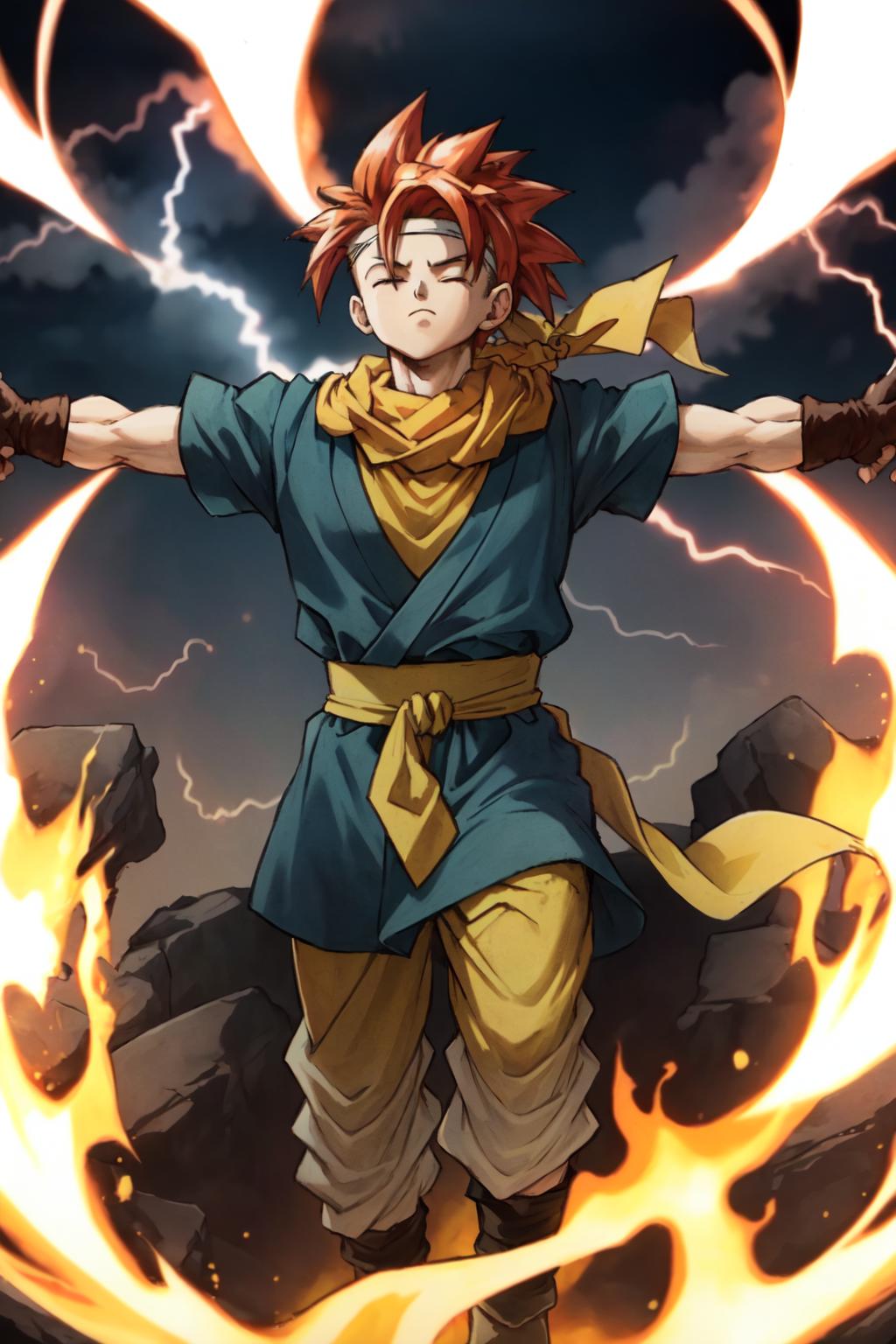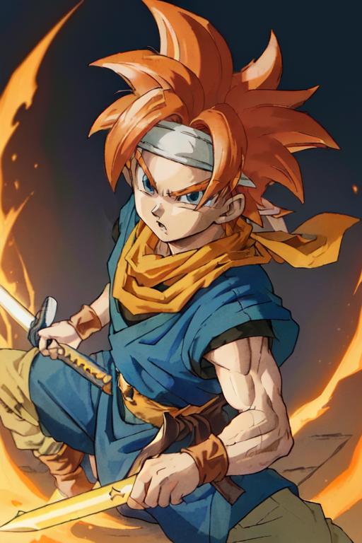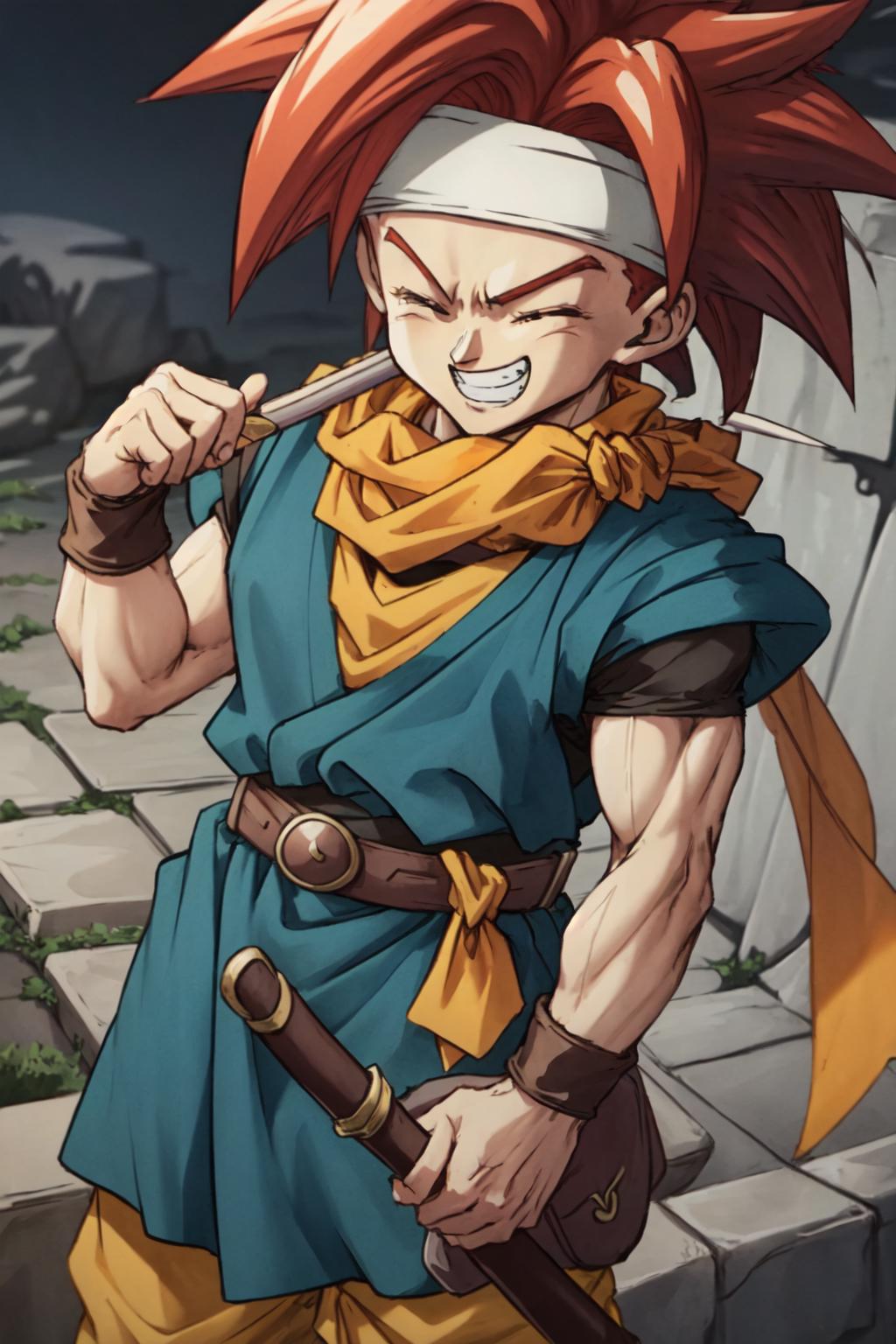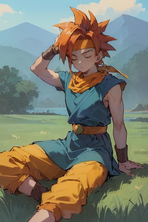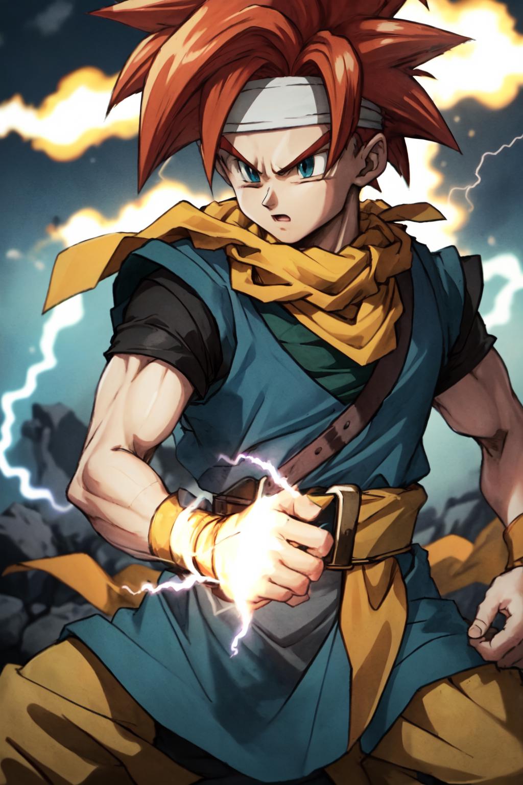 blue tunic, white headband, orange neckerchief, red hair, spiked hair