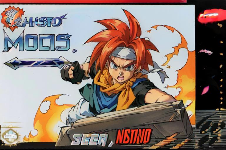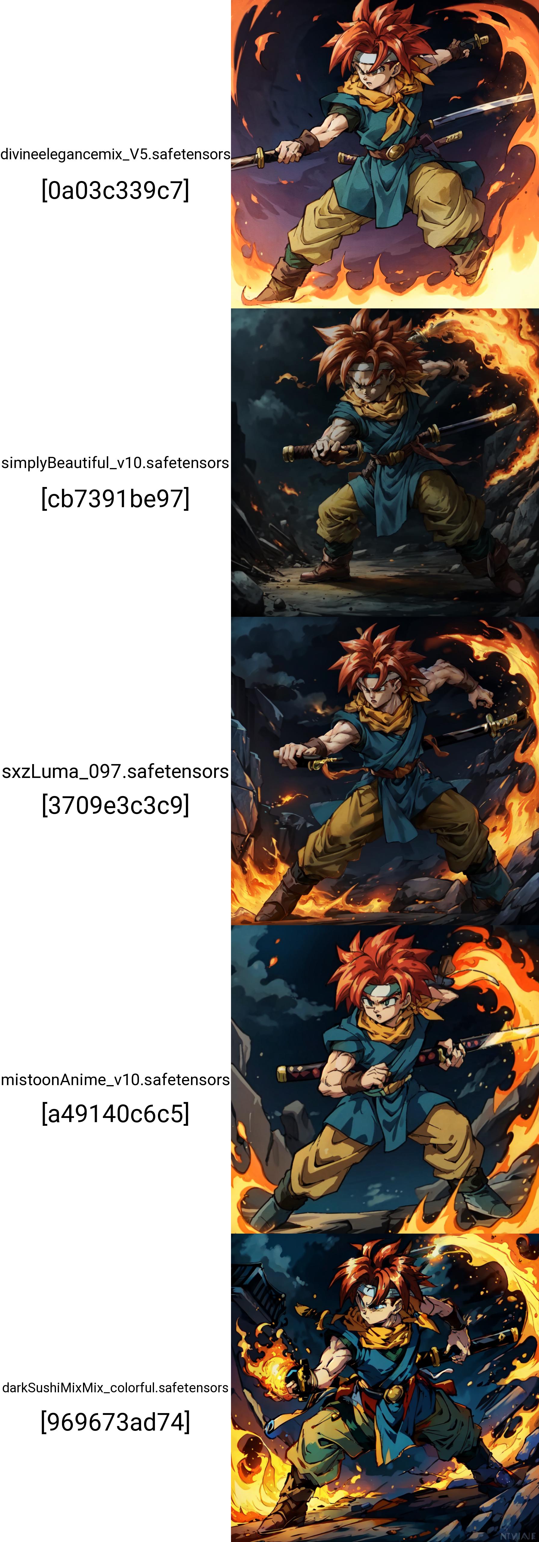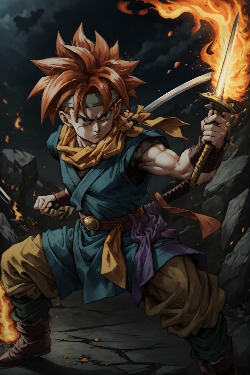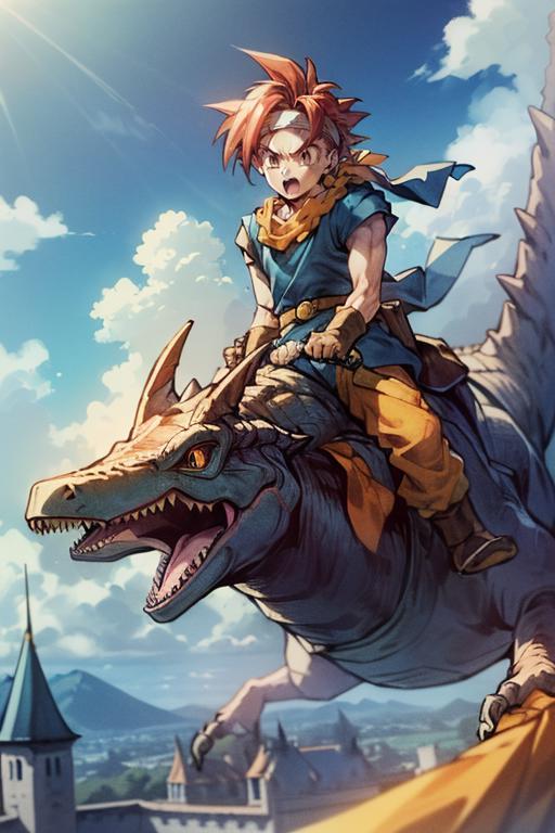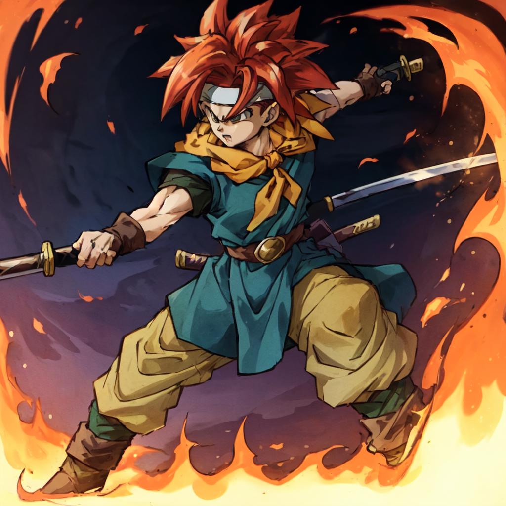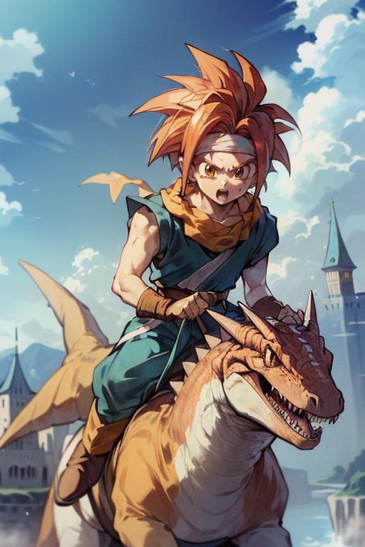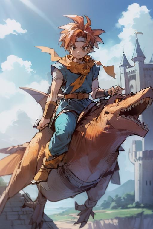 blue tunic, white headband, orange neckerchief, red hair, spiked hair
