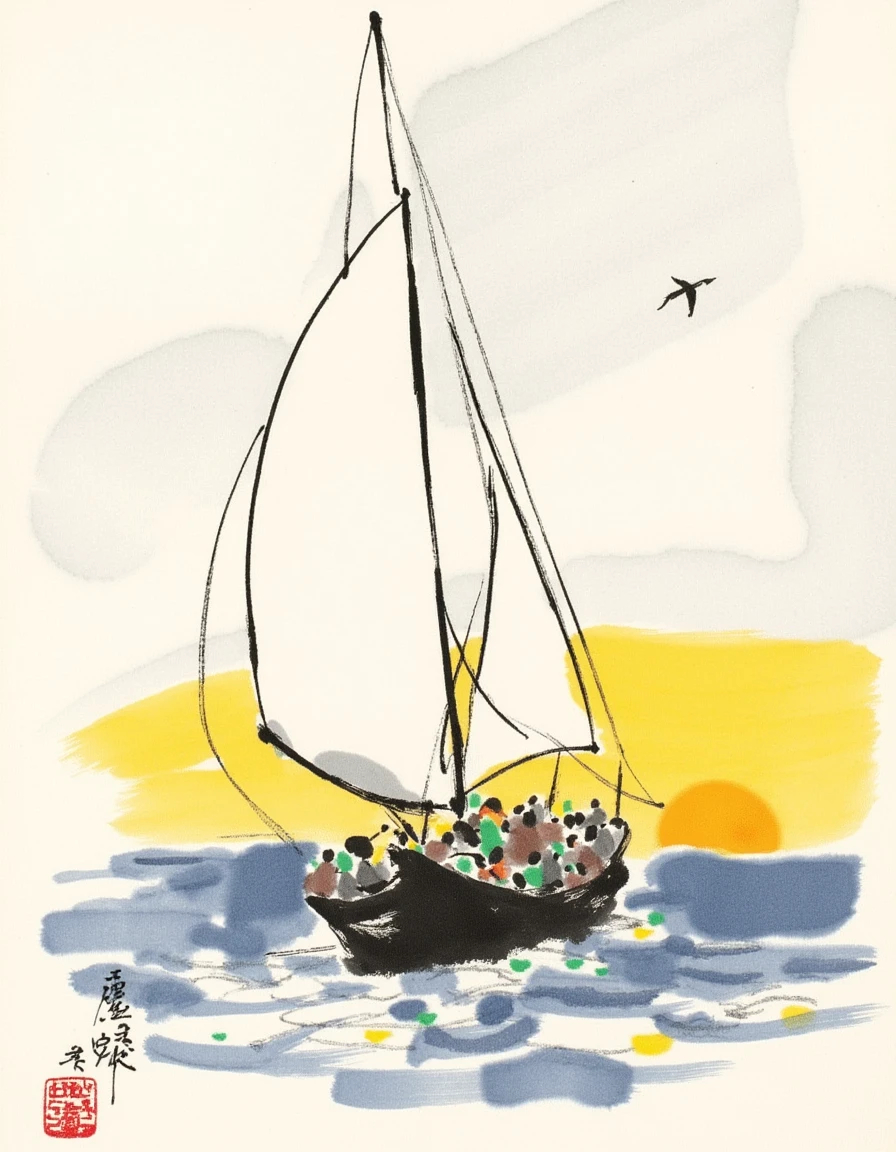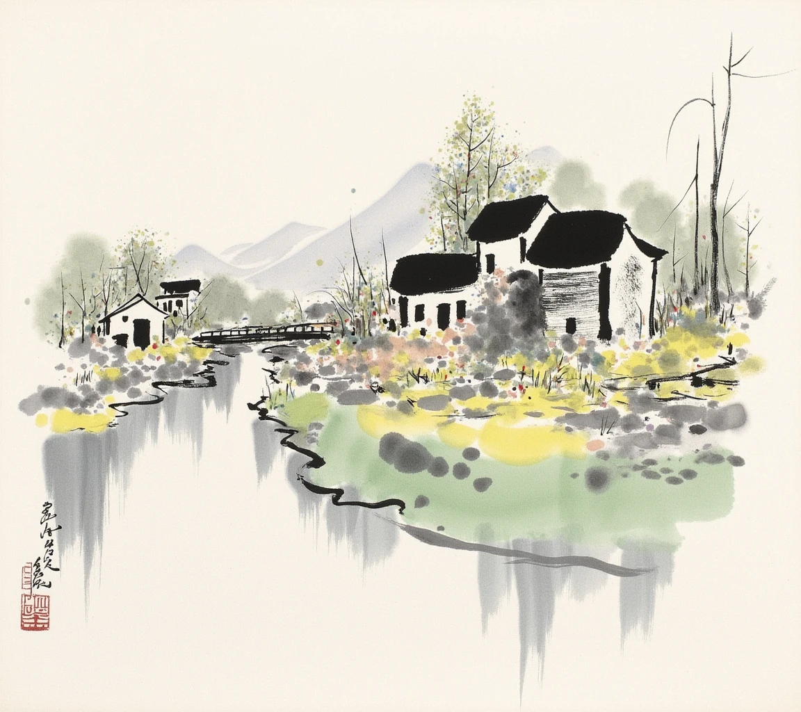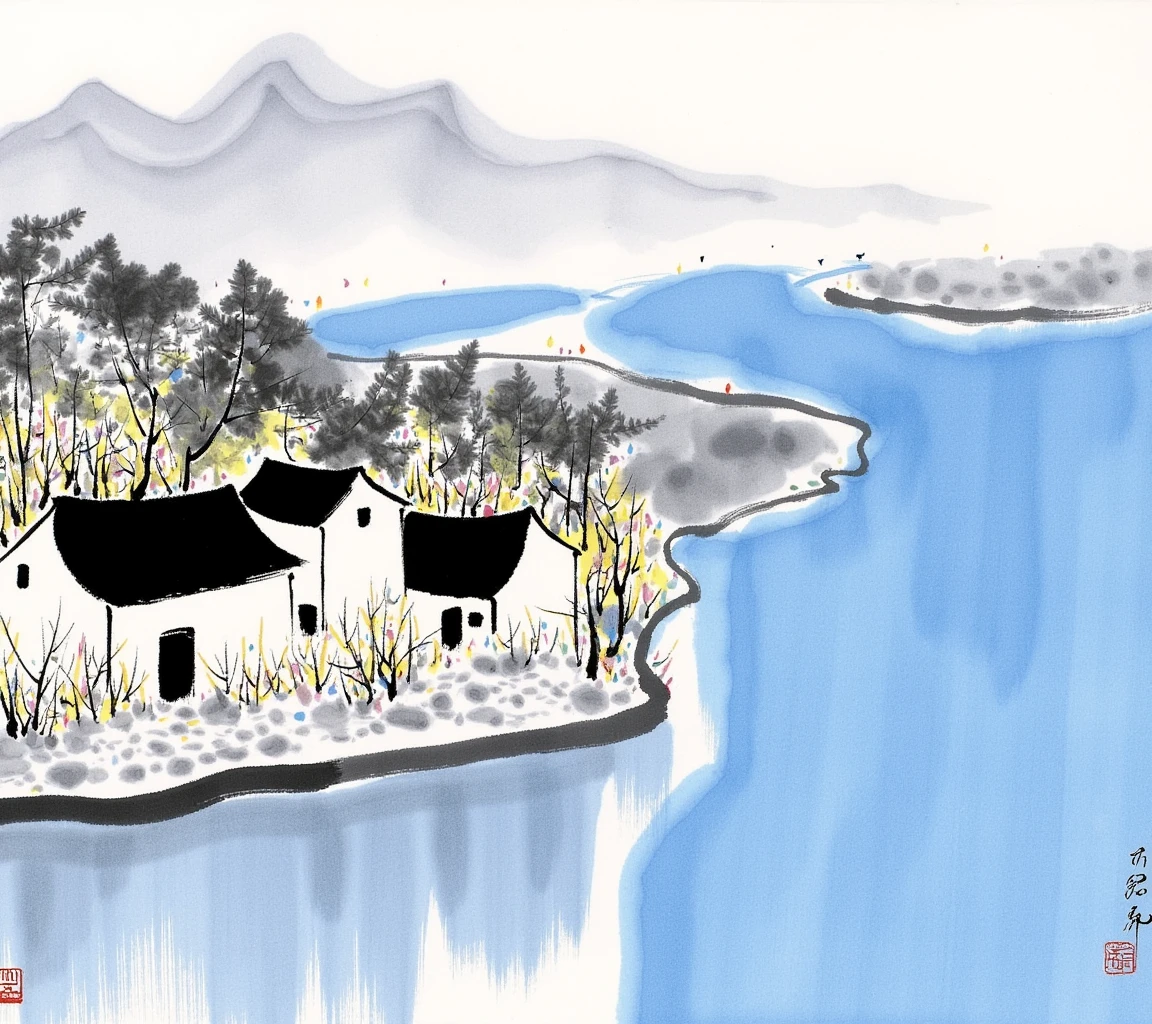 wgz ink wash style, A vibrant village scene with colorful trees, houses, and a boat on a blue river.