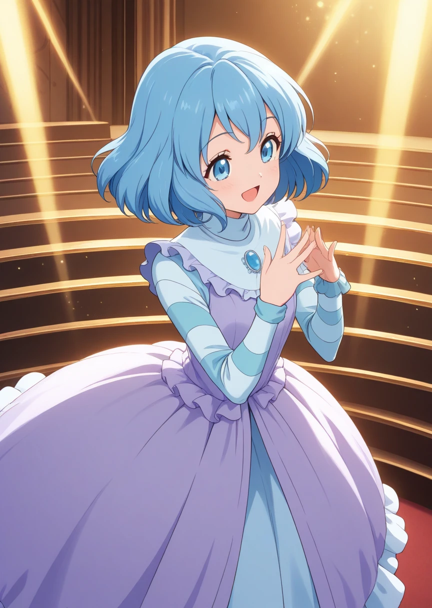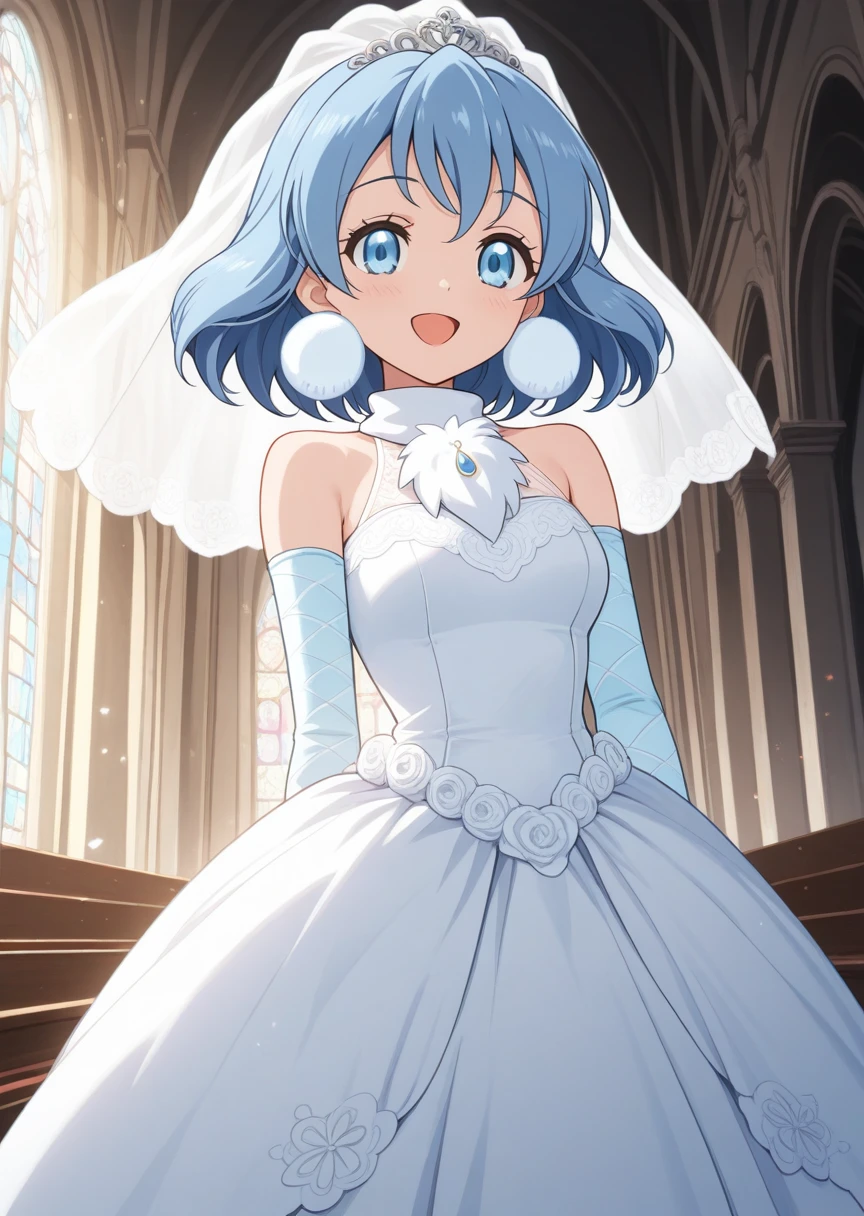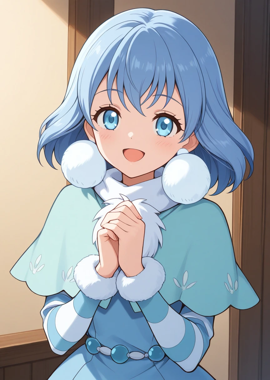 optional: pom pom earrings, blue capelet, blue dress, fur trim \(clothing\)