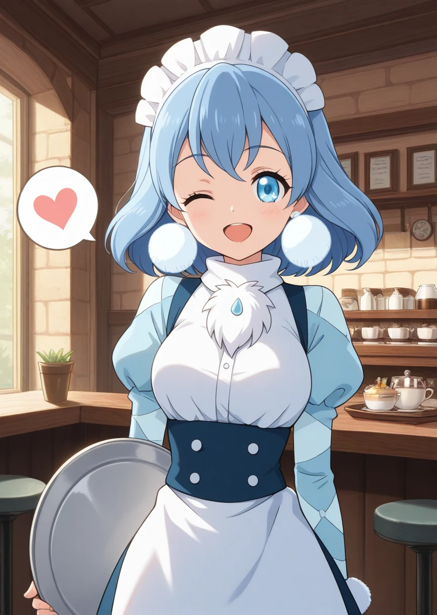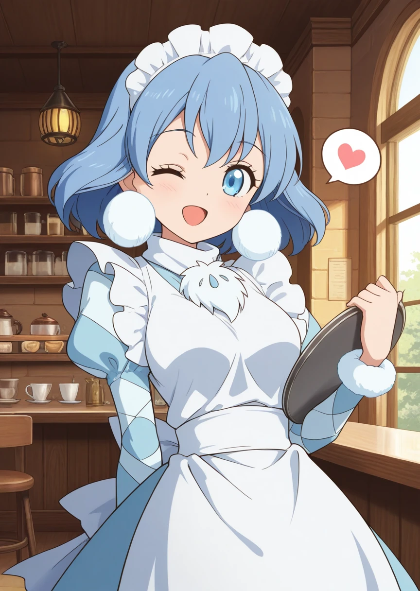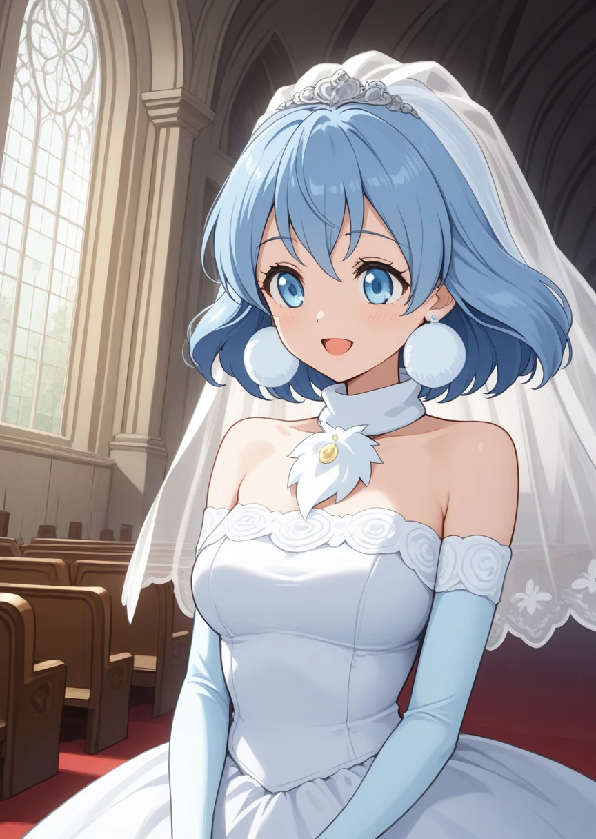 optional: pom pom earrings, blue capelet, blue dress, fur trim \(clothing\)