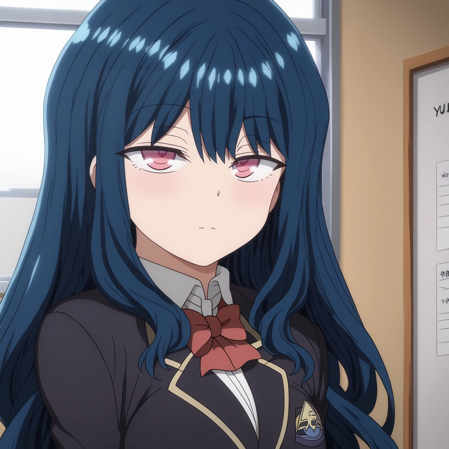 YuuNozaki,1girl,blue hair,long hair,pink eyes,
