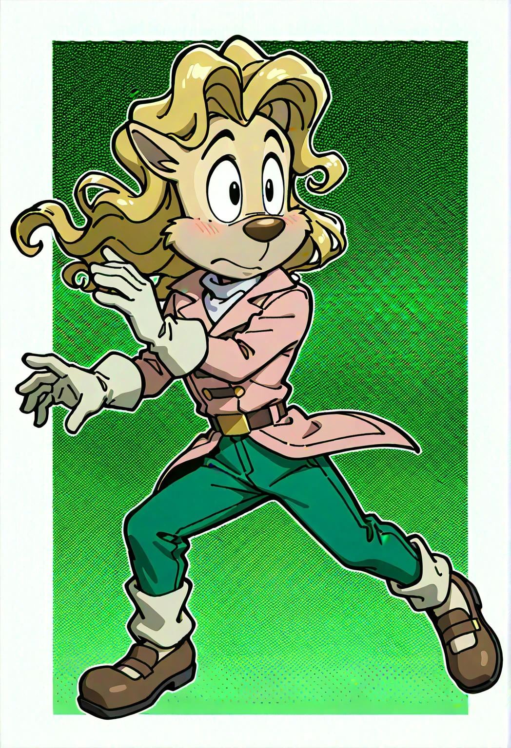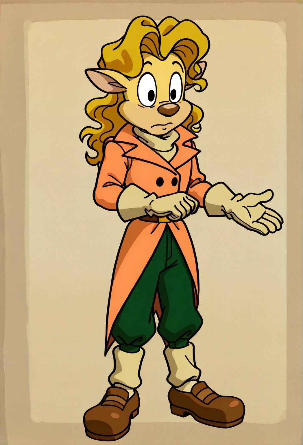 BartlebyMontClairSU, 1boy, golden wavy hair, beige fur, stylish salmon-colored jacket, high collar, olive-green trousers, brown nose, black eyes, beige gloves, beige socks, brown shoes
