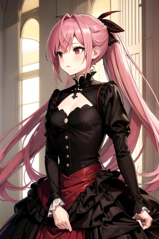 AkashaBl00dr1ver, 1girl, solo, long hair, red eyes, dress, hair ribbon, ponytail, pink hair, hair bow, frills, black dress, red dress, cross, long dress