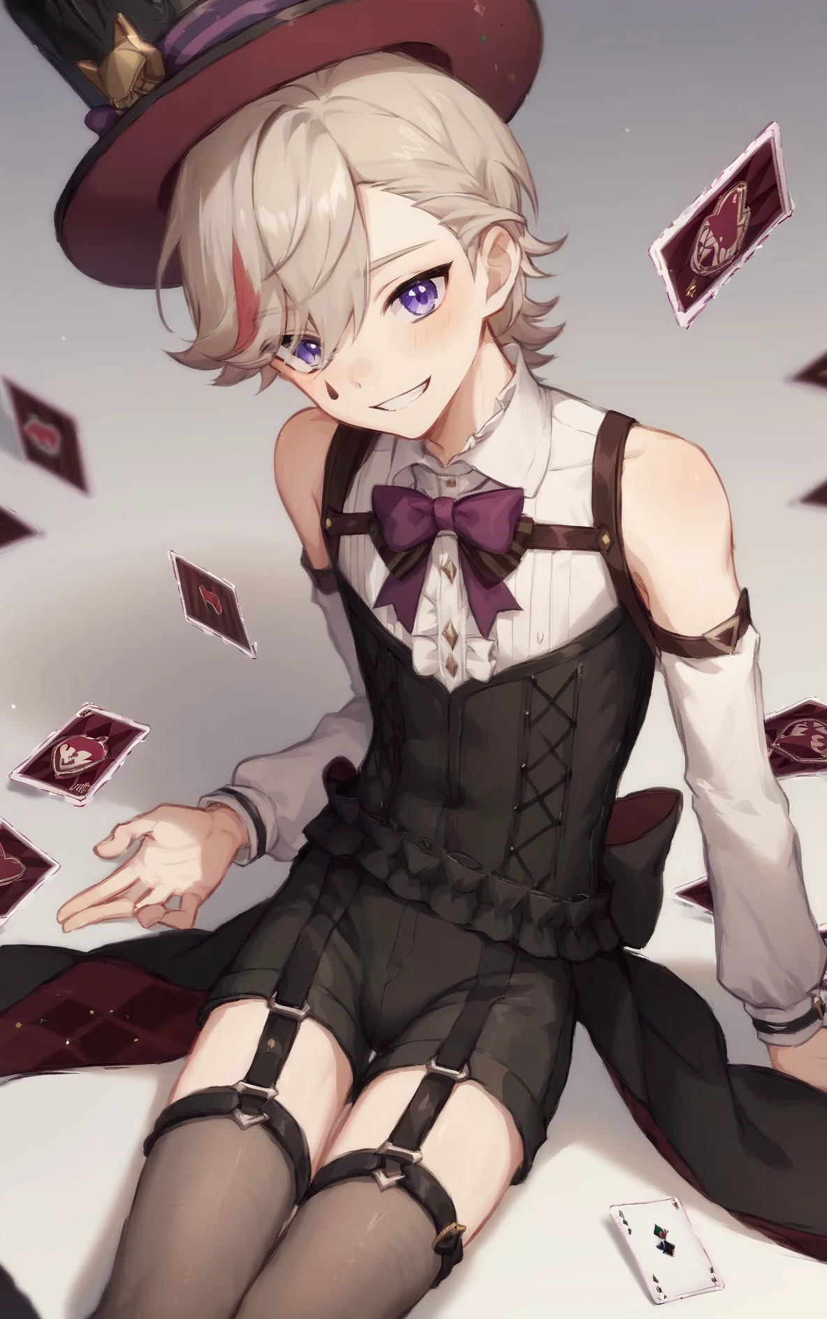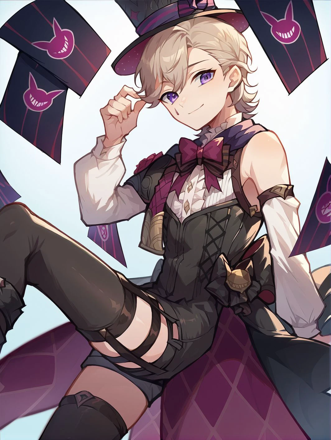 LoRA responds to the tag "lyney". By default the Lora tends towards giving him more blue-ish eyes, so I recommend the tag "purple eyes". To get his unique leg-wear, tag "thighhighs" is also recommended.