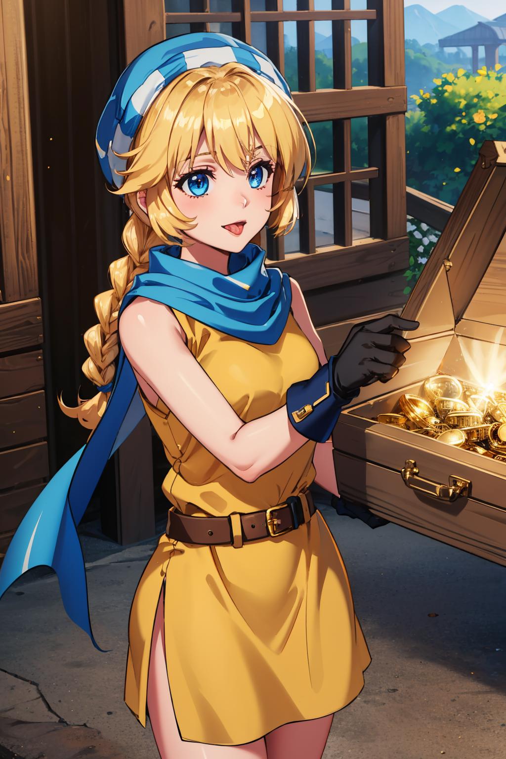 Prompt: patty fe, sleeveless, tongue, black gloves, belt, bag, scarf, single braid, sleeveless dress, brown gloves, blue headwear, yellow dress, blue scarf