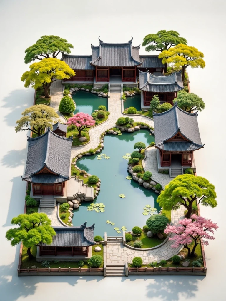 Miniature traditional Chinese garden architecture, featuring irregular ponds, double - eaved pavilions, osmanthus trees, and peony gardens, very gorgeous.