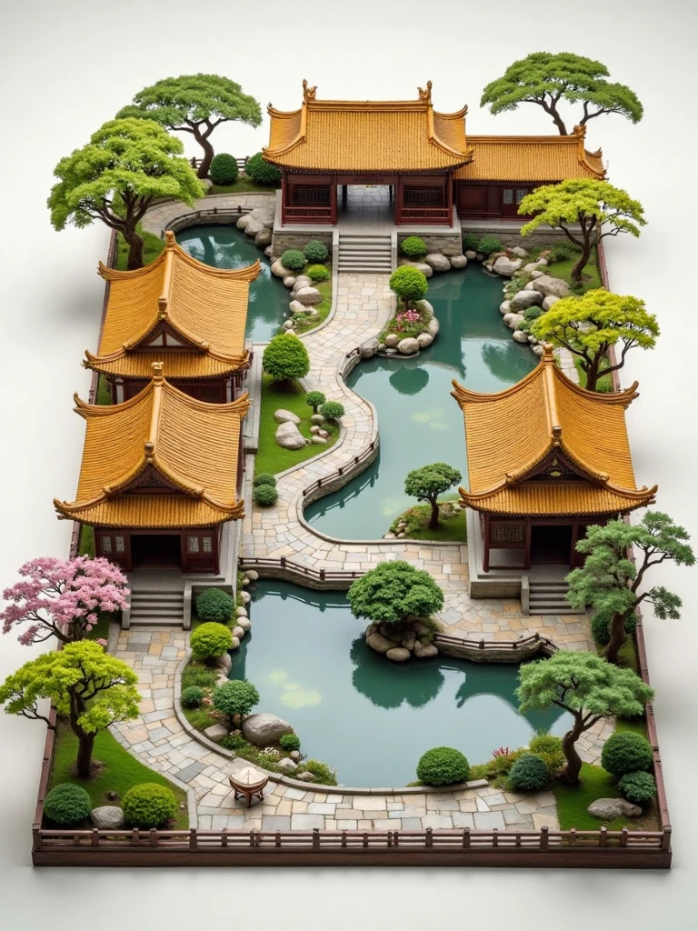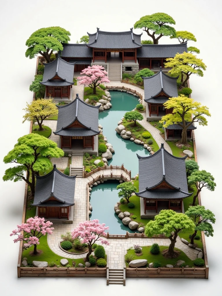 Miniature traditional Chinese garden architecture, with winding rivers, delicate pavilions, lush bonsai trees, and pink cherry blossoms, presenting a serene scene.