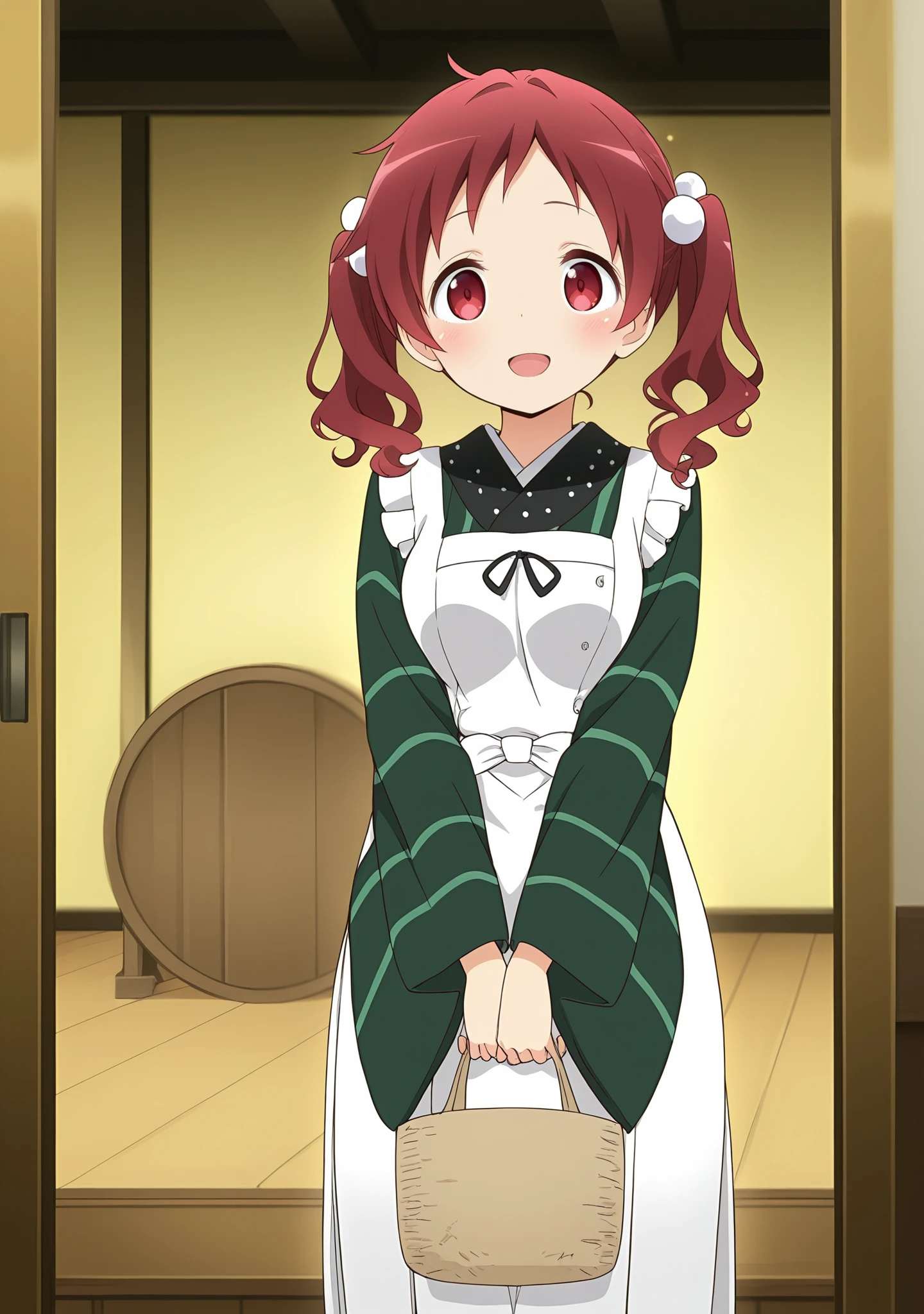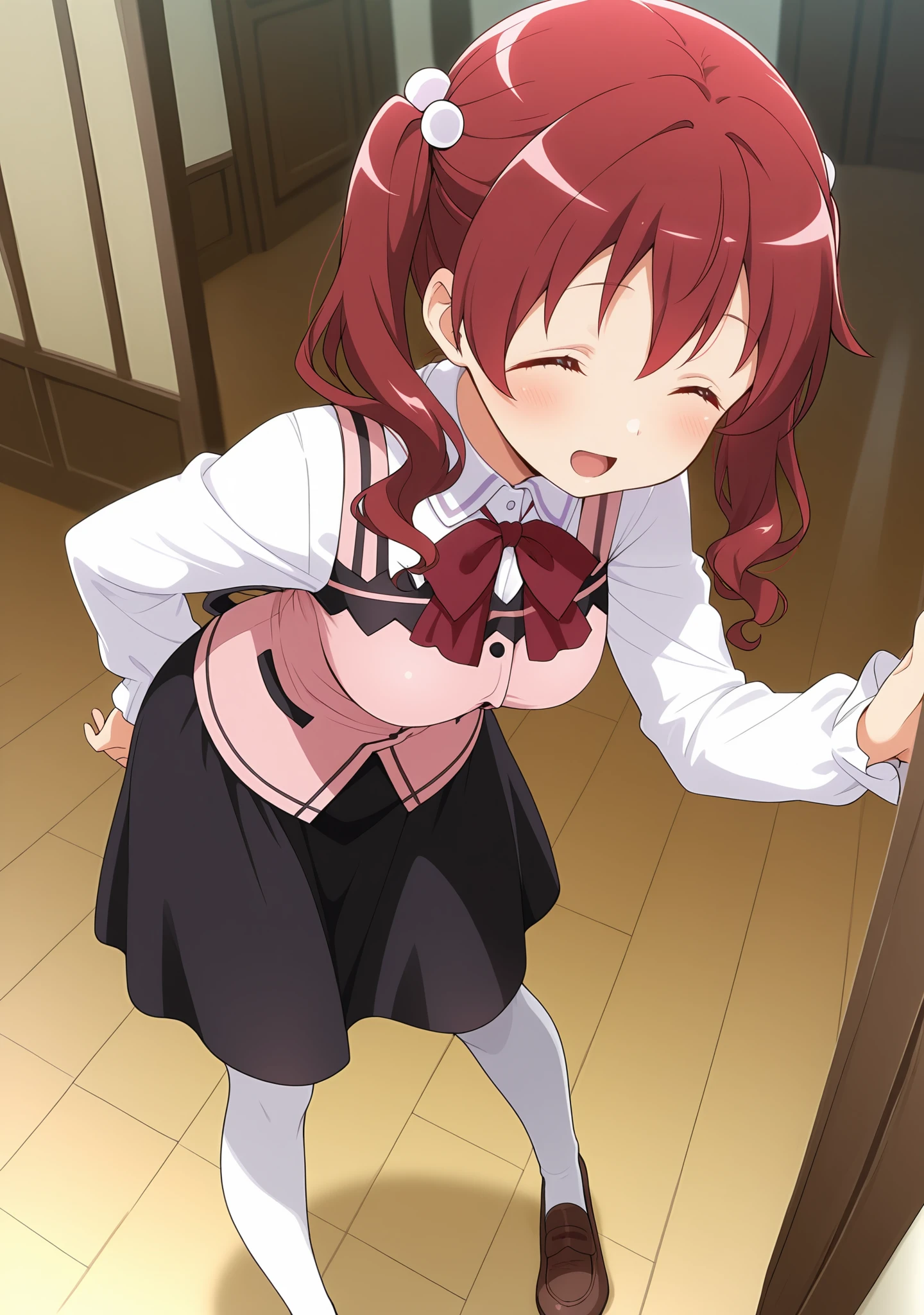 red hair,red eyes,wavy hair,twintails,medium breasts,