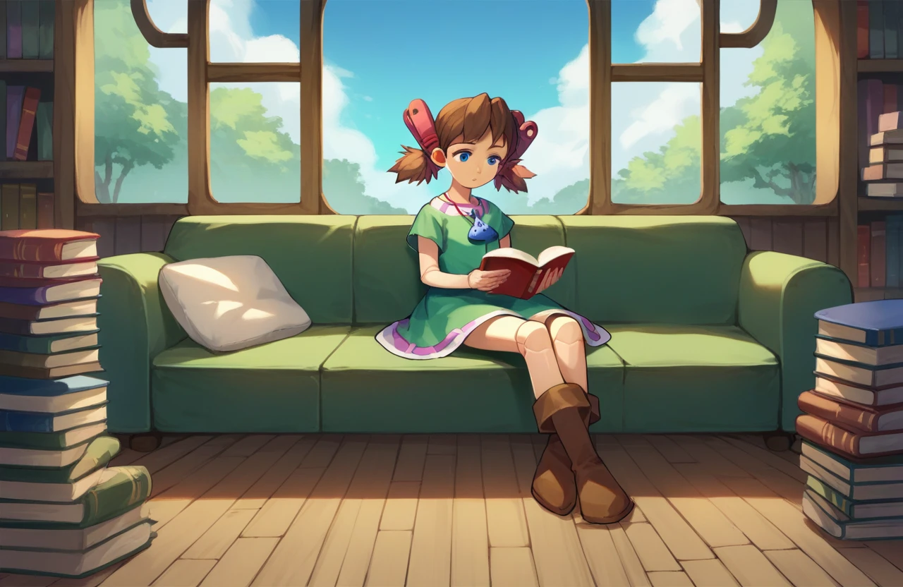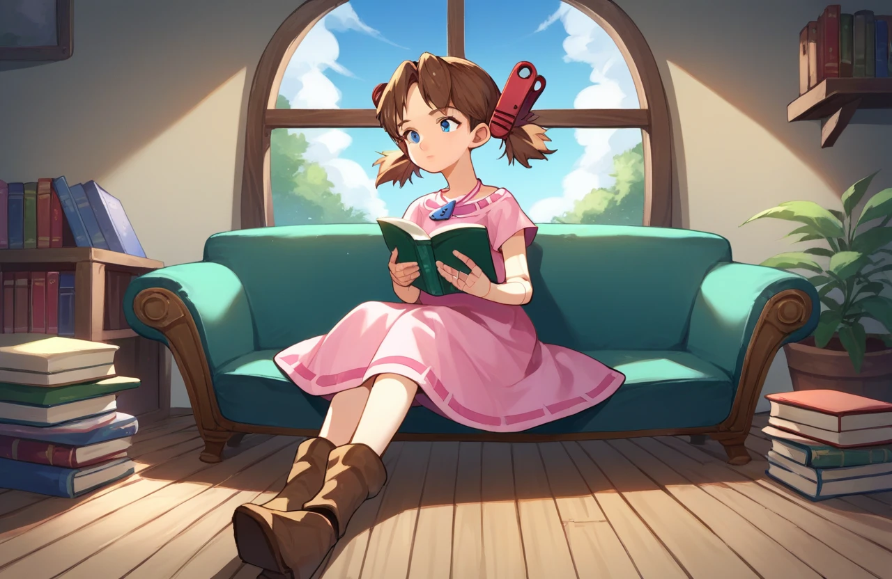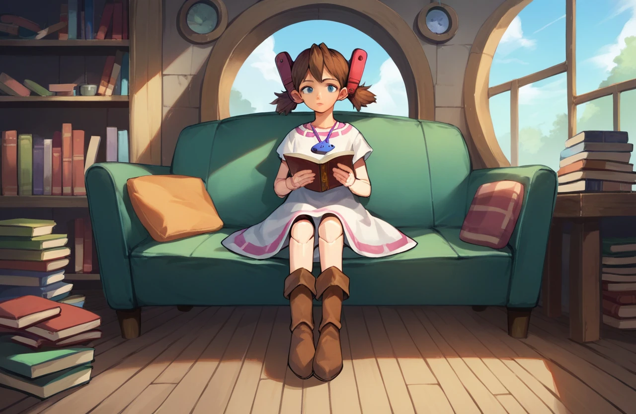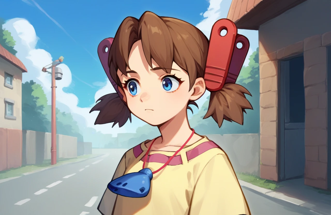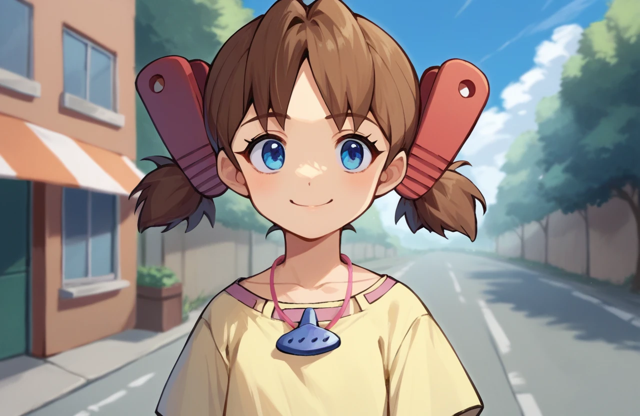 josettewpj2, brown hair, short hair, hair ornament, twintails, blue eyes, ocarina, jewerly, necklace, brown boots,