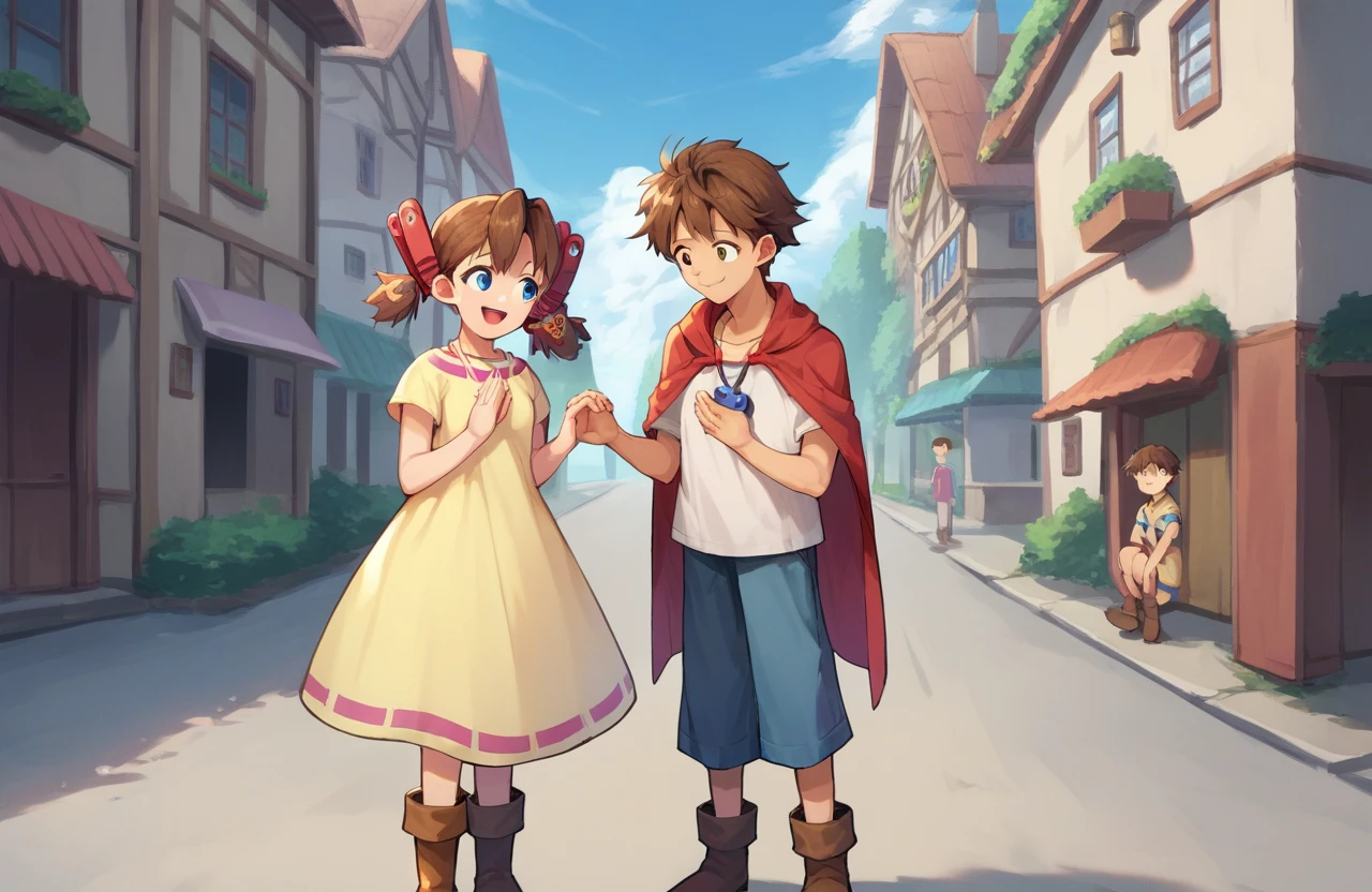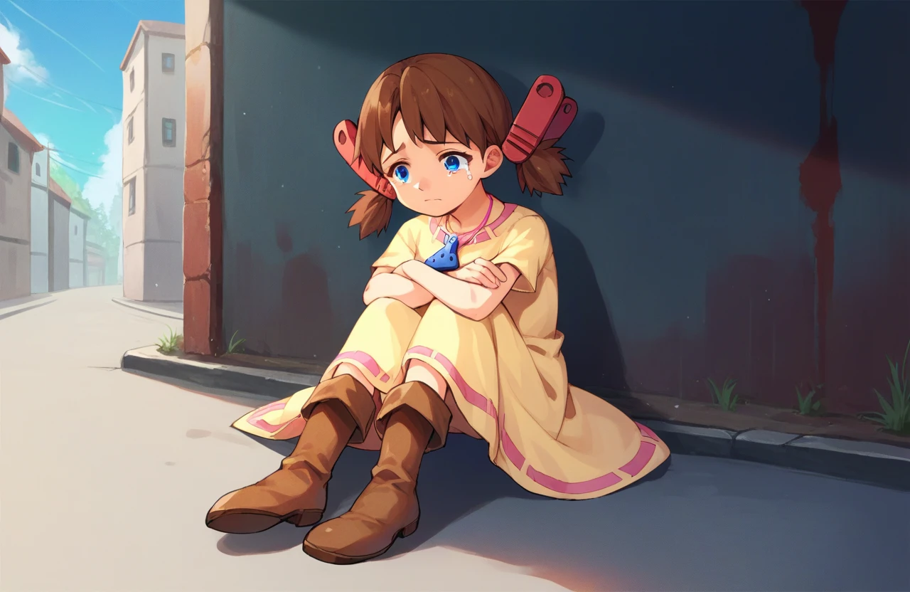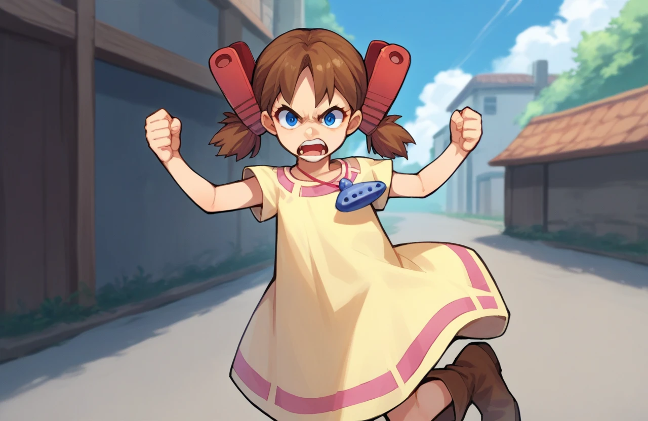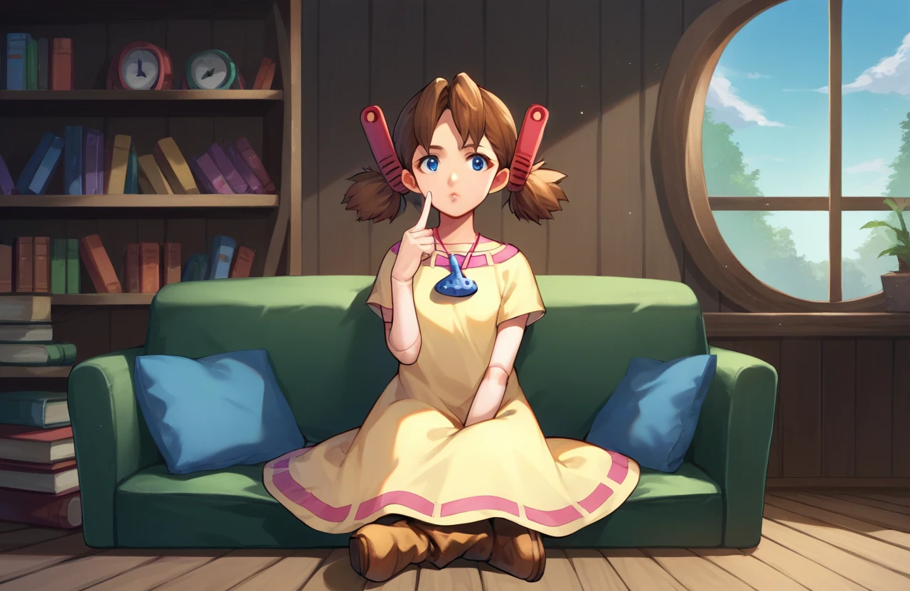 josettewpj2, brown hair, short hair, hair ornament, twintails, blue eyes, ocarina, jewerly, necklace, yellow dress, brown boots,