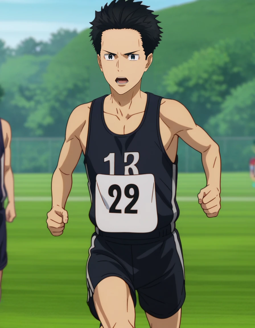 kakeru kurahara,track uniform,black shorts,hair slicked back,sleeveless,runningHaiji Kiyose