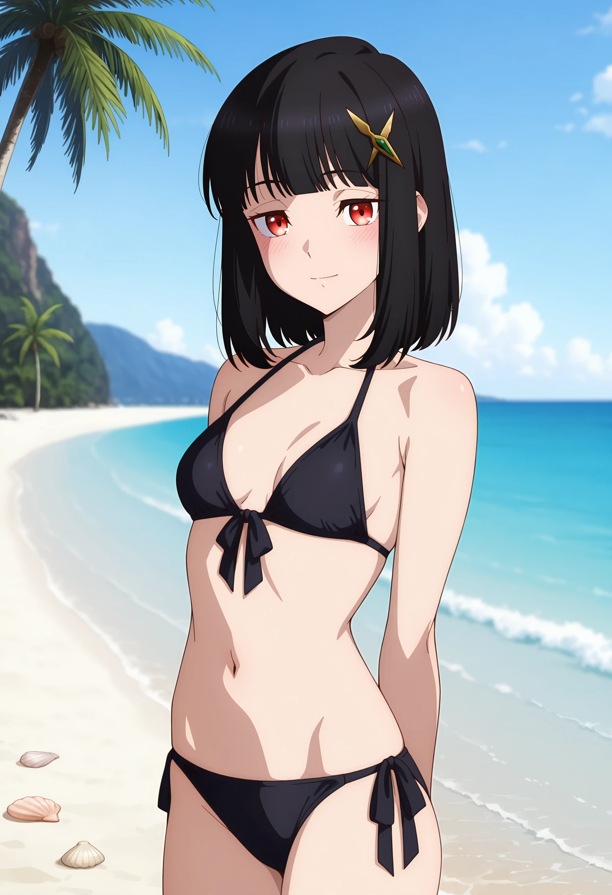 blunt bangs, medium hair, black hair, red eyes, hairclip, hooded cloak, black cloak, black ascot, brooch, center frills, collared shirt, white shirt, black belt, high-waist skirt, frilled skirt, blue skirt, frilled thighhighs, black thighhighs