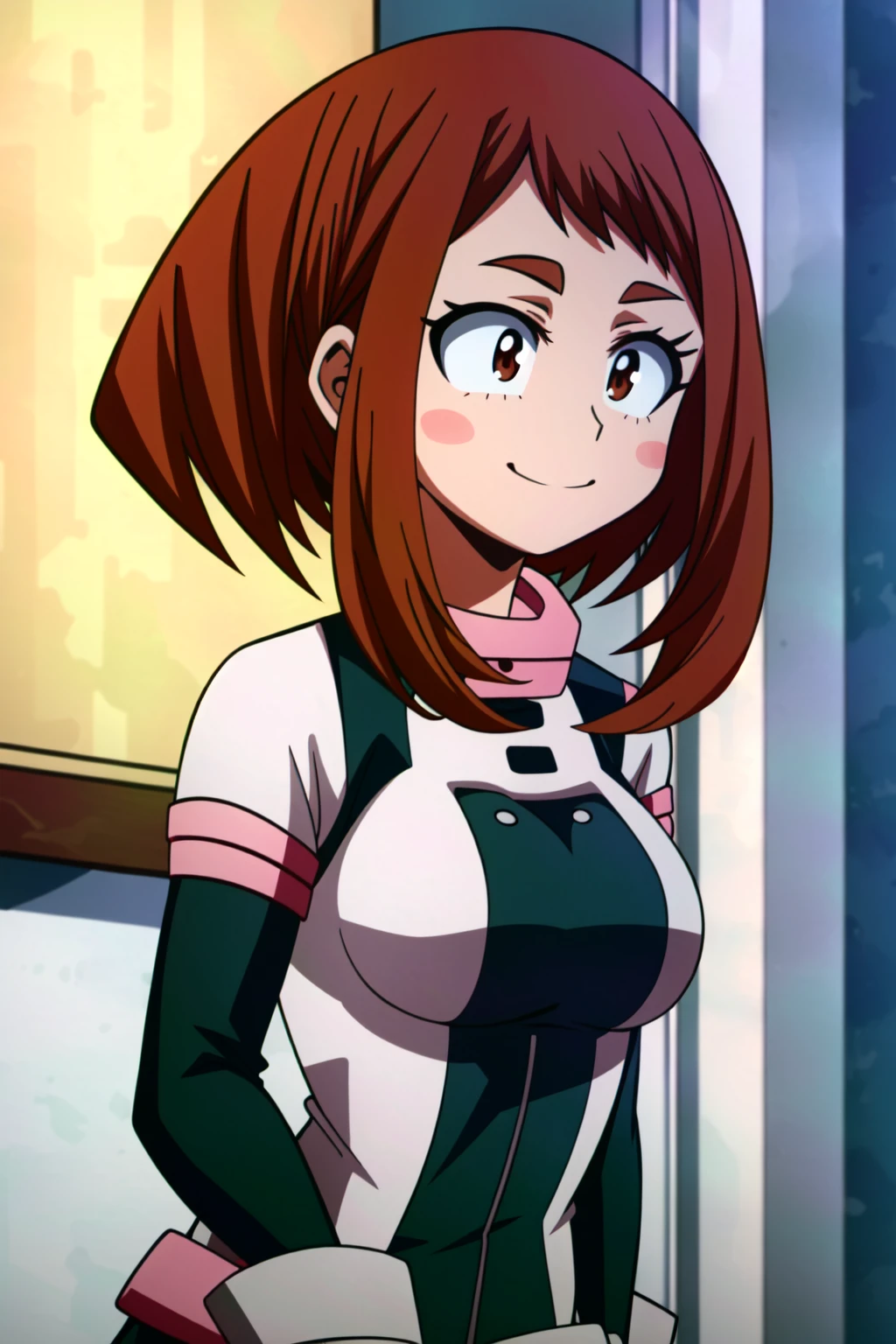 Ochaco Uraraka, 1girl, uraraka ochako, solo, brown hair, brown eyes, blush stickers, short hair, smile, bodysuit, breasts, medium breasts