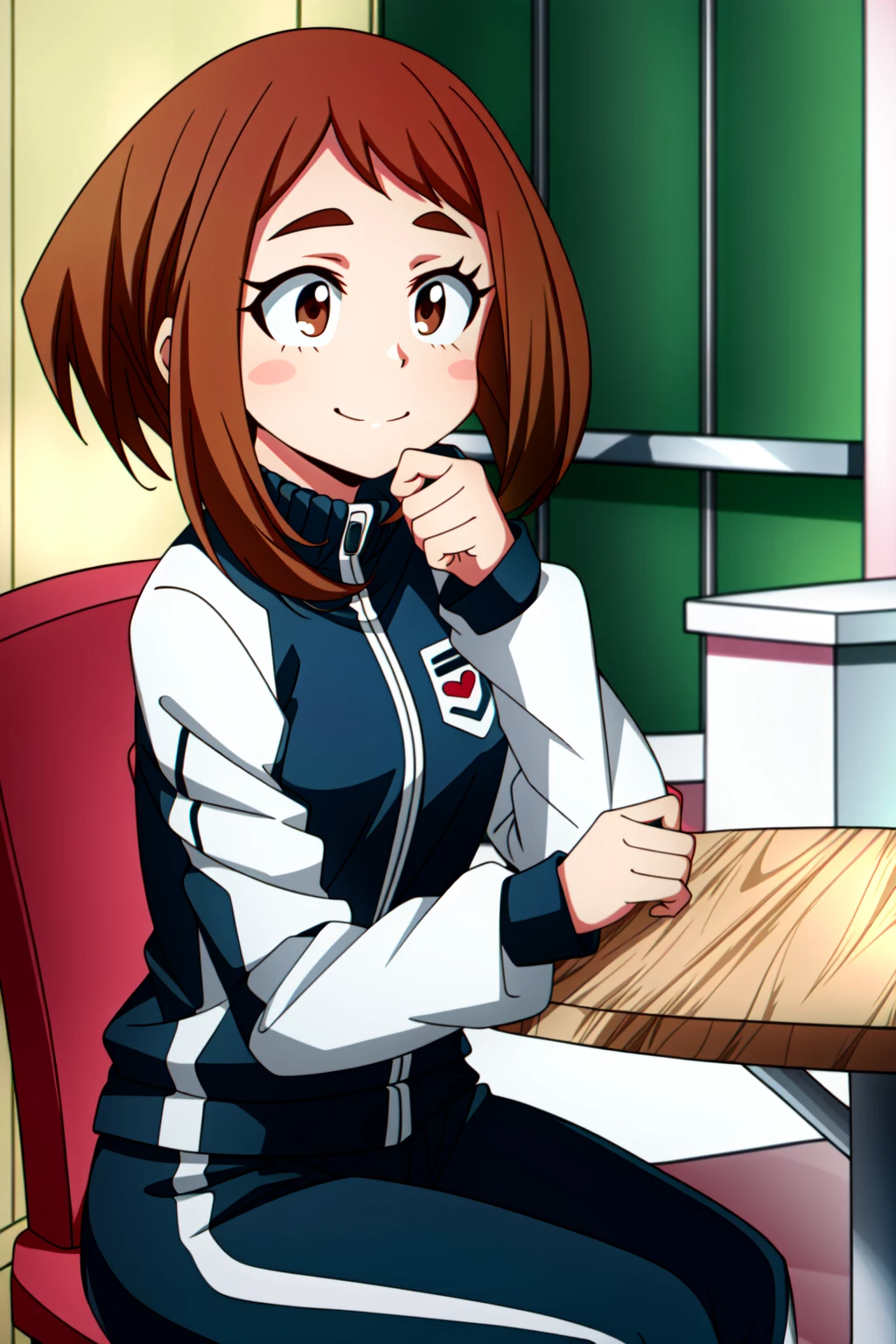 Ochaco Uraraka, uraraka ochako, blush stickers,1girl, solo, brown hair, brown eyes, short hair, tracksuit