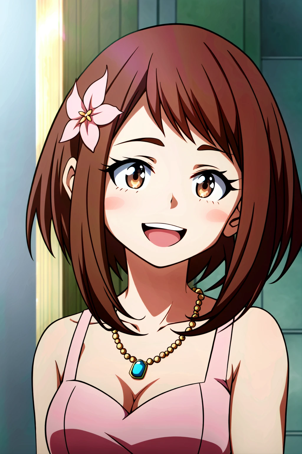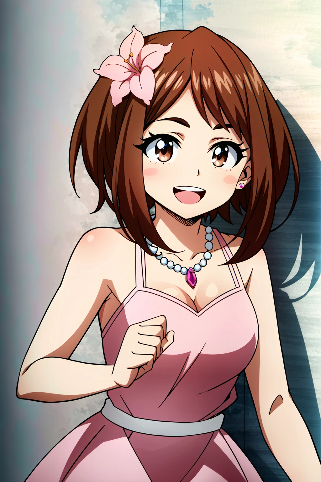 Ochaco Uraraka, 1girl, brown hair, blush stickers, brown eyes, necklace, jewelry, open mouth, smile, solo, short hair, dress, pearl necklace, hair ornament, bare shoulders, collarbone, pink dress, flower, hair flower