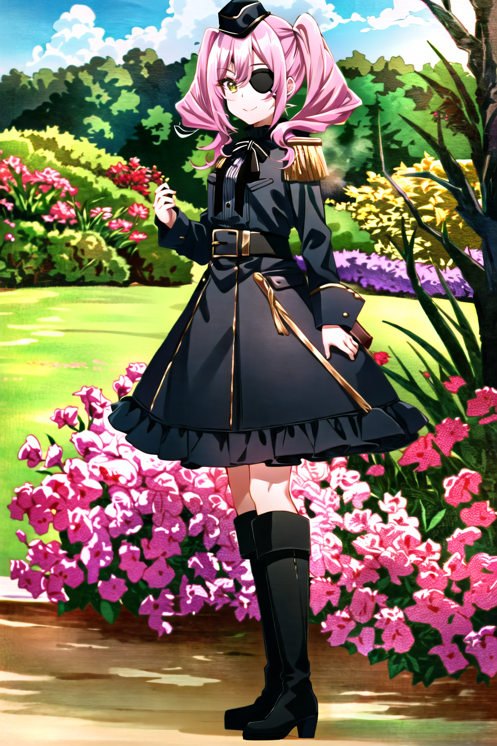 annette (boga), default, twintails, eyepatch, mini hat, black headwear, military uniform, black dress, epaulettes, long sleeves, buttons, frills, black boots