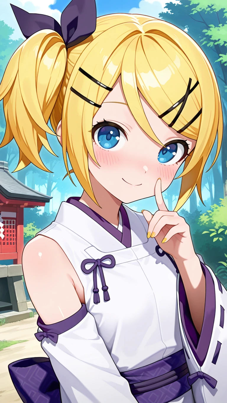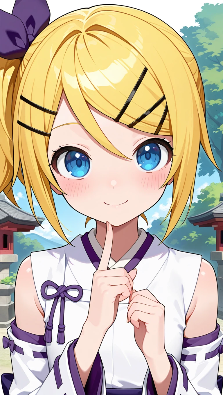 short hair,blonde hair,side ponytail,hair ornament,hairclip,blue eyes