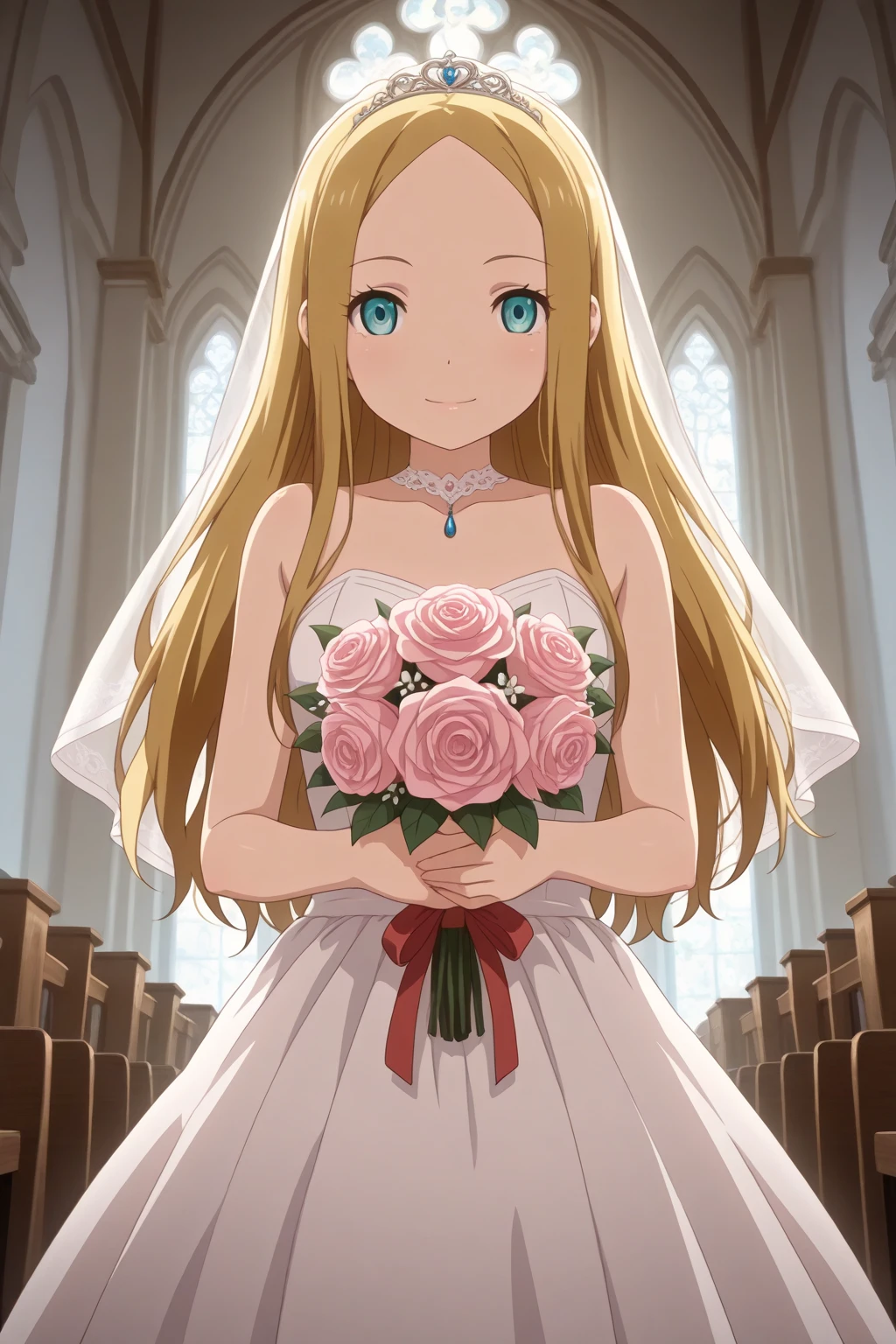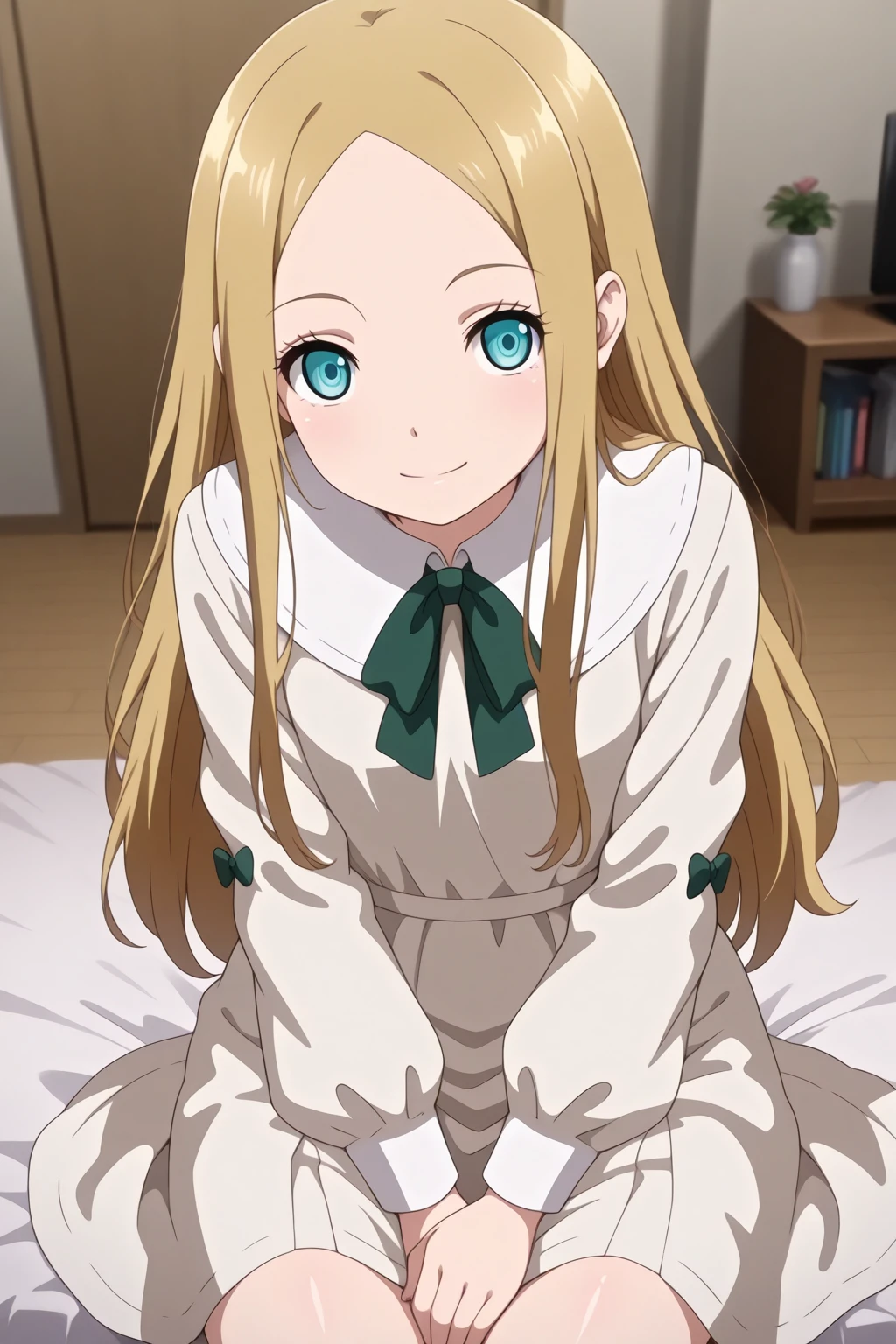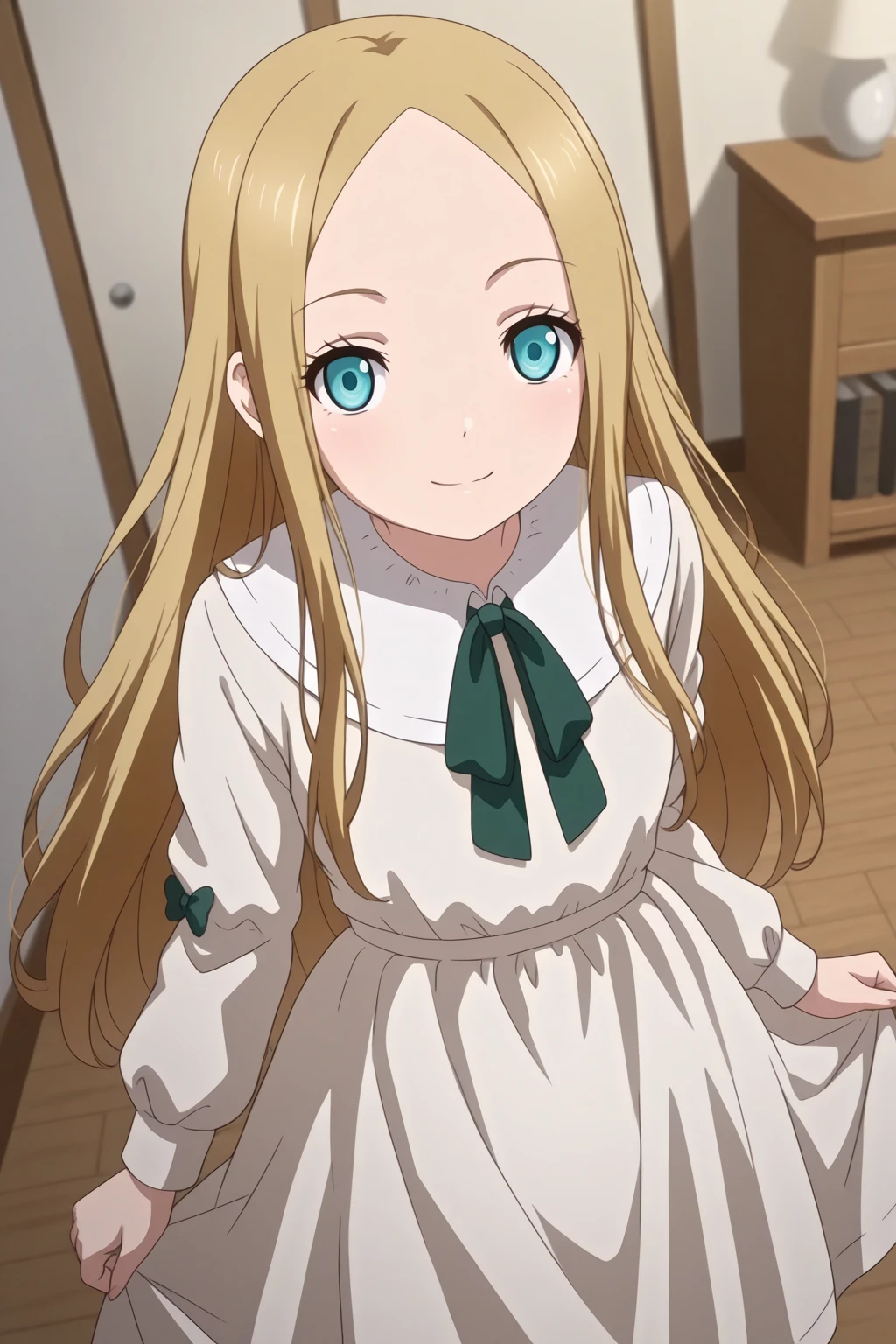 aanina, blue eyes, blonde hair, ninac1, green neck ibbon, white dress, green bow,