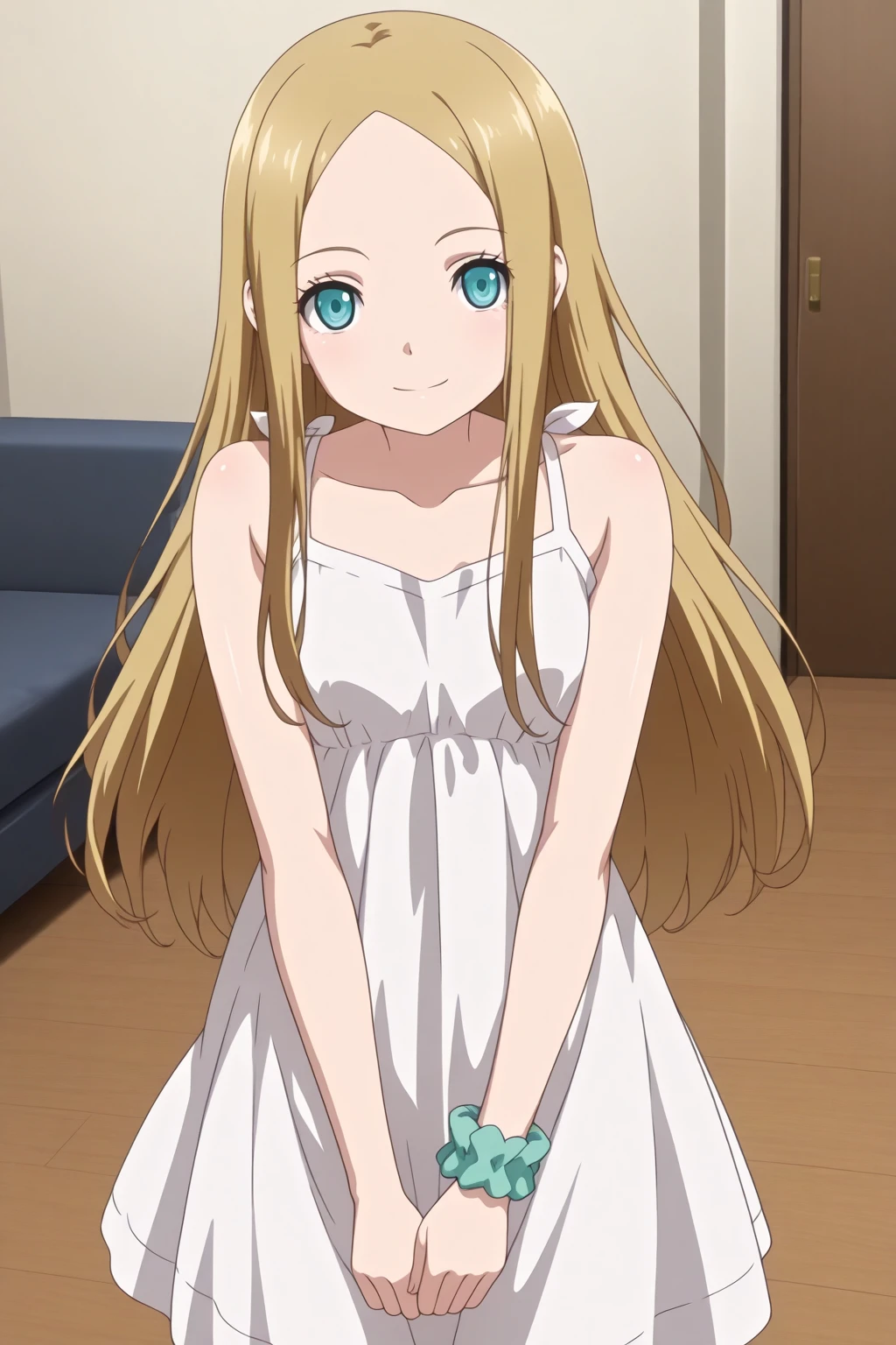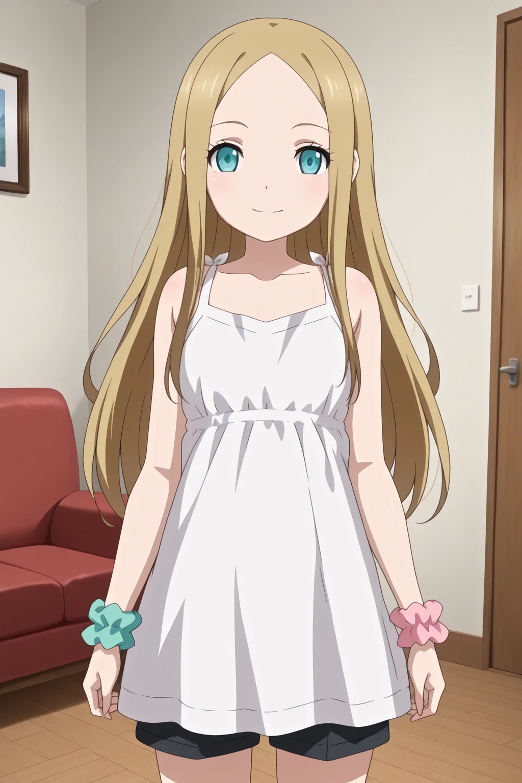 aanina, blue eyes, blonde hair, ninac2, white sundress, sleeveless dress, wrist scrunchie, black shorts,Description