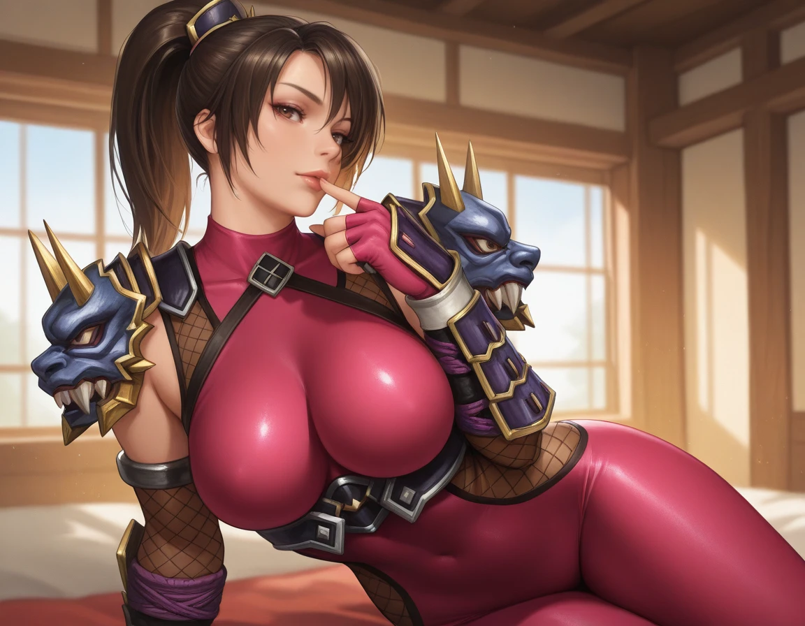 1girl, taki \(soulcalibur\), ponytail, brown eyes, large breasts, armor, ninja, bodysuit, gloves