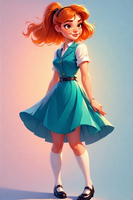 Amber, orange hair, black hairband, short hair, ponytail, bangs, black eyes, freckles, teal vest, white shirt, short sleeves, teal skirt, white socks, black belt, black mary janes