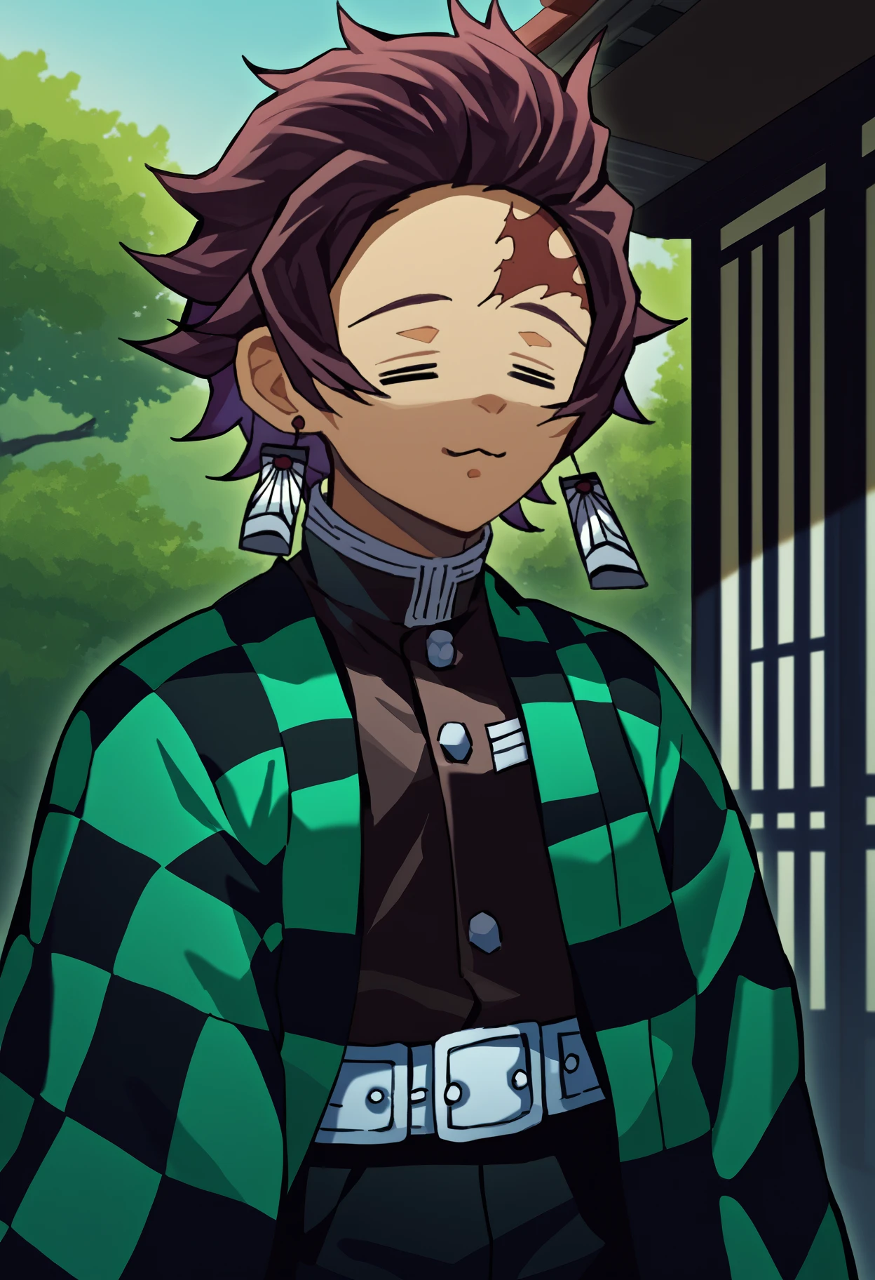 Default Outfit: demon slayer uniform, japanese clothes, checkered clothes, haori, black jacket, long sleeves, black pants, white belt, earrings