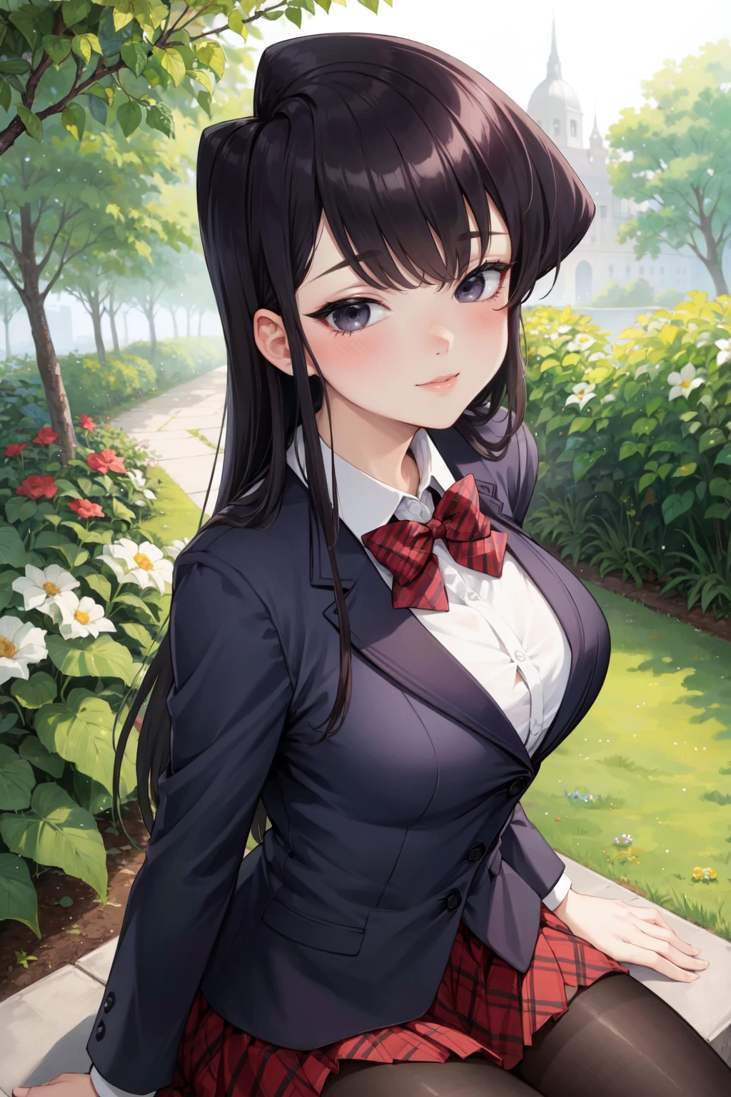 komi_shouko, long hair, shirt, large breasts, white shirt, school uniform, long sleeves, skirt, bow, bowtie, pantyhose, jacket, black pantyhose, collared shirt