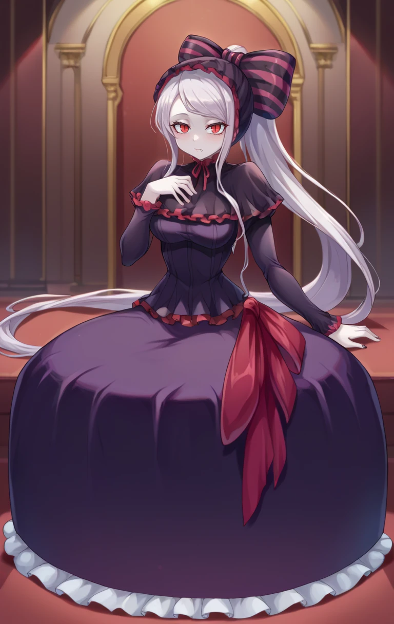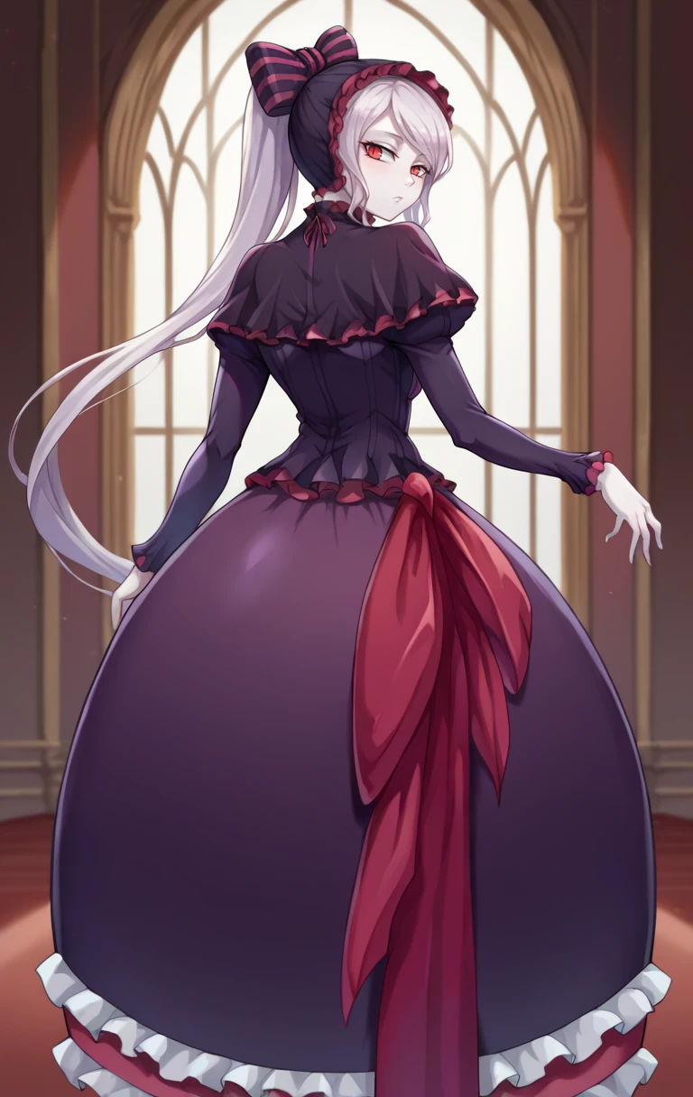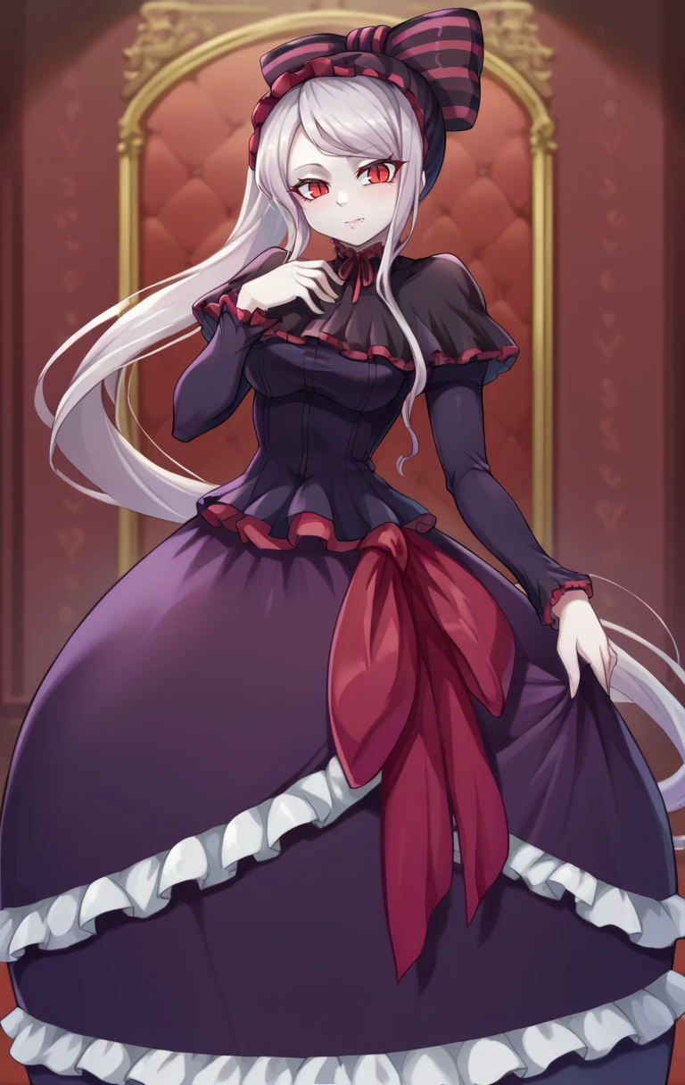 shalltearbloodfallenSDXL,1girl,long hair,red eyes,dress,bow,very long hair,ponytail,hair bow,frills,striped,frilled dress,pale skin,lolita fashion,striped bow,long dress,gothic lolita,vampire