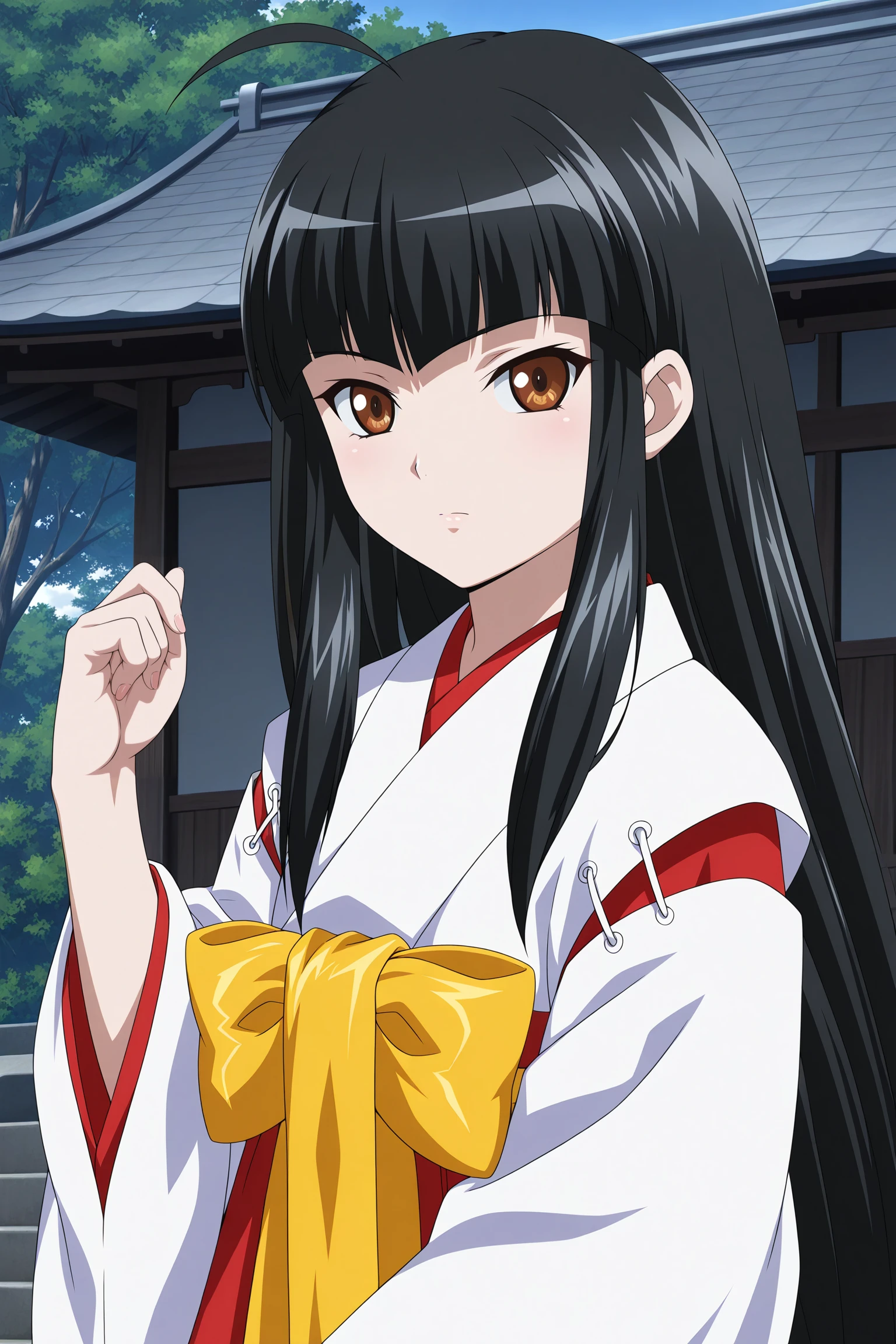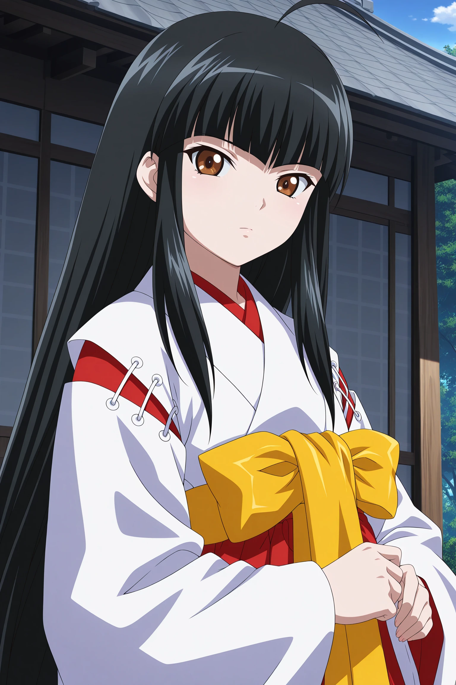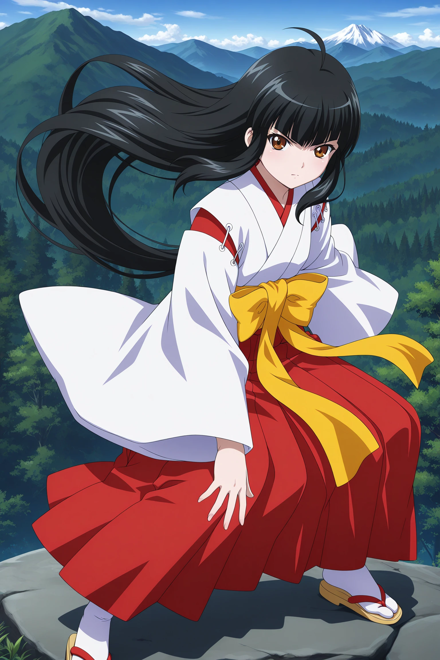 choushou shifu, long hair, black hair, red ribbon, low-tied long hair, ahoge, sidelocks, v-bangs, brown eyes, miko, long sleeves, wide sleeves, kosode, yellow bow, waist bow, red skirt, hakama skirt, tabi, zouri