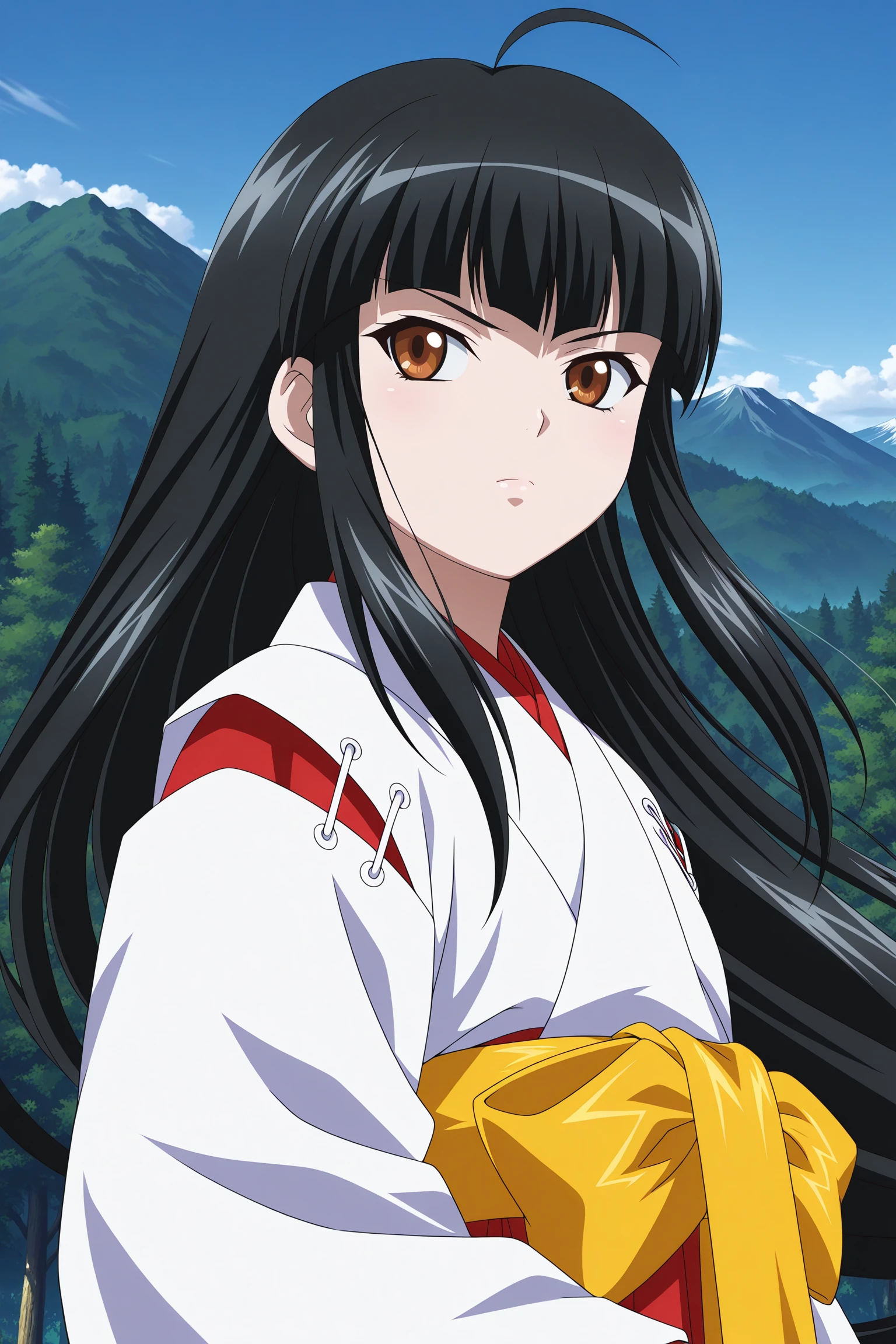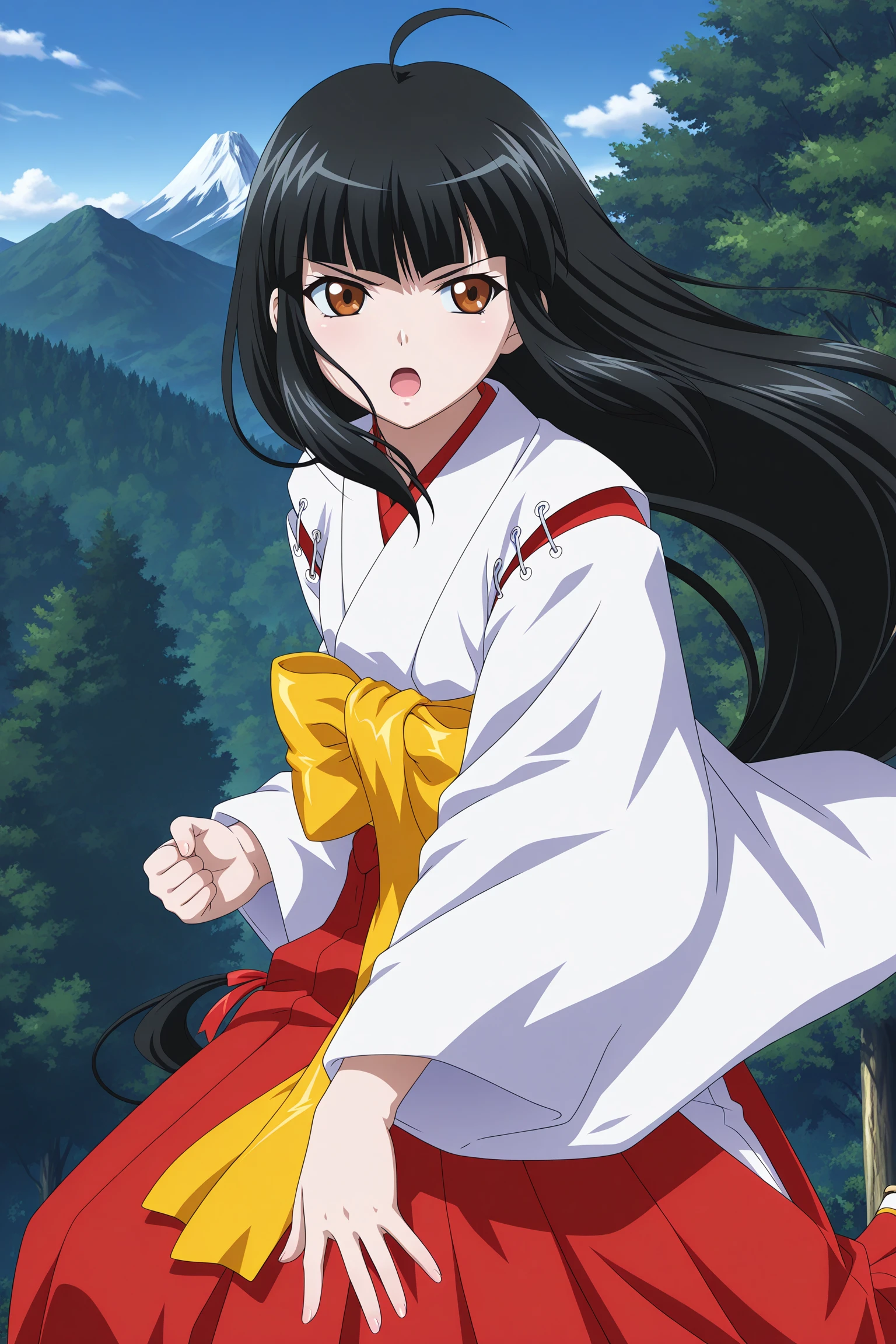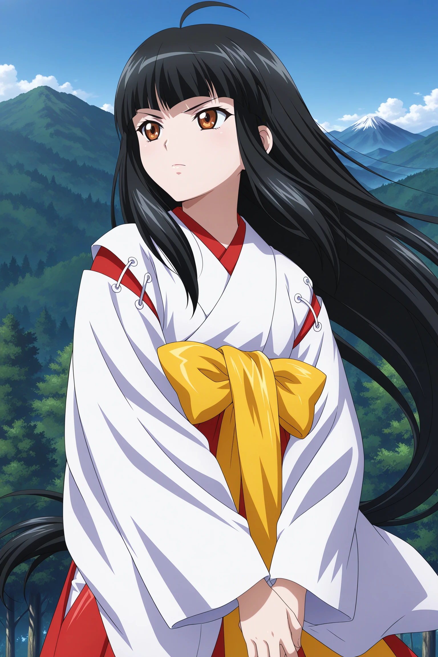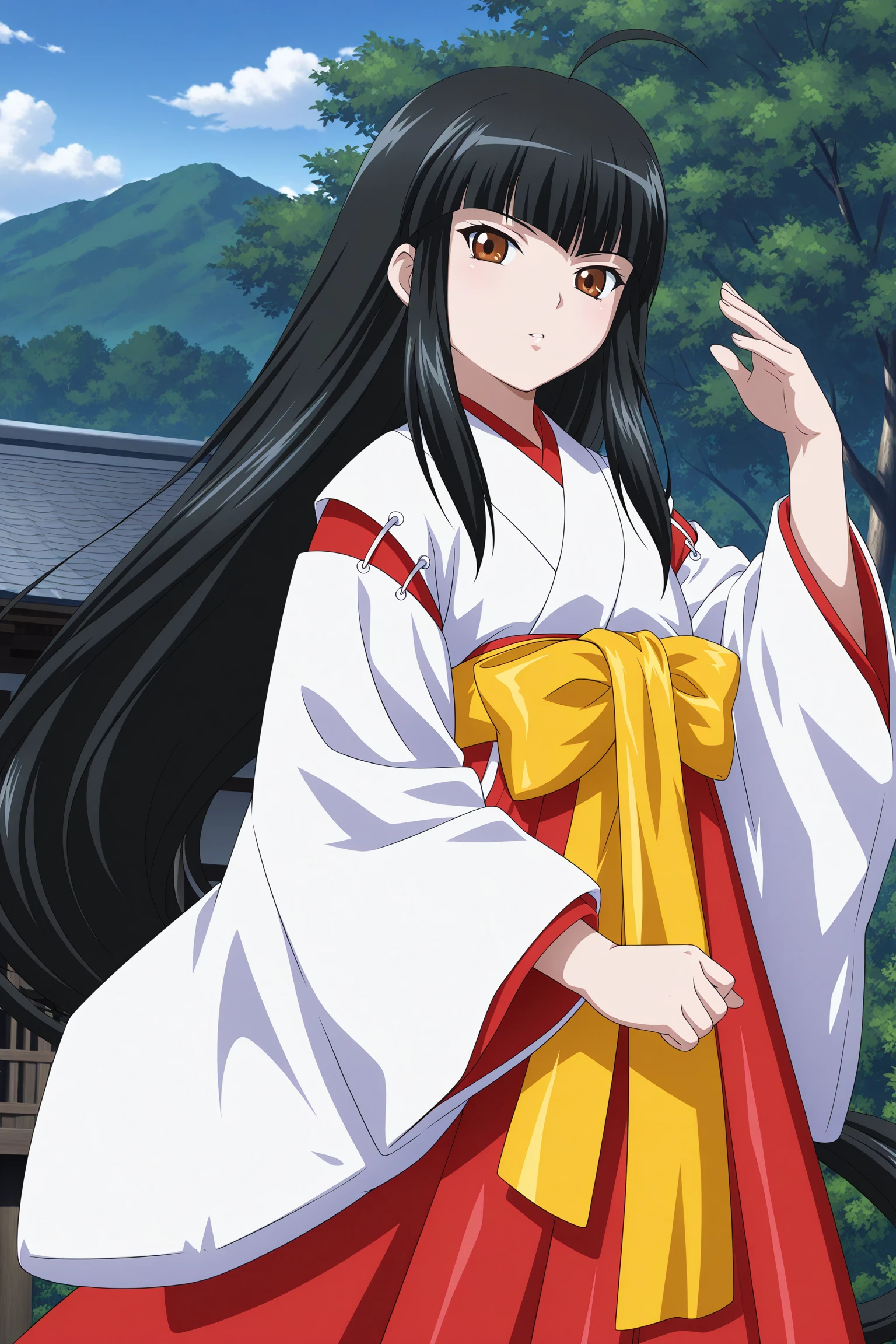 choushou shifu, long hair, black hair, red ribbon, low-tied long hair, ahoge, sidelocks, v-bangs, brown eyes, miko, long sleeves, wide sleeves, kosode, yellow bow, waist bow, red skirt, hakama skirt, tabi, zouri