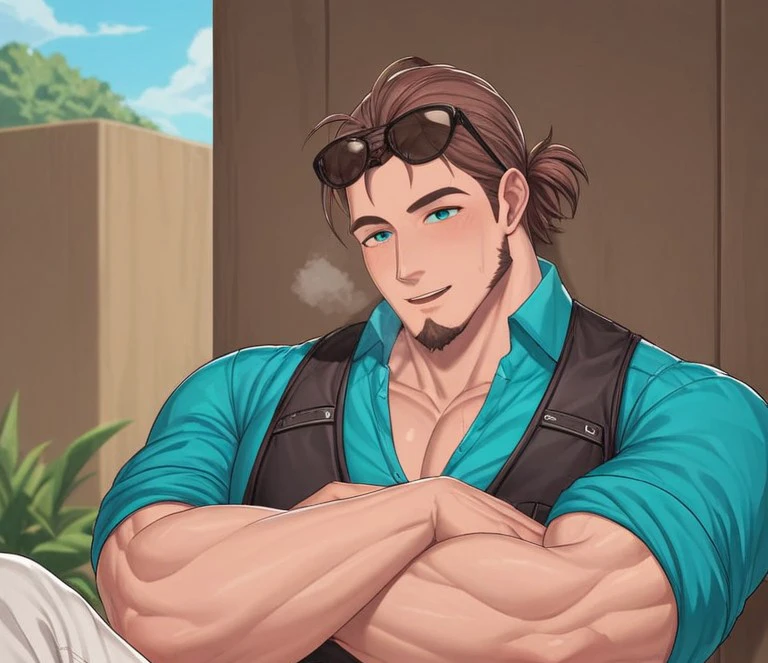 Bonnivier,male,thick body,brown hair,short ponytail,turquoise eyes,beard,mature man,turquoise shirt,black casual vest,white pants