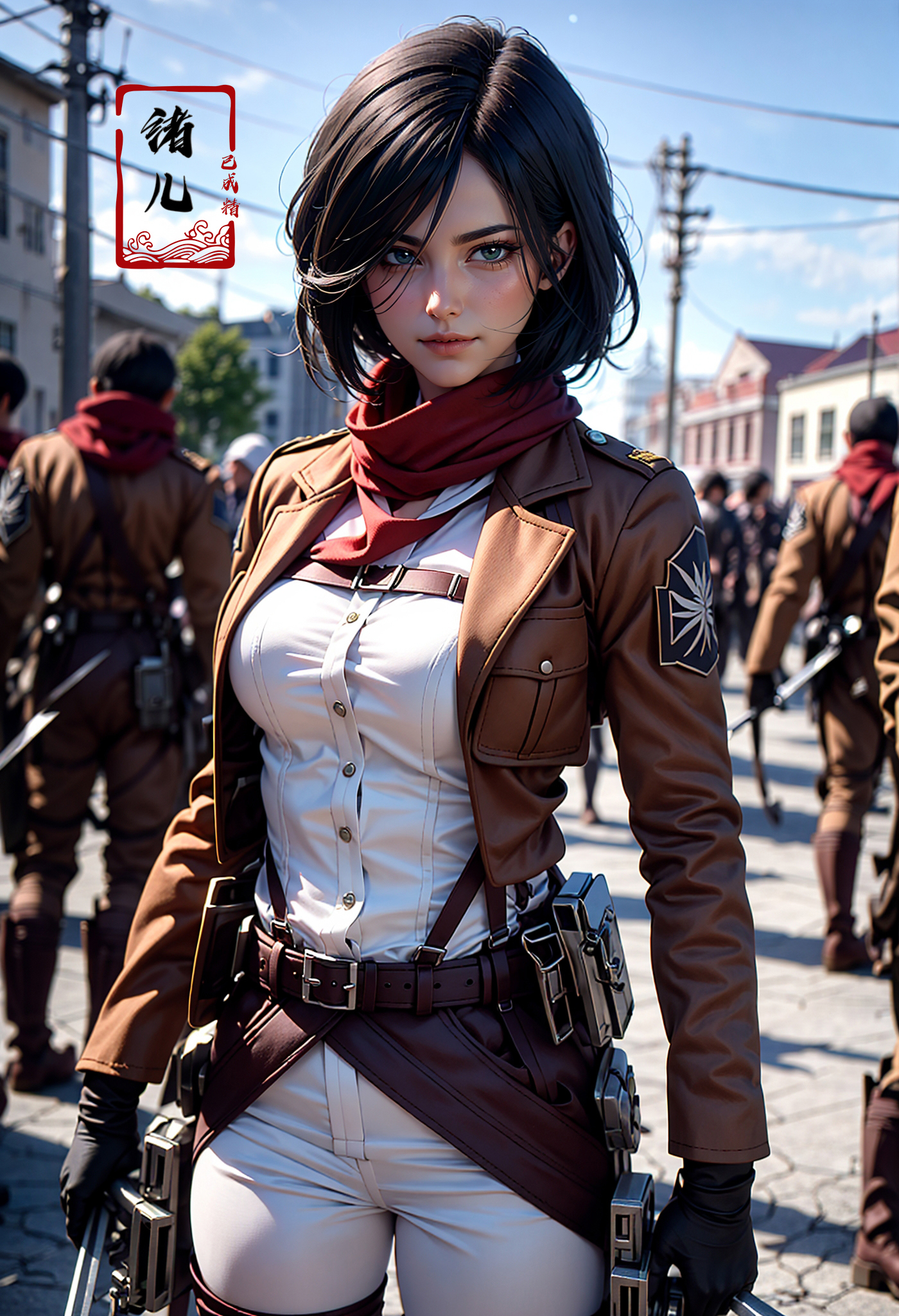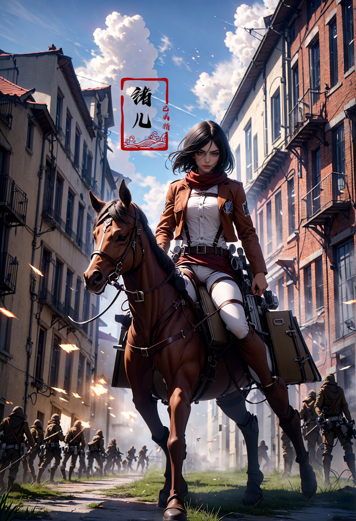 This is a Mikasa LORA, enhanced training of three-dimensional maneuvering action, three-dimensional maneuvering equipment, added giant background [optional]