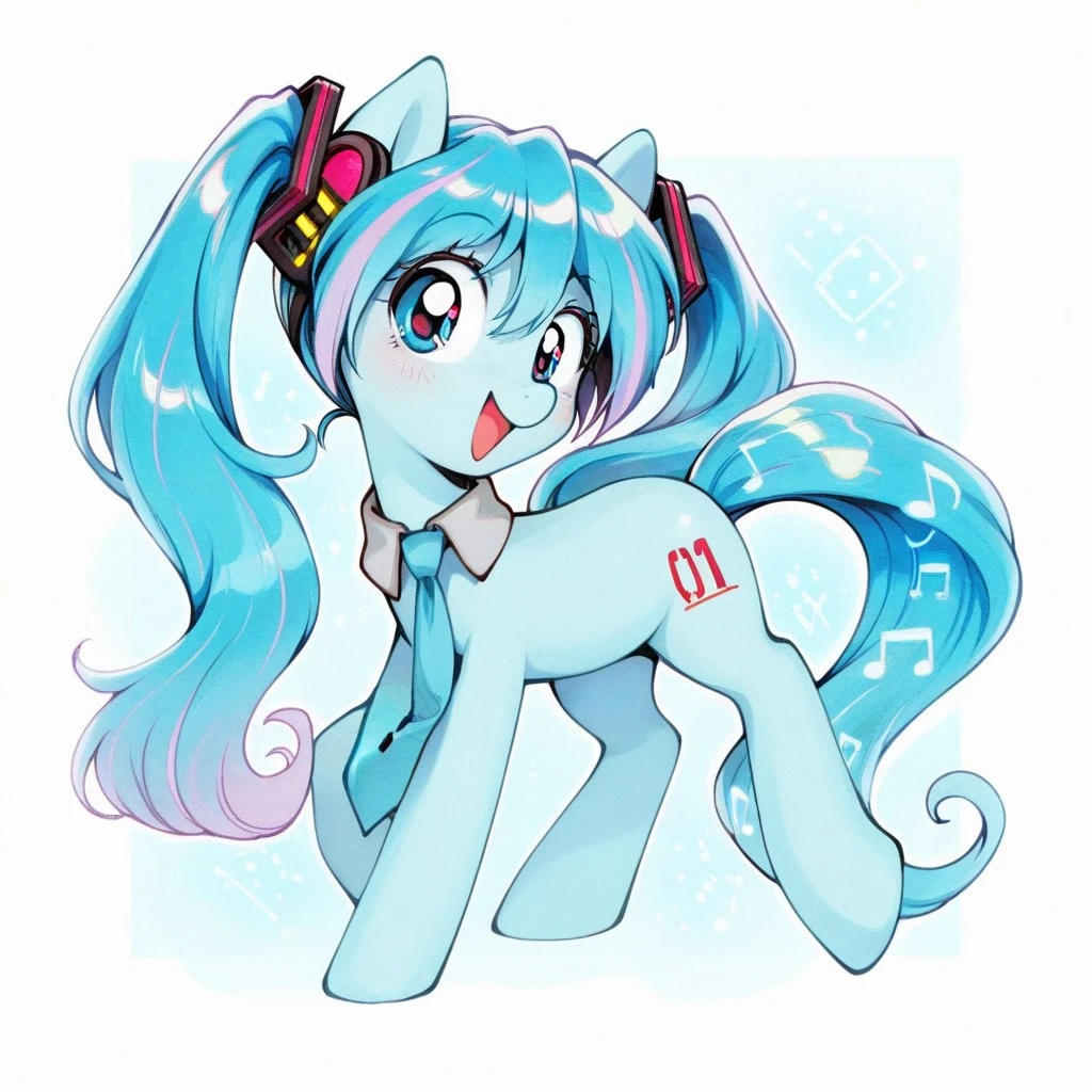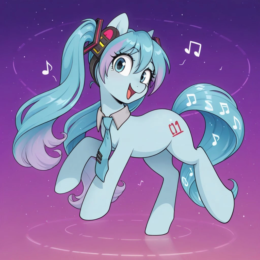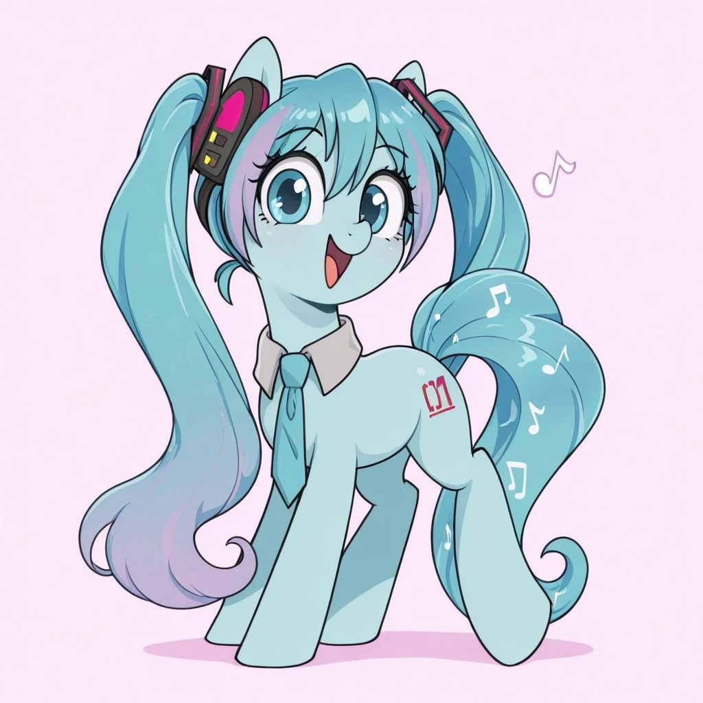 bishoujoponymiku, pony, hatsune miku, blue eyes, blue body, blue hair, long hair, twintails, music notes, necktie, headphones