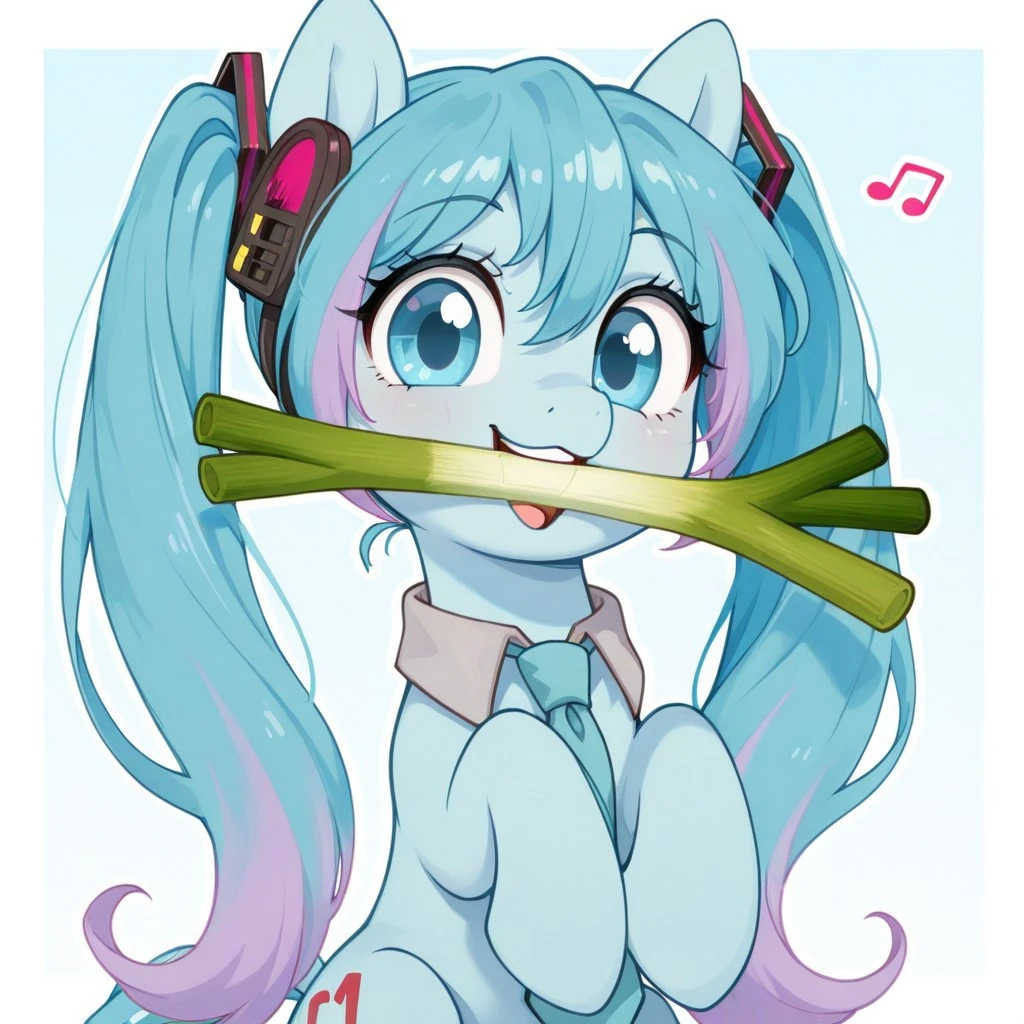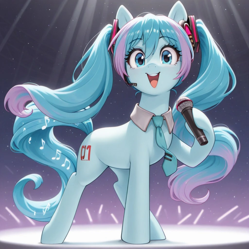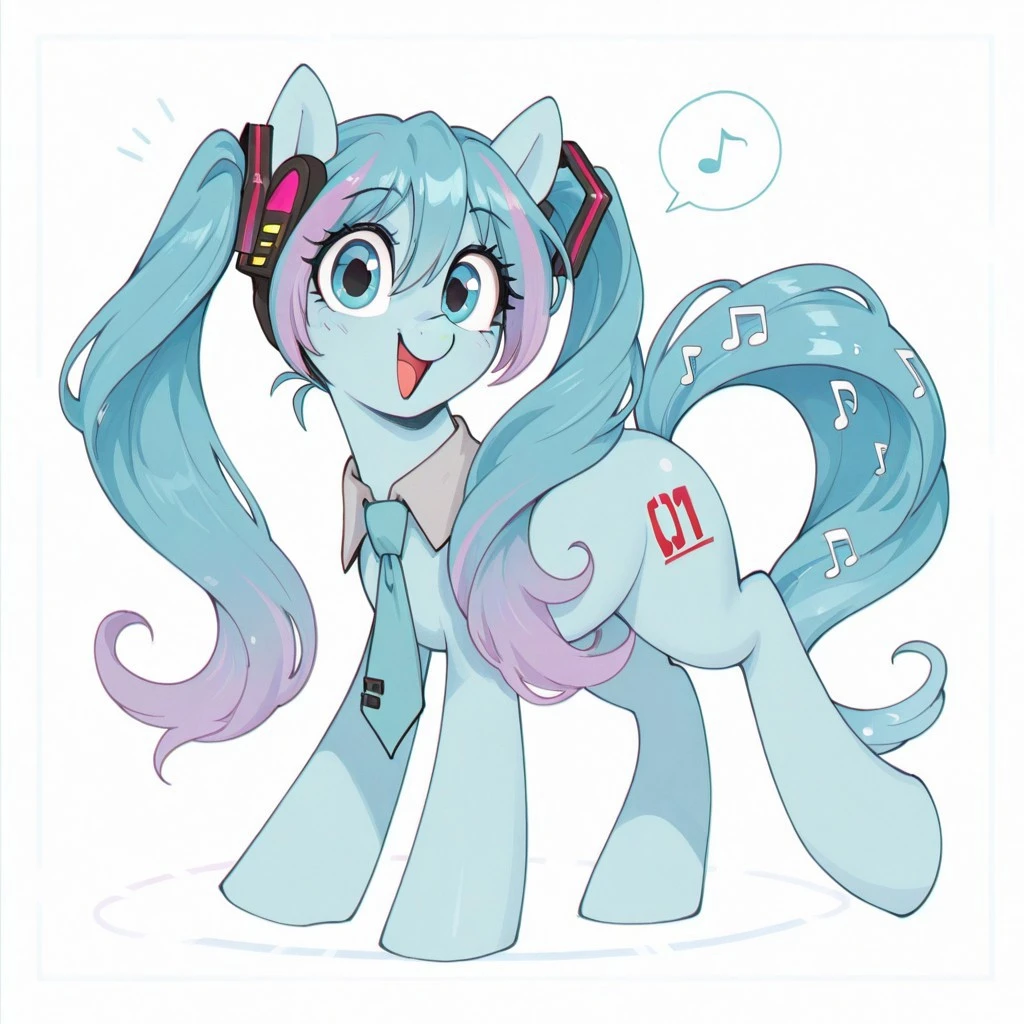 bishoujoponymiku, pony, hatsune miku, blue eyes, blue body, blue hair, long hair, twintails, music notes, necktie, headphones