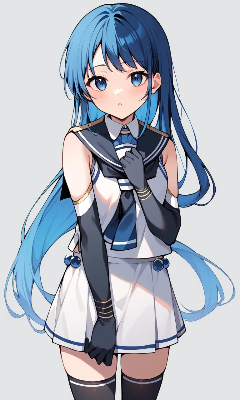 samidareKC,blue hair, long hair, flat cheast, school uniform,serafuku, black gloves, elbow gloves, black thighhighs,sailor collar, neckerchief, sleeveless shirt, white skirt, swept bangs