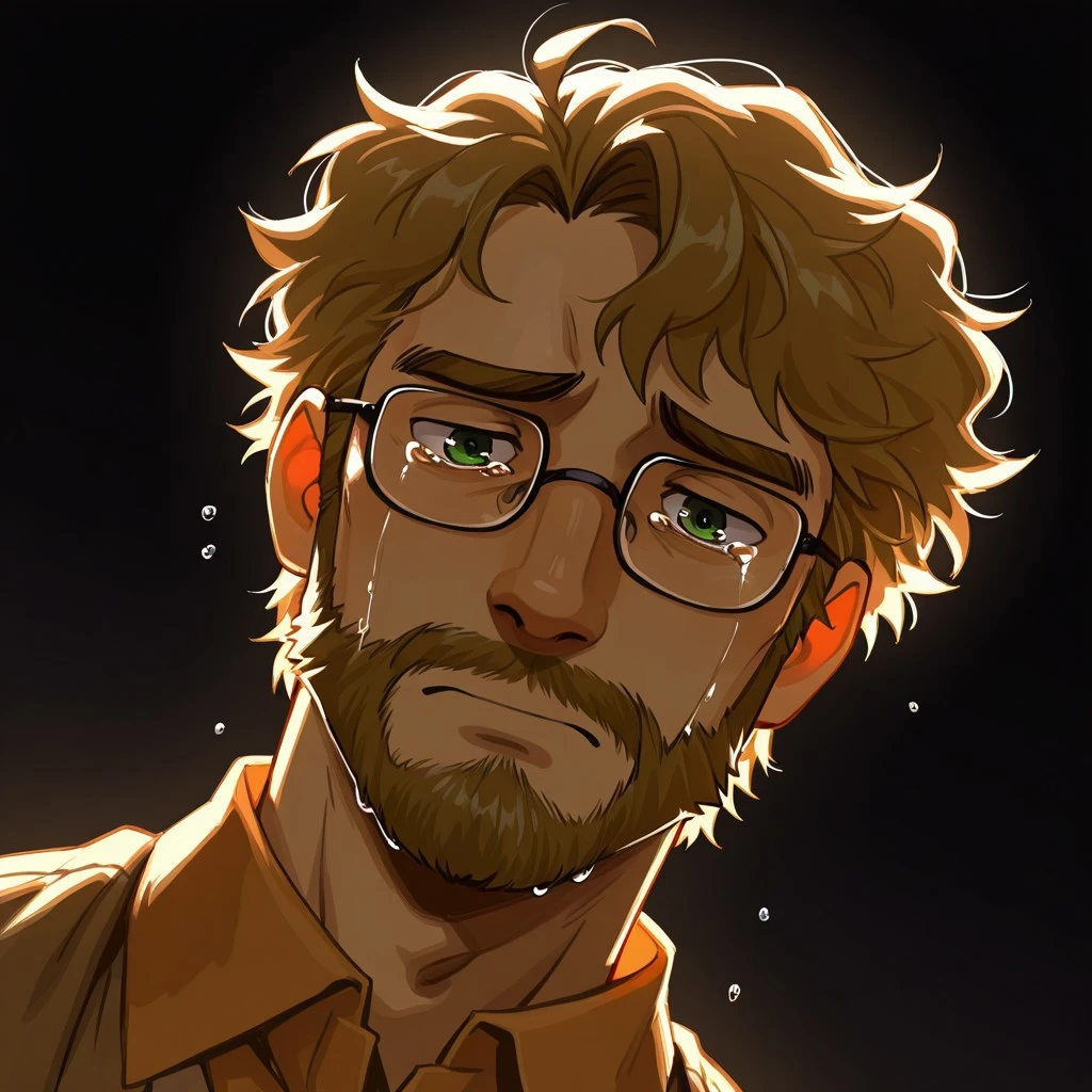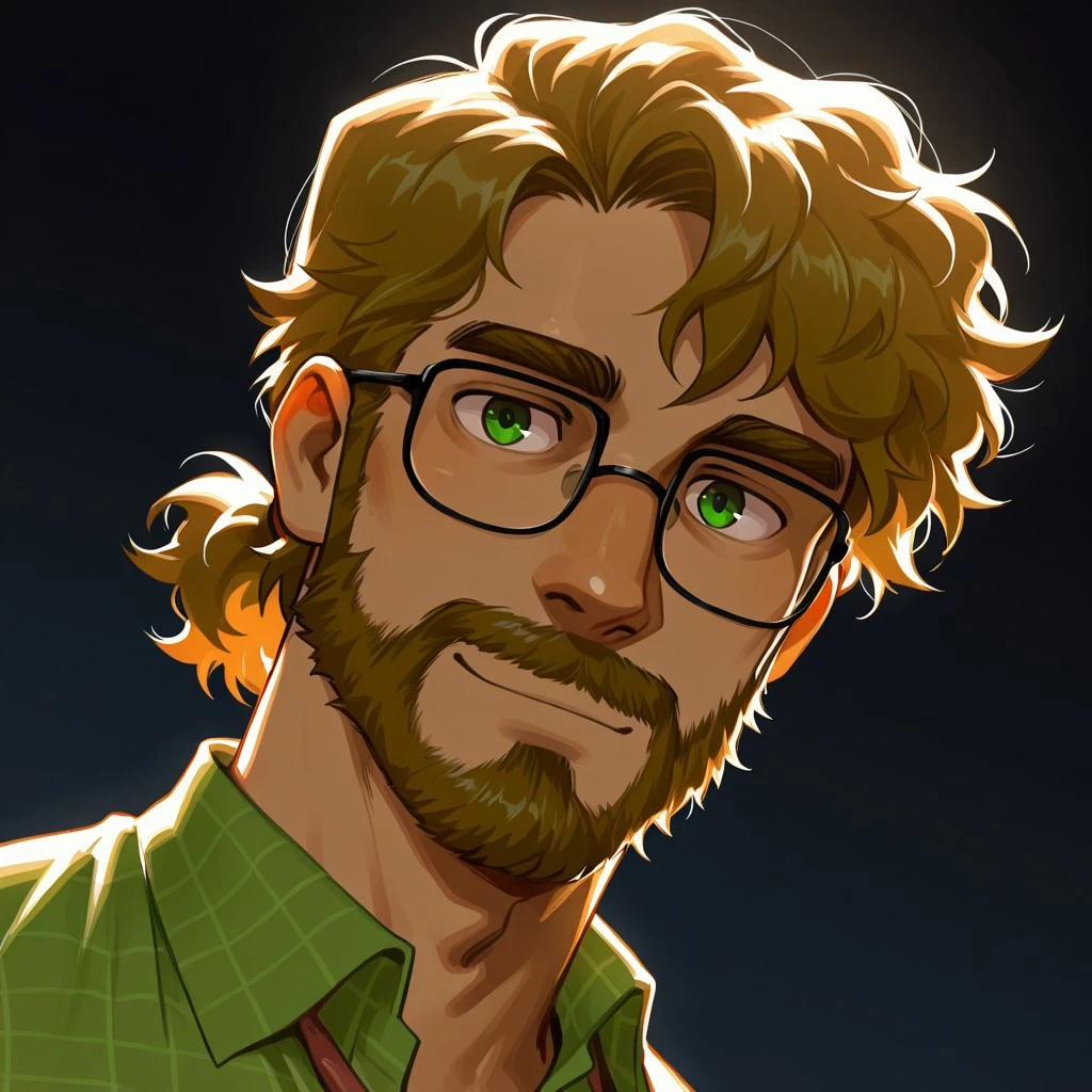 HenryFNAF, light brown hair, fluffy hair, green eyes, beard, glasses, hairy, chubby, male