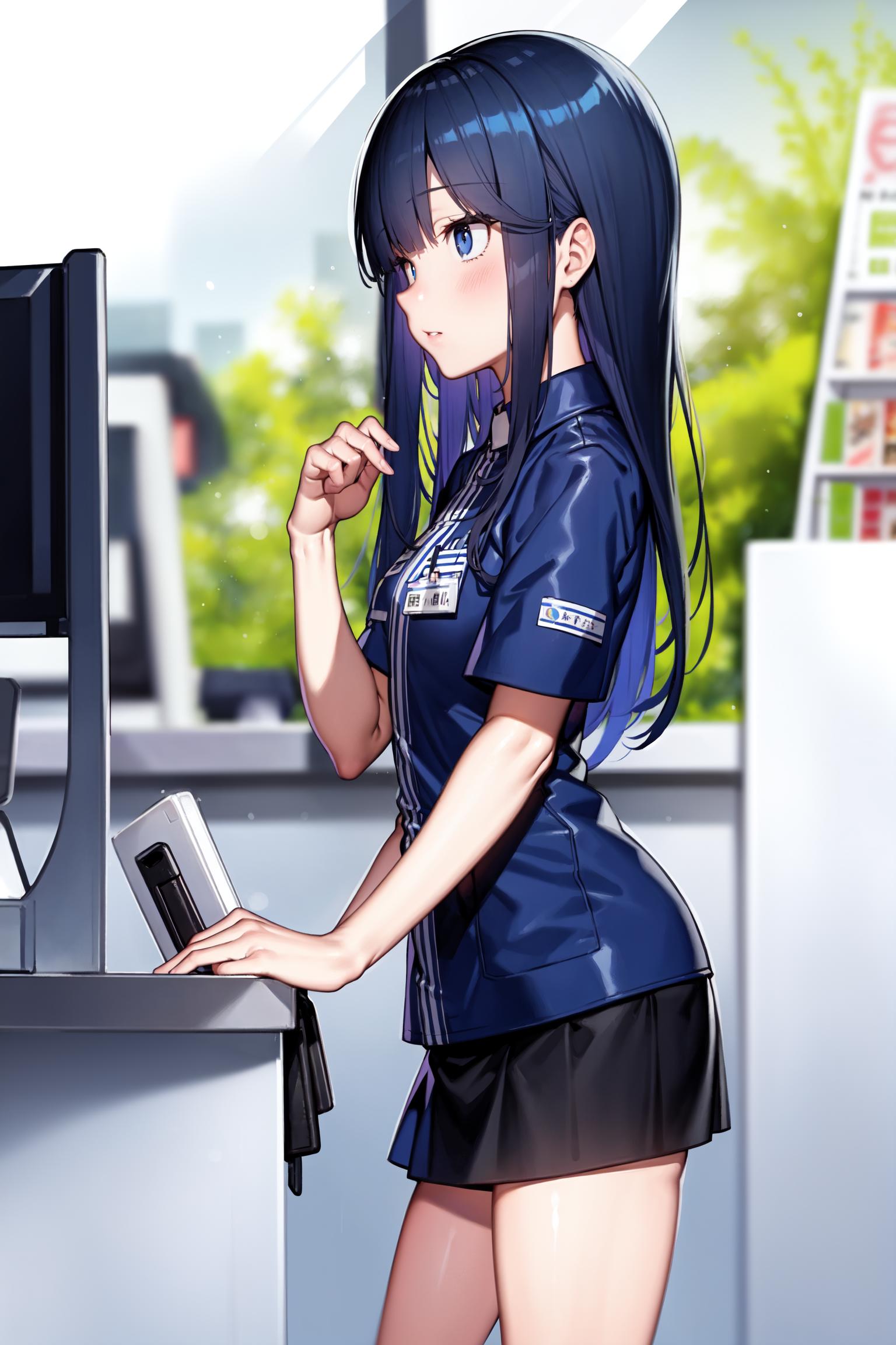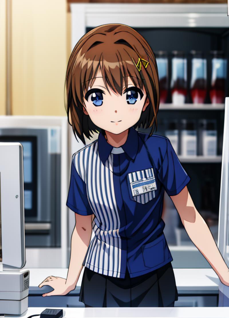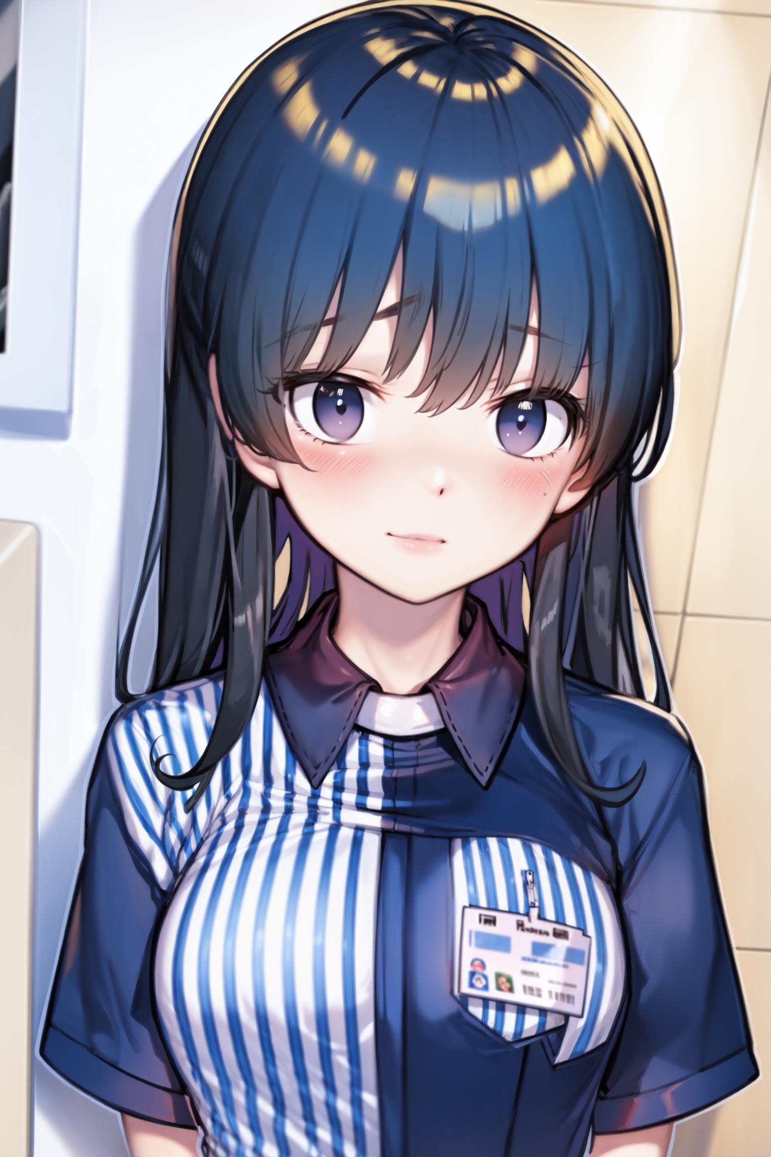 lawson uniform, 1girl, solo, employee uniform, uniform, shirt, name tag, short sleeves, striped shirt, striped, vertical-striped shirt, blue shirt, vertical stripes, alternate costume, id card,
