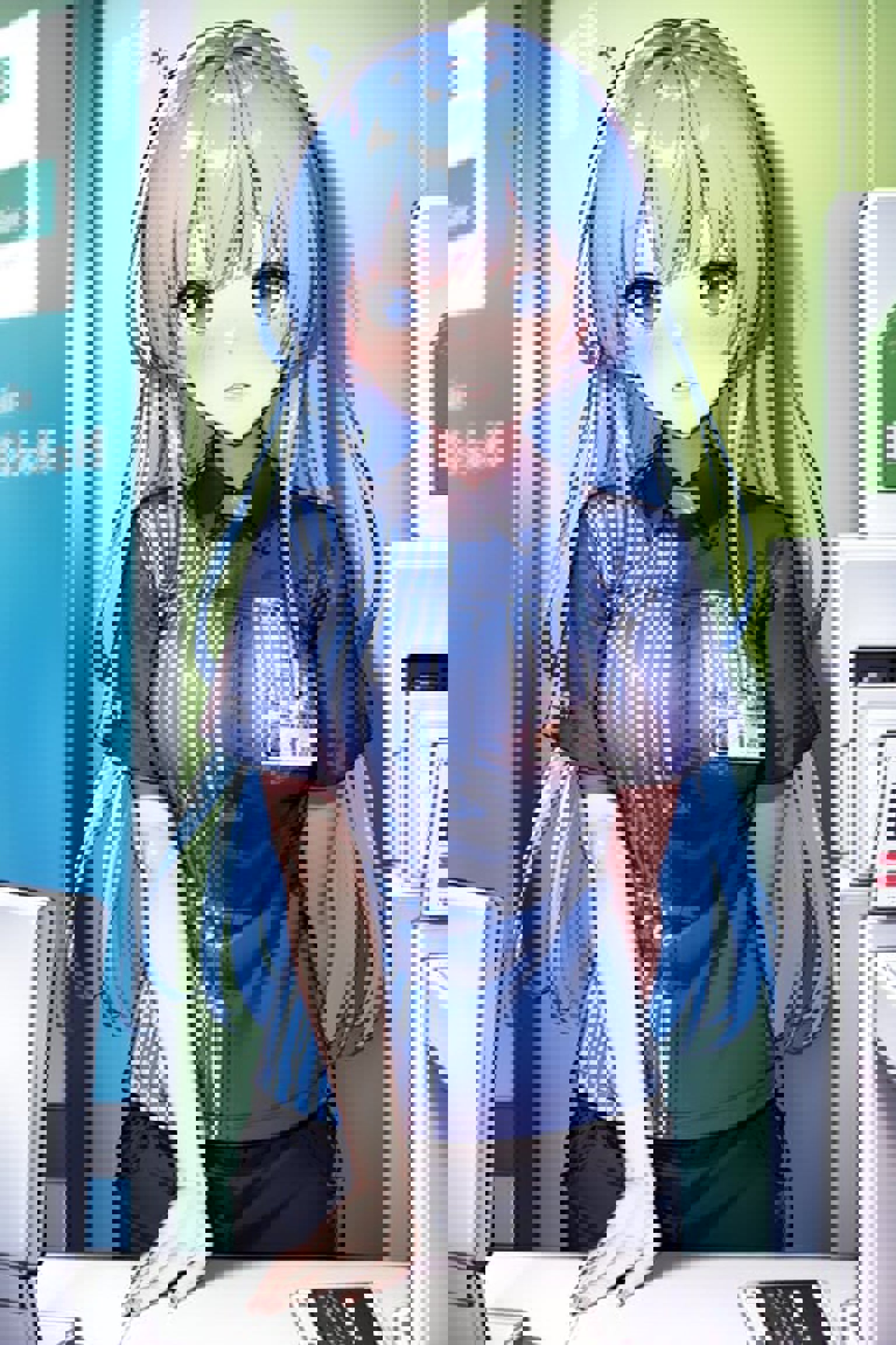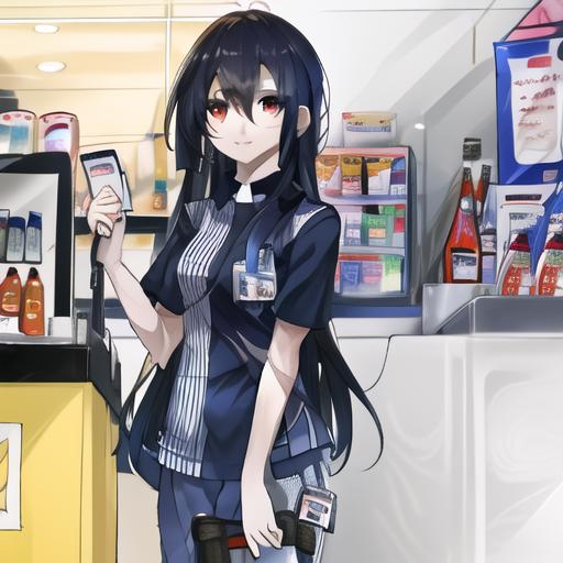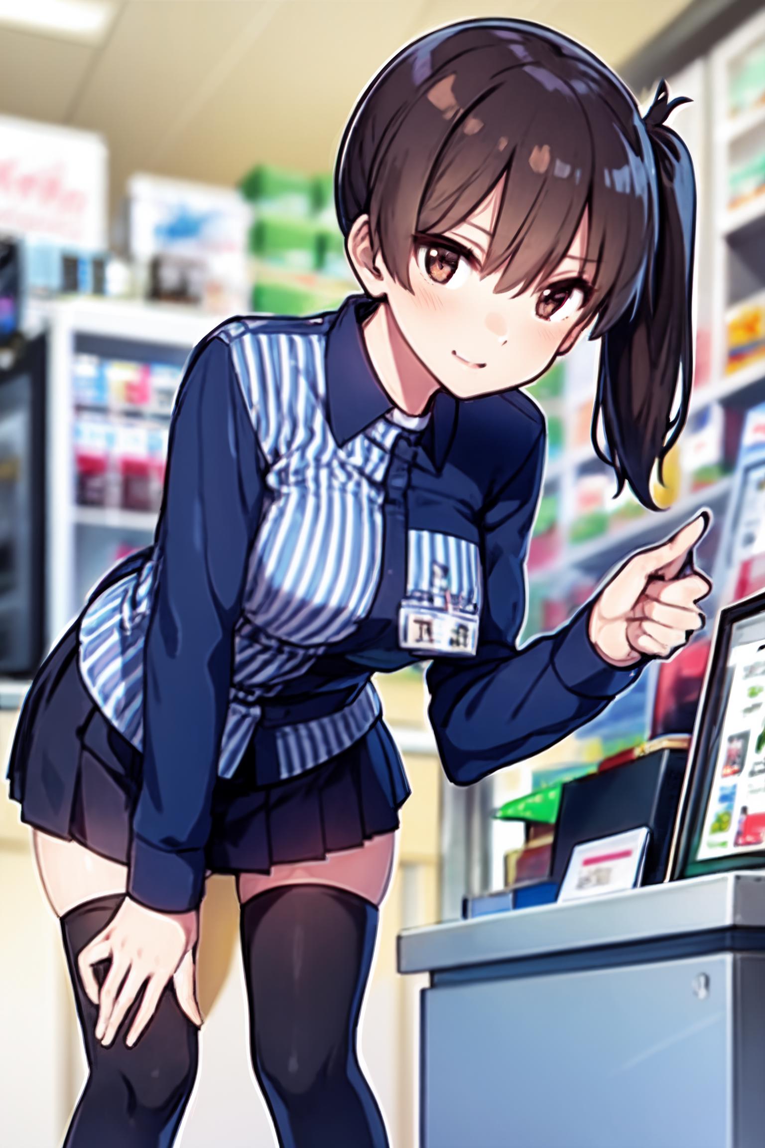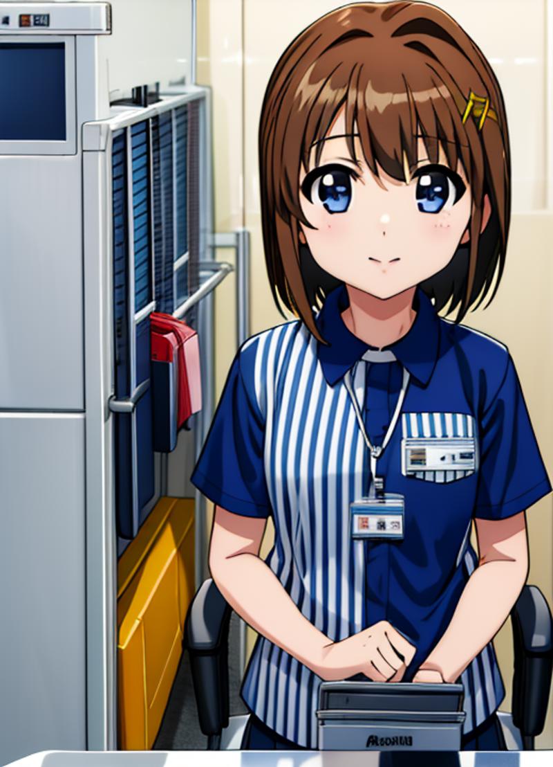 lawson uniform, 1girl, solo, employee uniform, uniform, shirt, name tag, short sleeves, striped shirt, striped, vertical-striped shirt, blue shirt, vertical stripes, alternate costume, id card,
