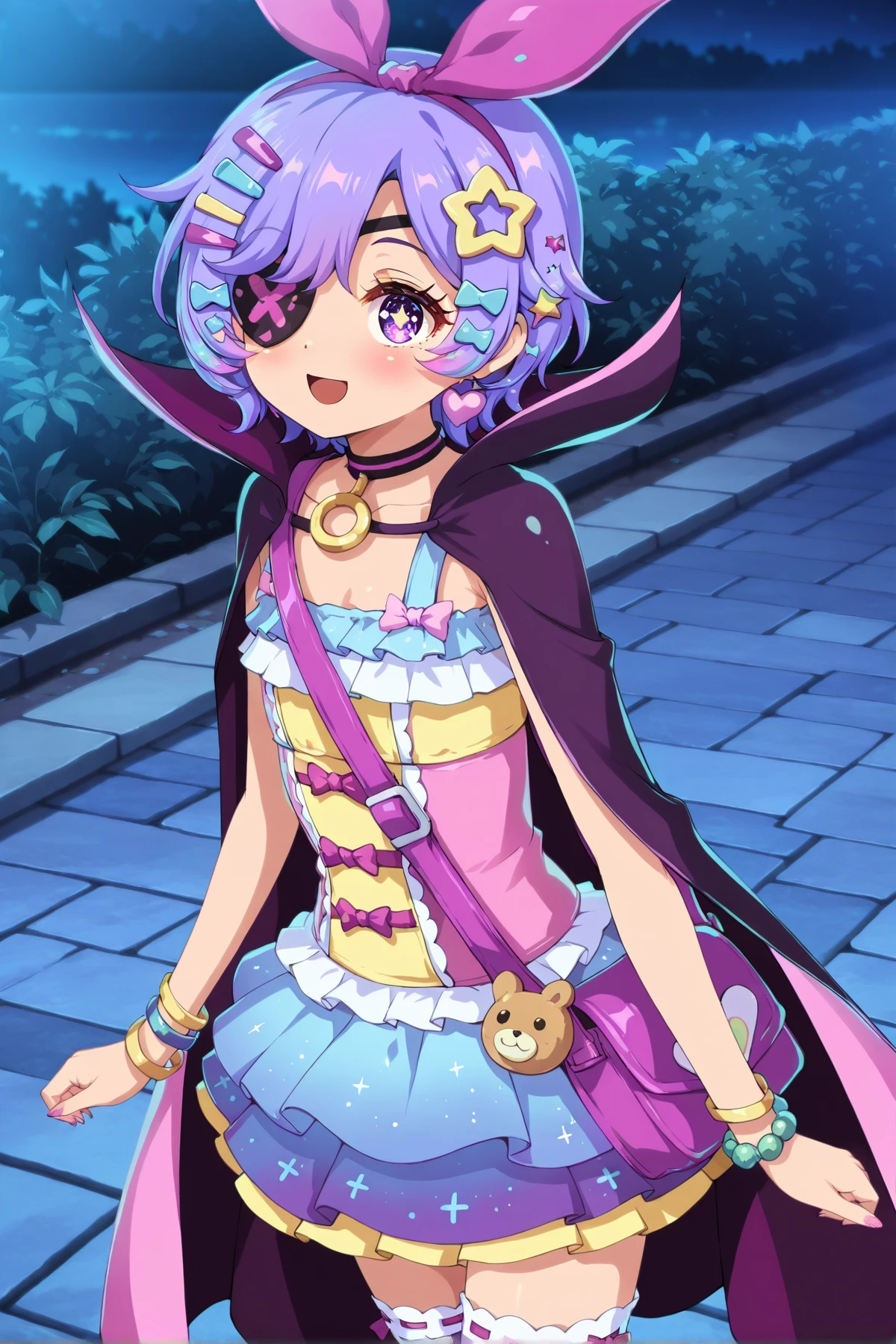 purple eyes, cross in eyes, eyepatch, short hair, purple hair, hair clips, hair ornament, hairbow, collar, flat chest, collared cape, multicolored dress, bracelets, strip thighhighs, pink shoes