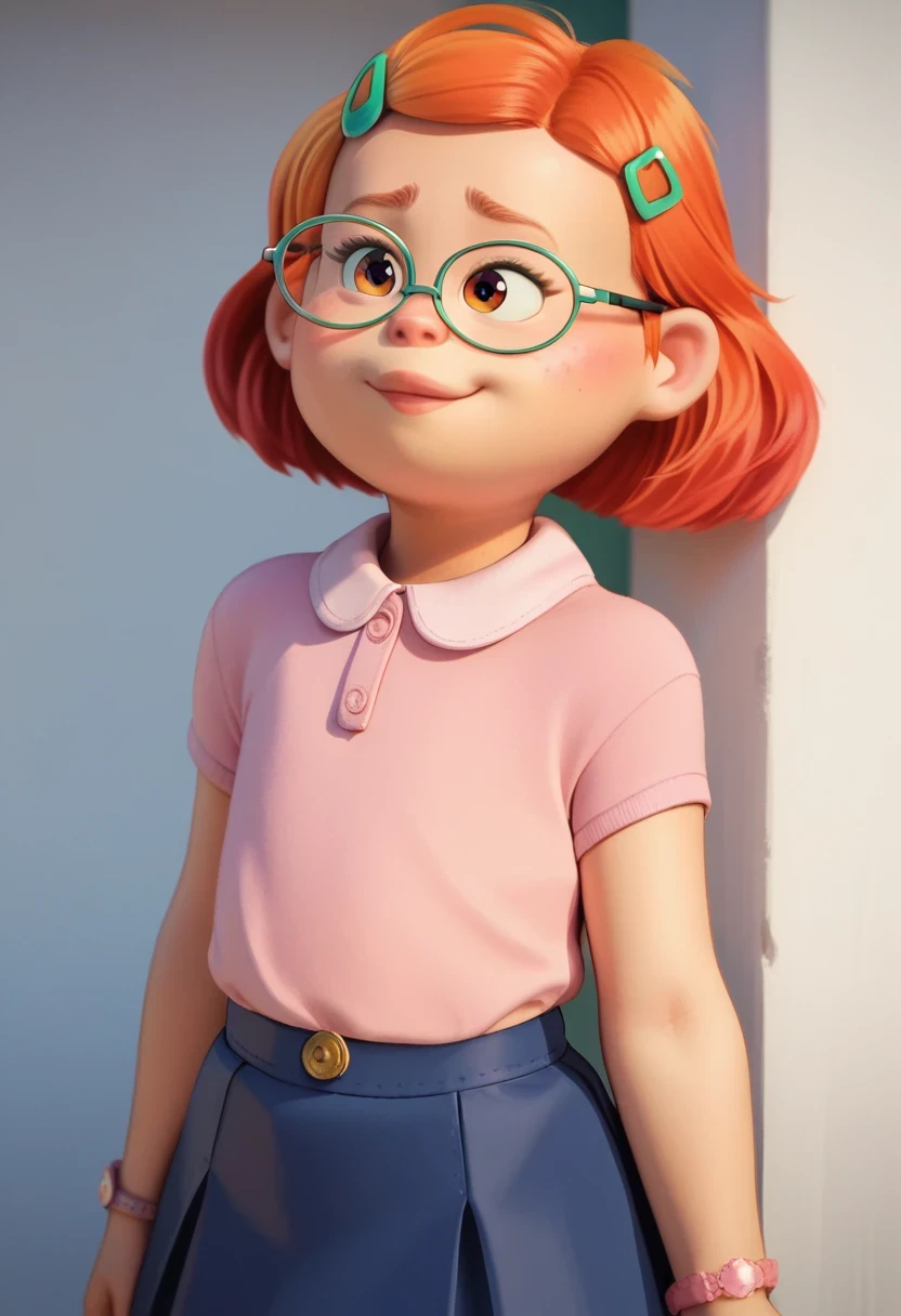 meilin lee, pink shirt, blue skirt, green hairclips, glasses, orange hair