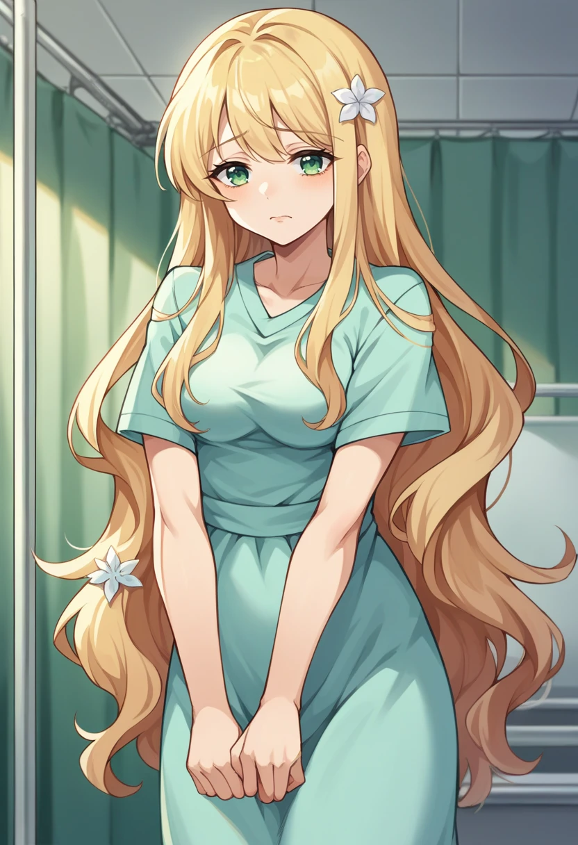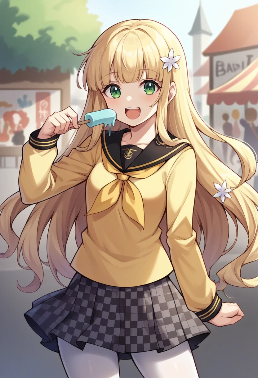 reipq, very long hair, blonde hair, hair flower, green eyes, yellow serafuku, grey skirt, houndstooth, white pantyhose