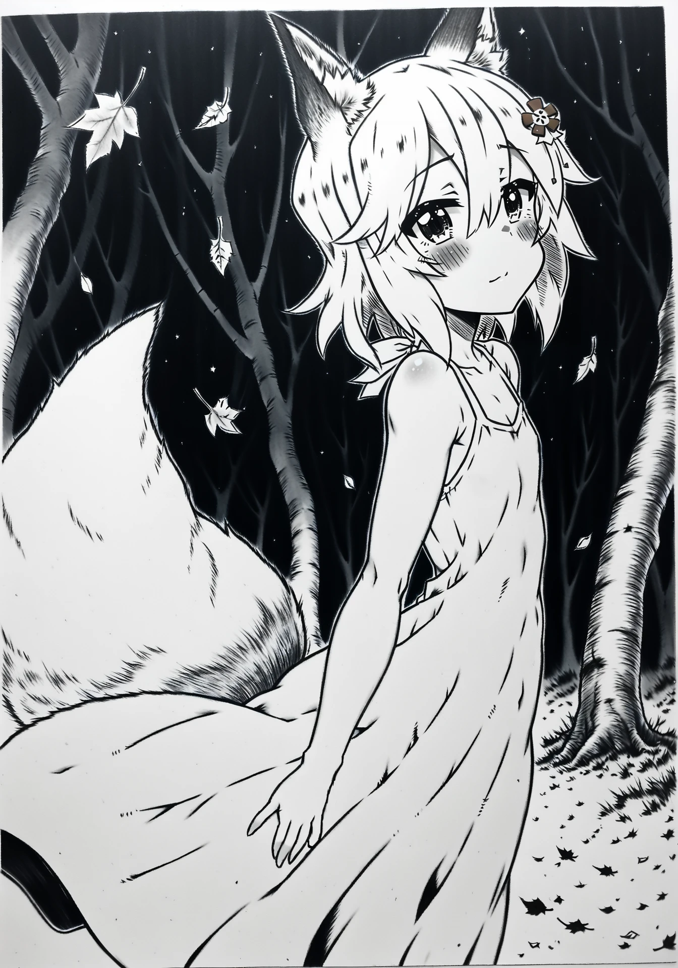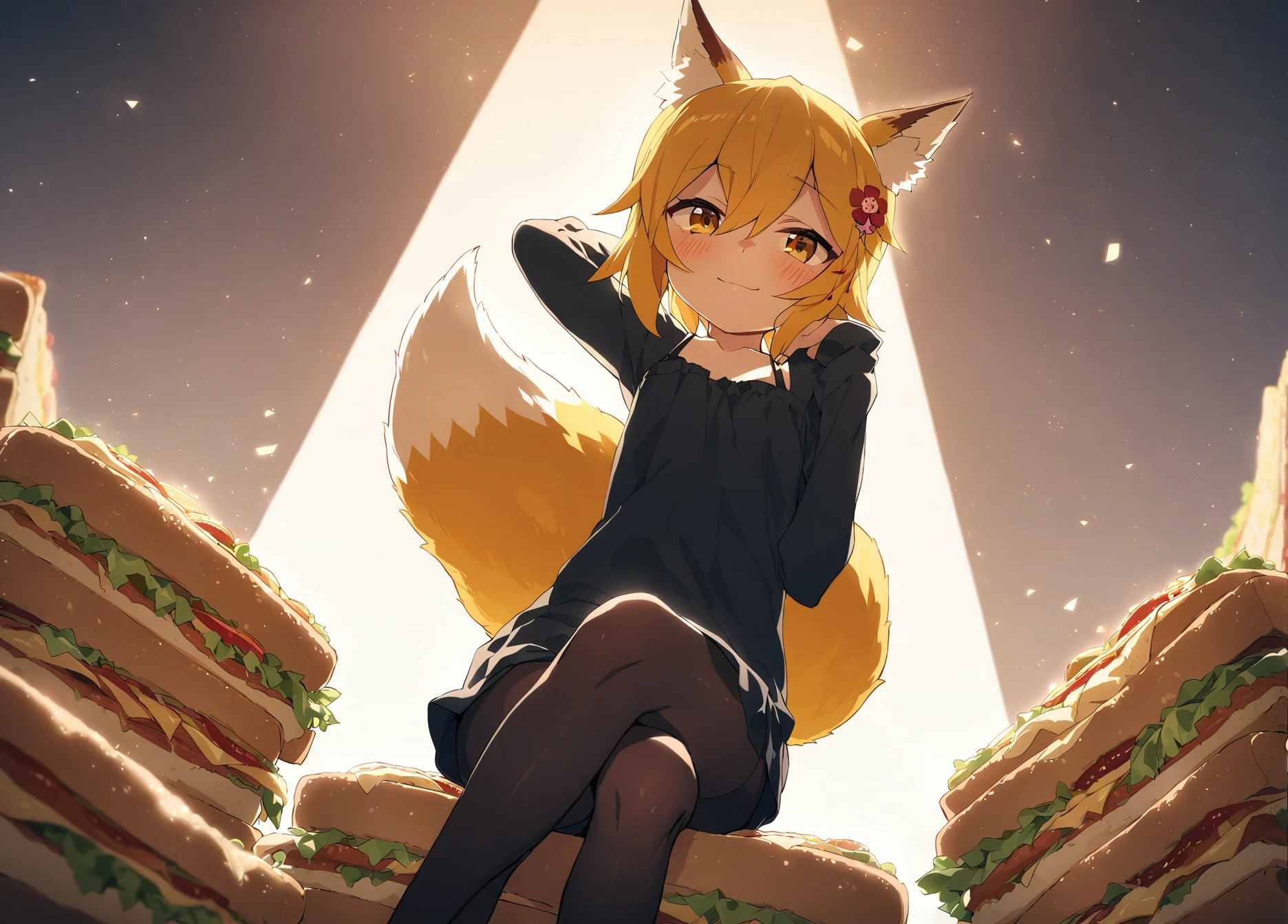 sen, blonde hair, animal ears, fox ears, blush, animal ear fluff, hair ornament, fox girl, hair flower, hair between eyes, short hair, fox tail, tail, flat chest, yellow eyes, young girl