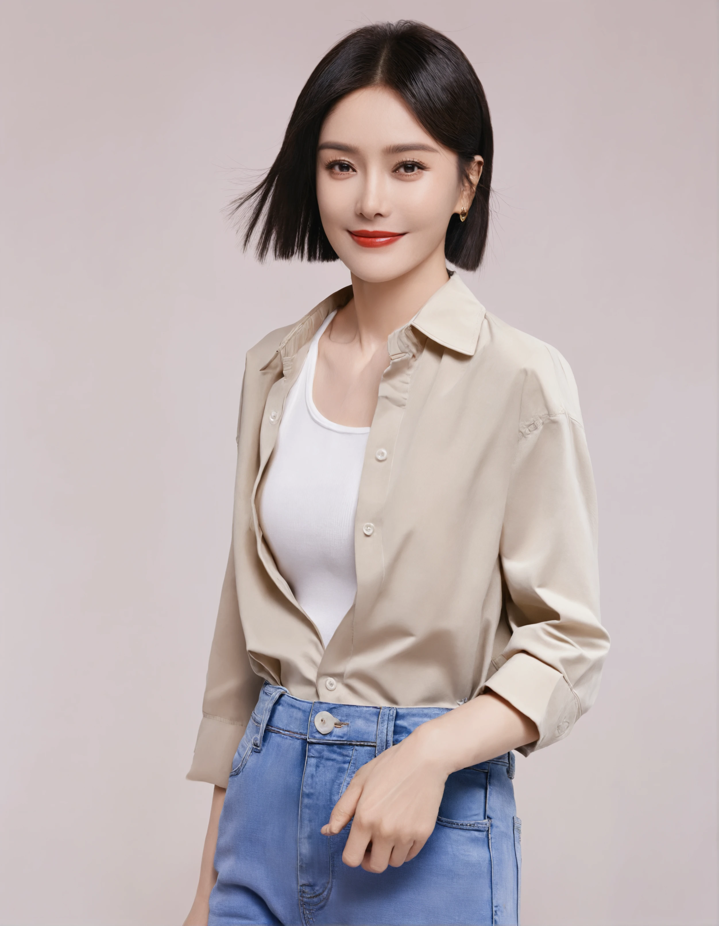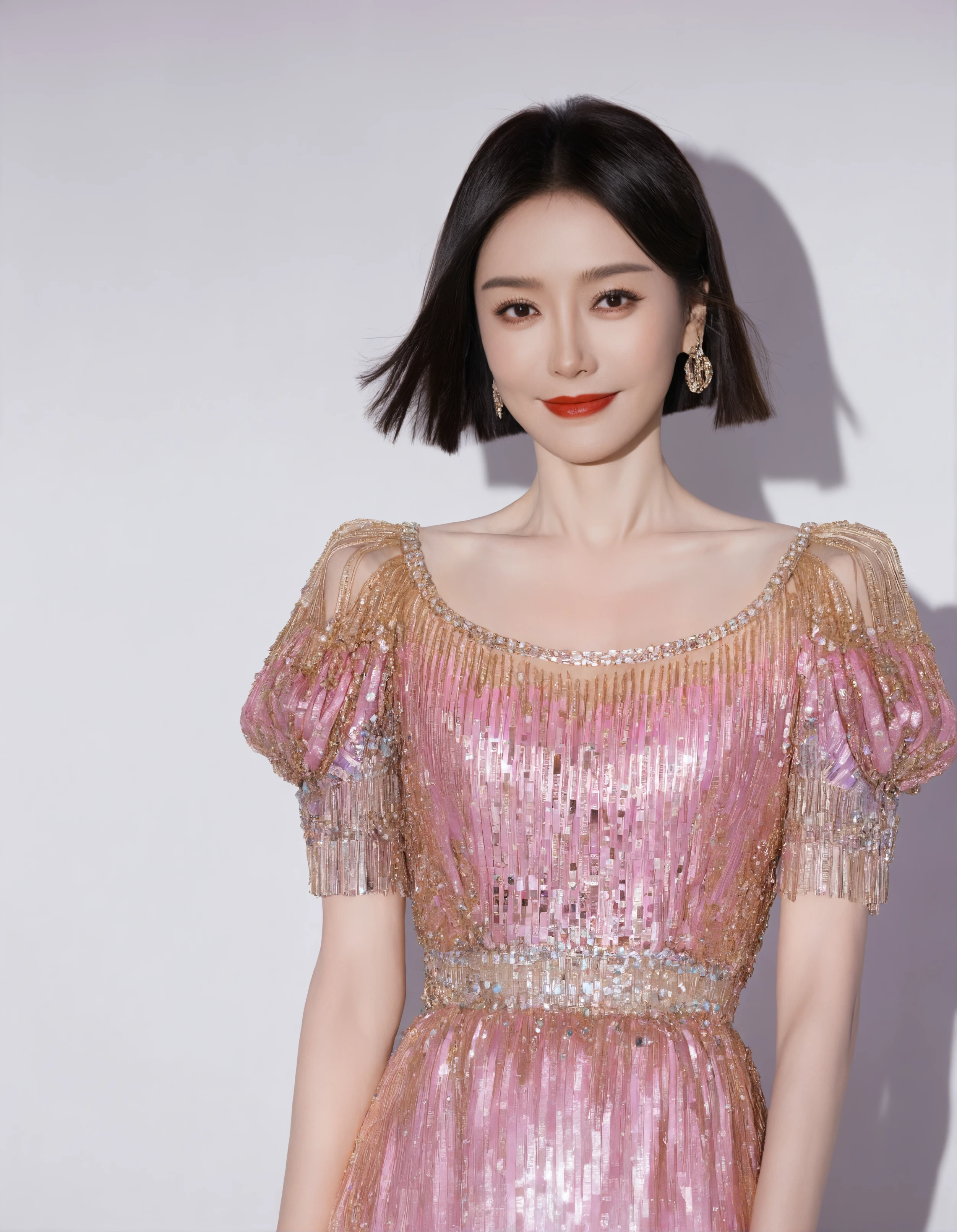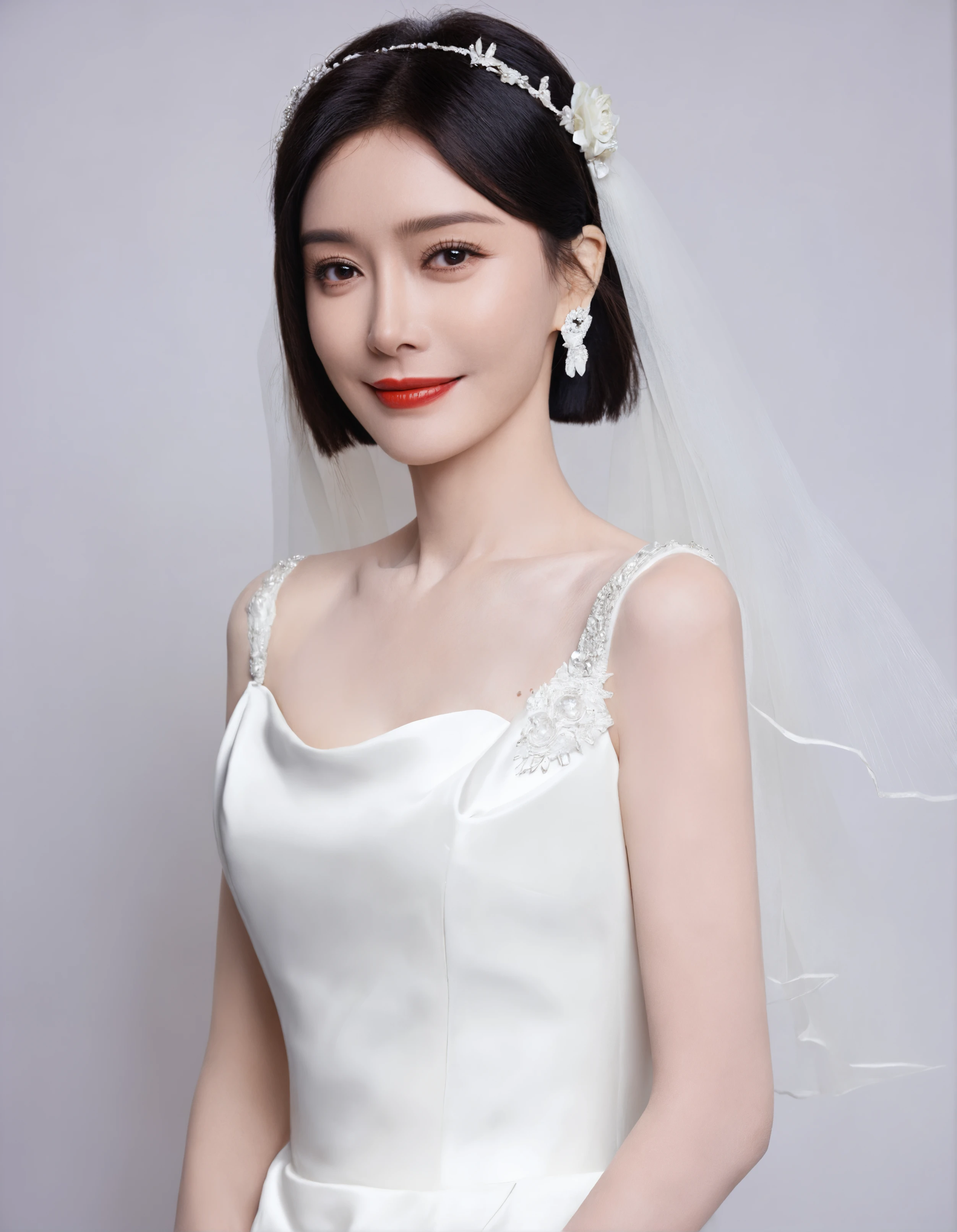 score_8_up,score_8,QINLAN,solo,upper body shot,body front,the frontal image features a young woman standing,She has short, dark hair,with a faint smile,refinde makeup,red lips,looking at viewer,white Gorgeous wedding dress with intricate design,wedding hair accessories,white simple background,The lighting is natural and soft,highlighting her flawless complexion and creating a warm, serene atmosphere.