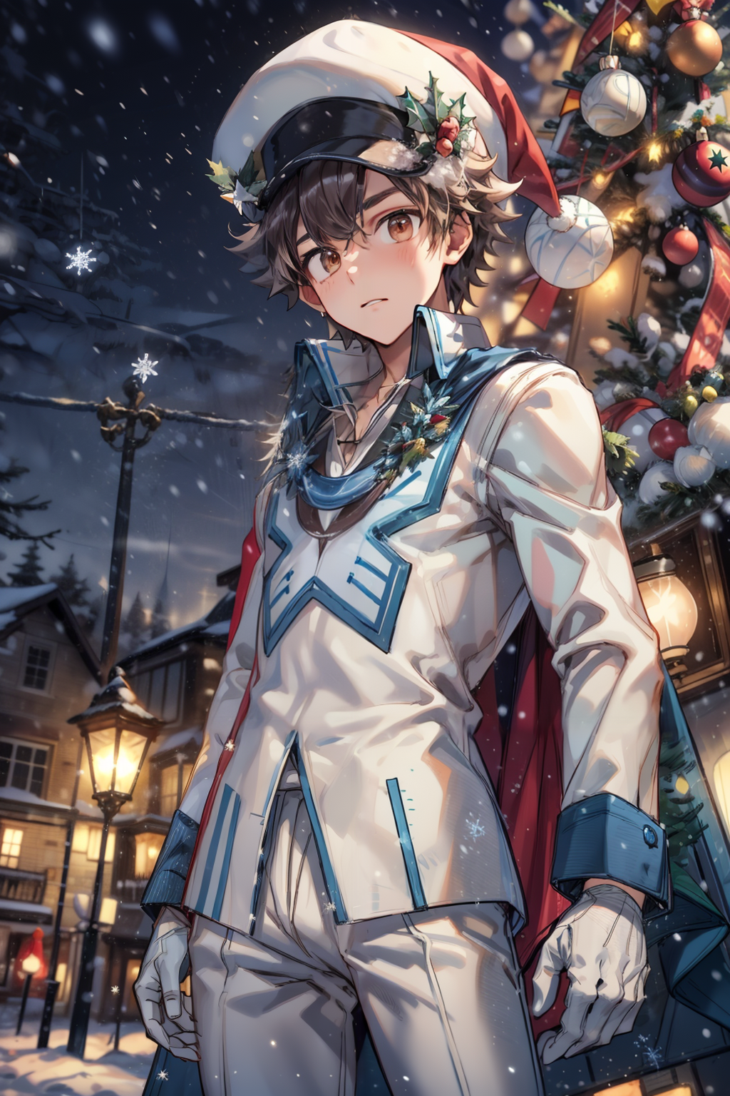 EX Color: red_neo_champion, brown hair, brown eyes, white headwear, white gloves, fingererless gloves, blue cape, hat ornament, collared shirt, blue shirt, white jacket, white pants, white shoes
