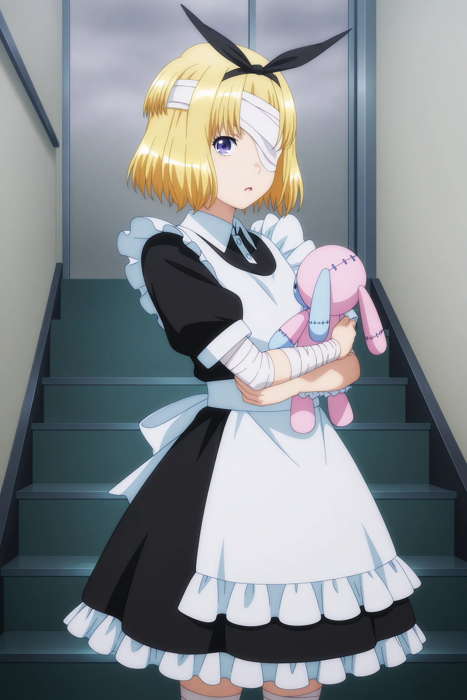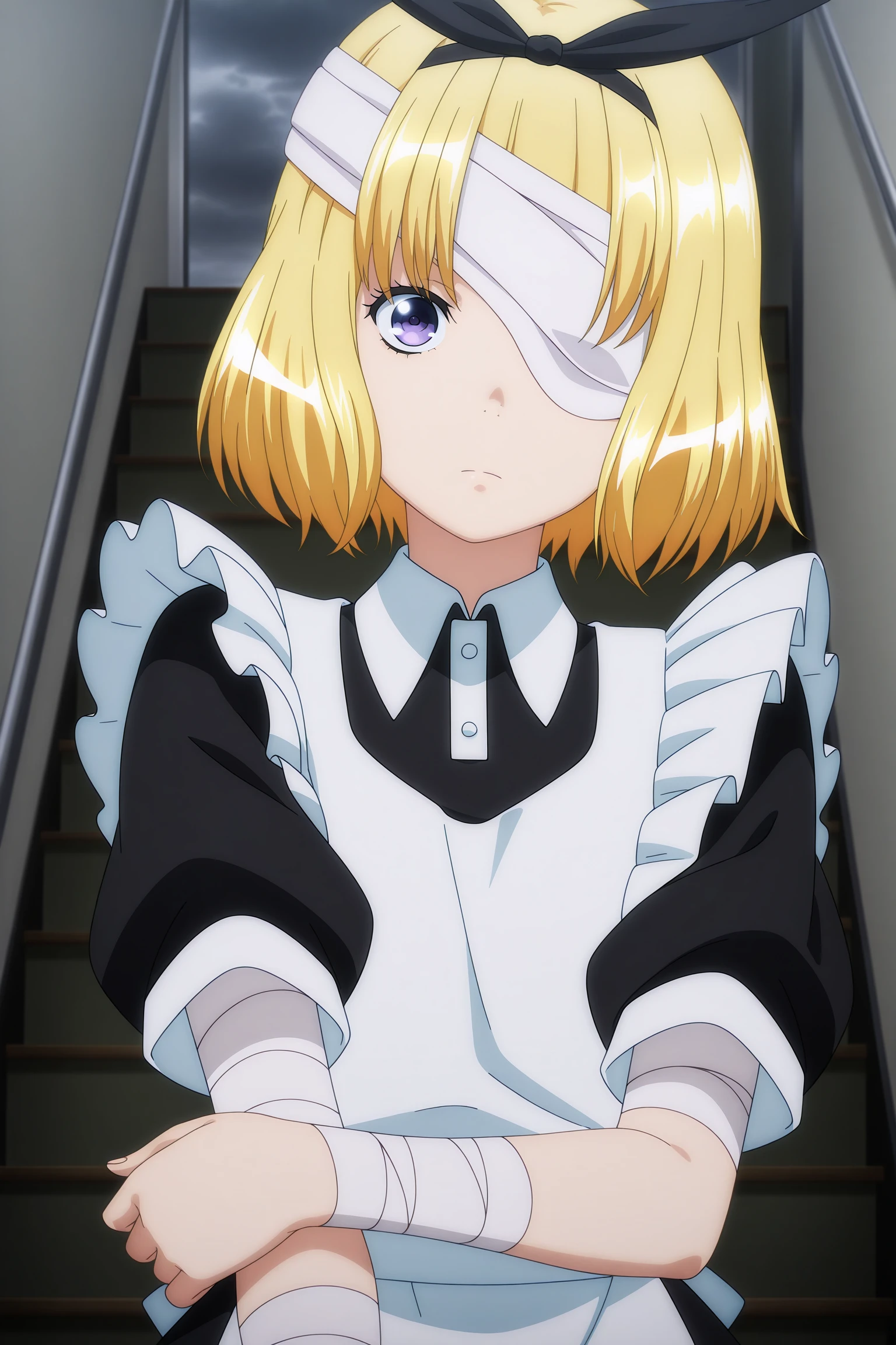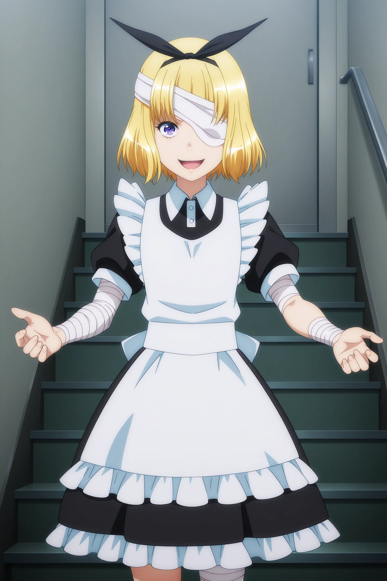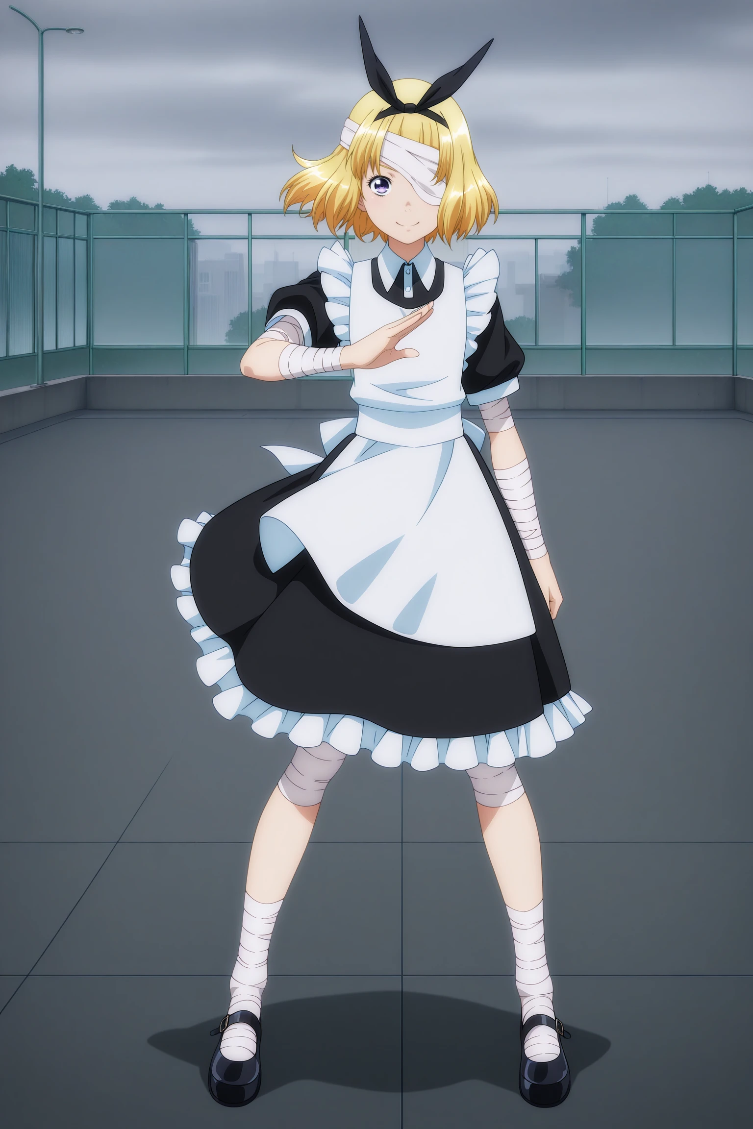 indara, short hair, blonde hair, bandage over one eye, bow hairband, purple eyes, puffy short sleeves, maid, black dress, maid apron, medium dress, lace-trimmed dress, bandaged arm, bandaged wrist, bandaged knees, bandaged leg, bandaged foot, black footwear, mary janes