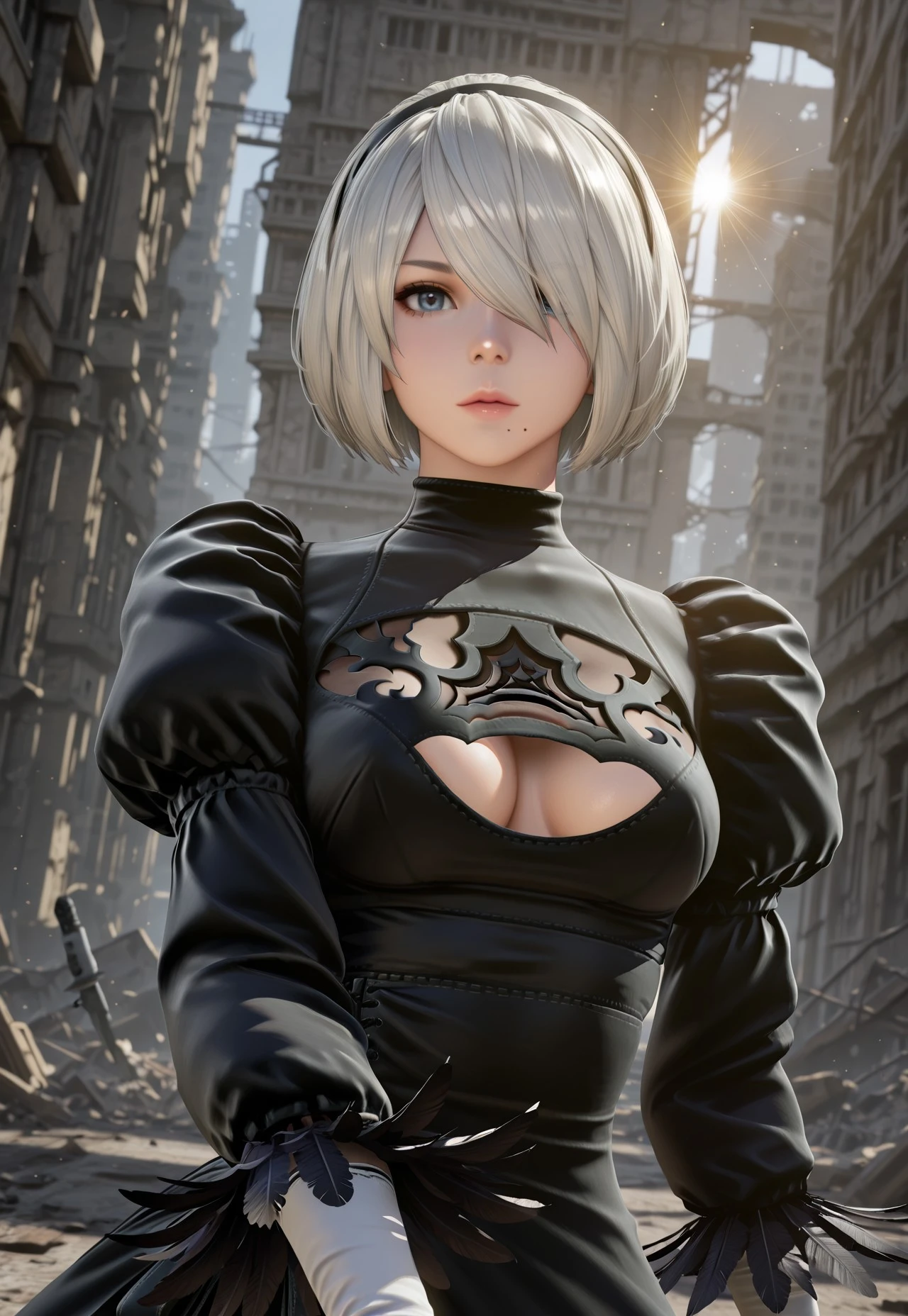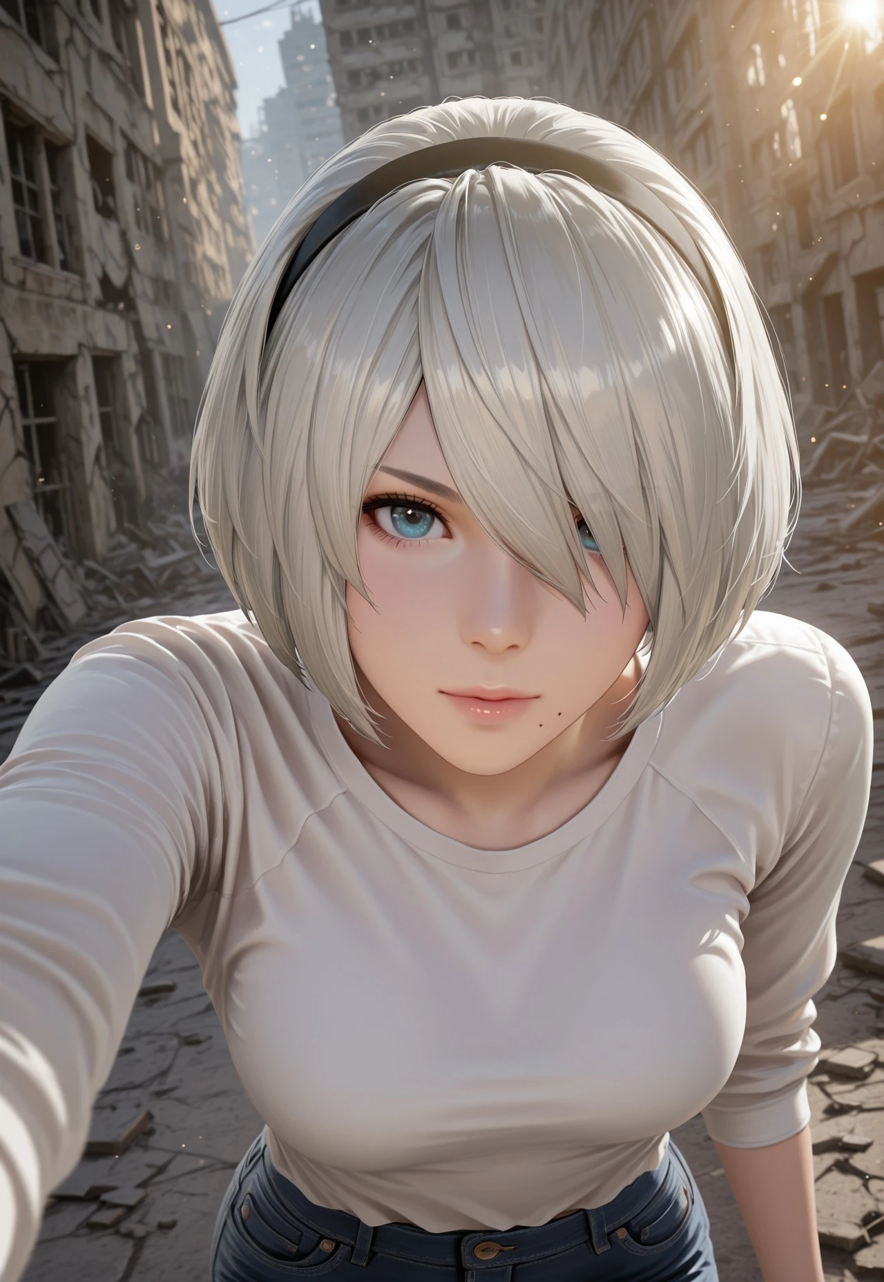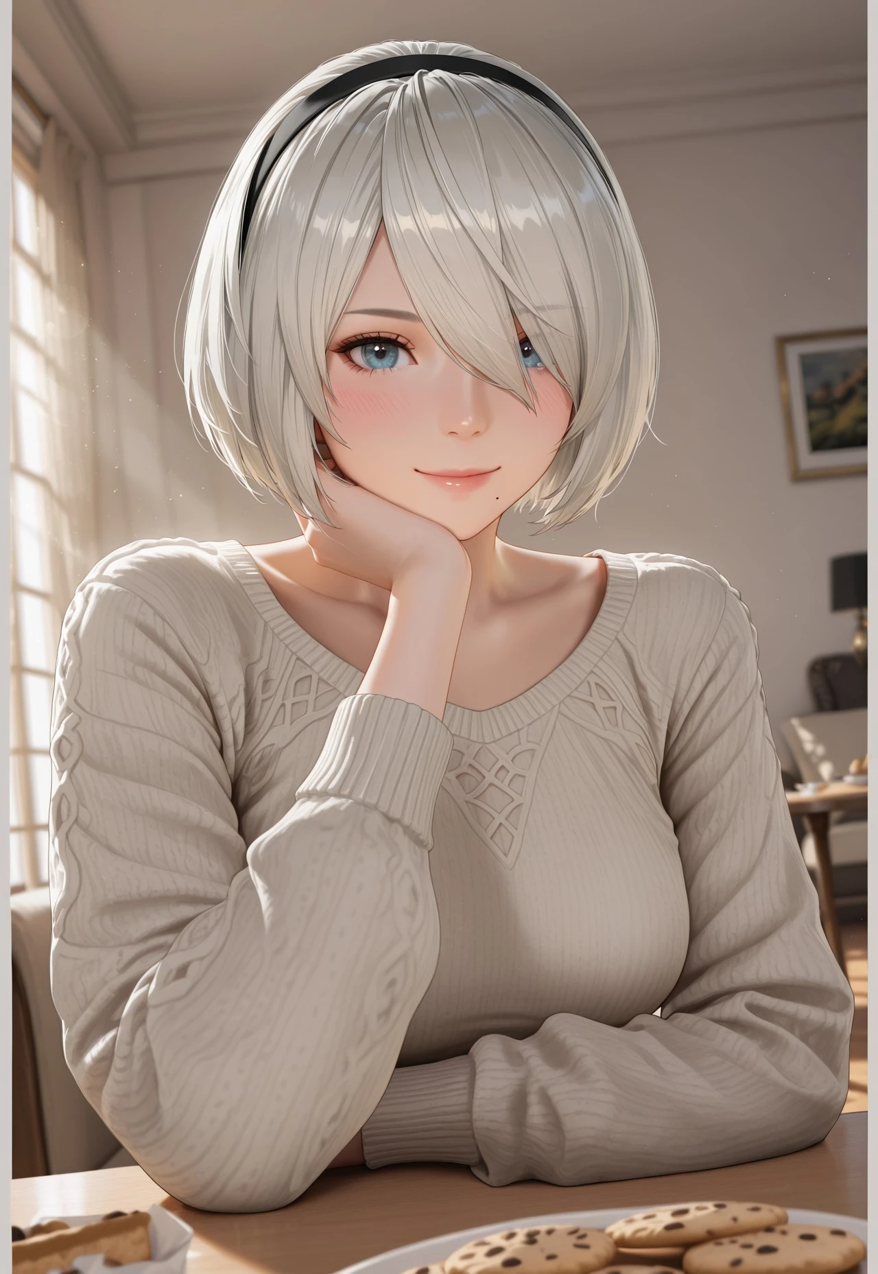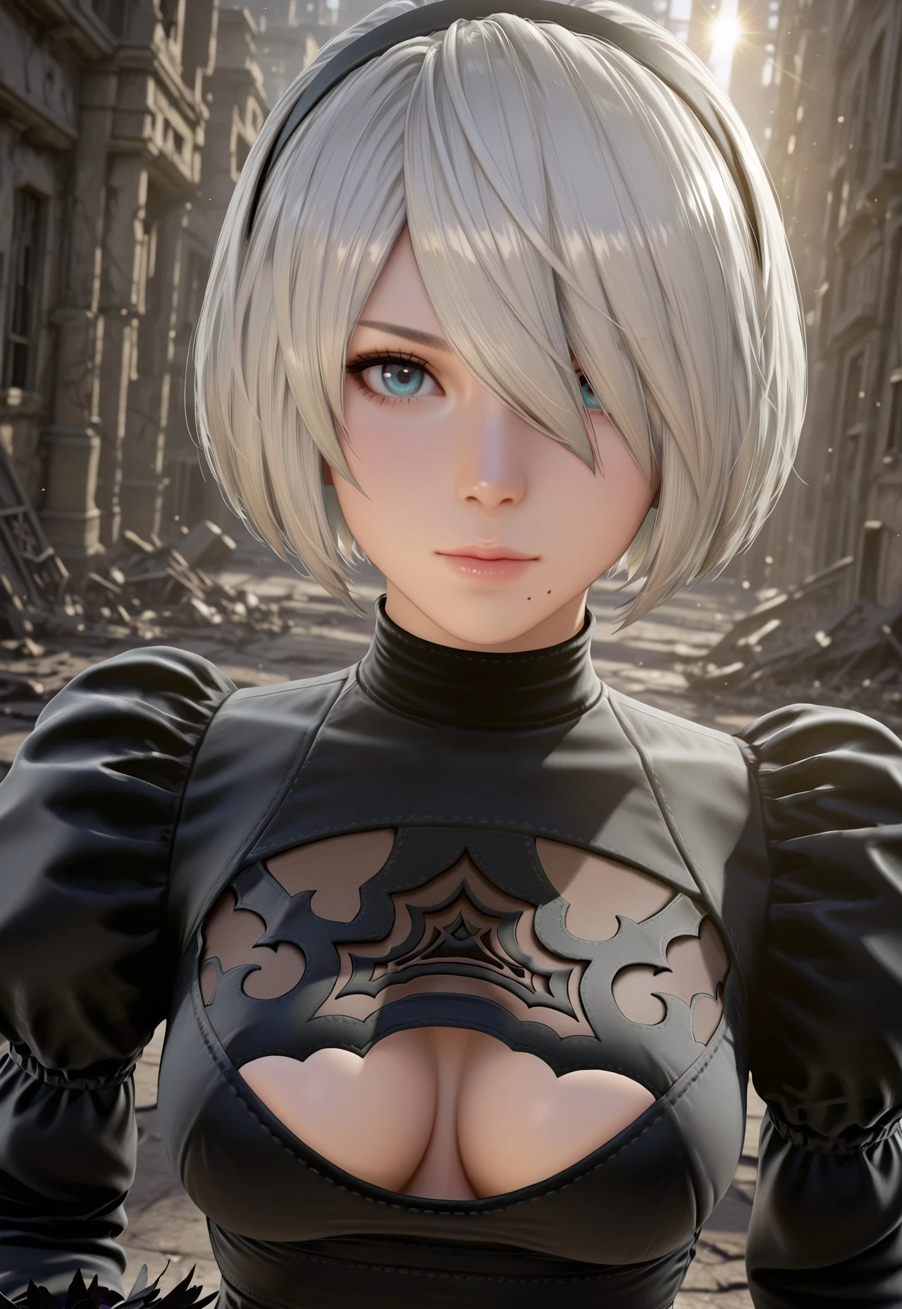 1 girl, yorha 2b, mole under mouth, white hair, short hair, hair over one eye, black hairband, blue eyes,