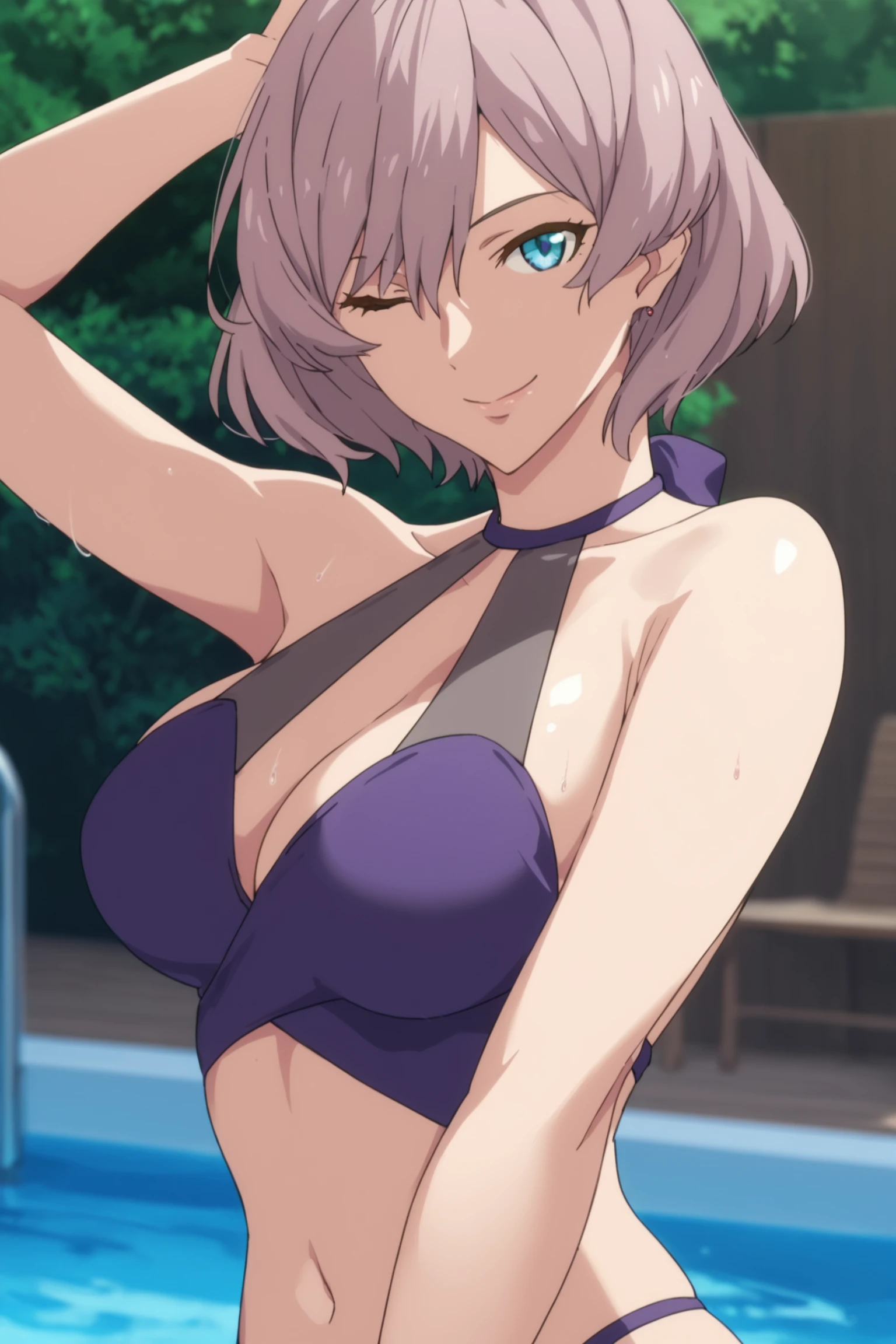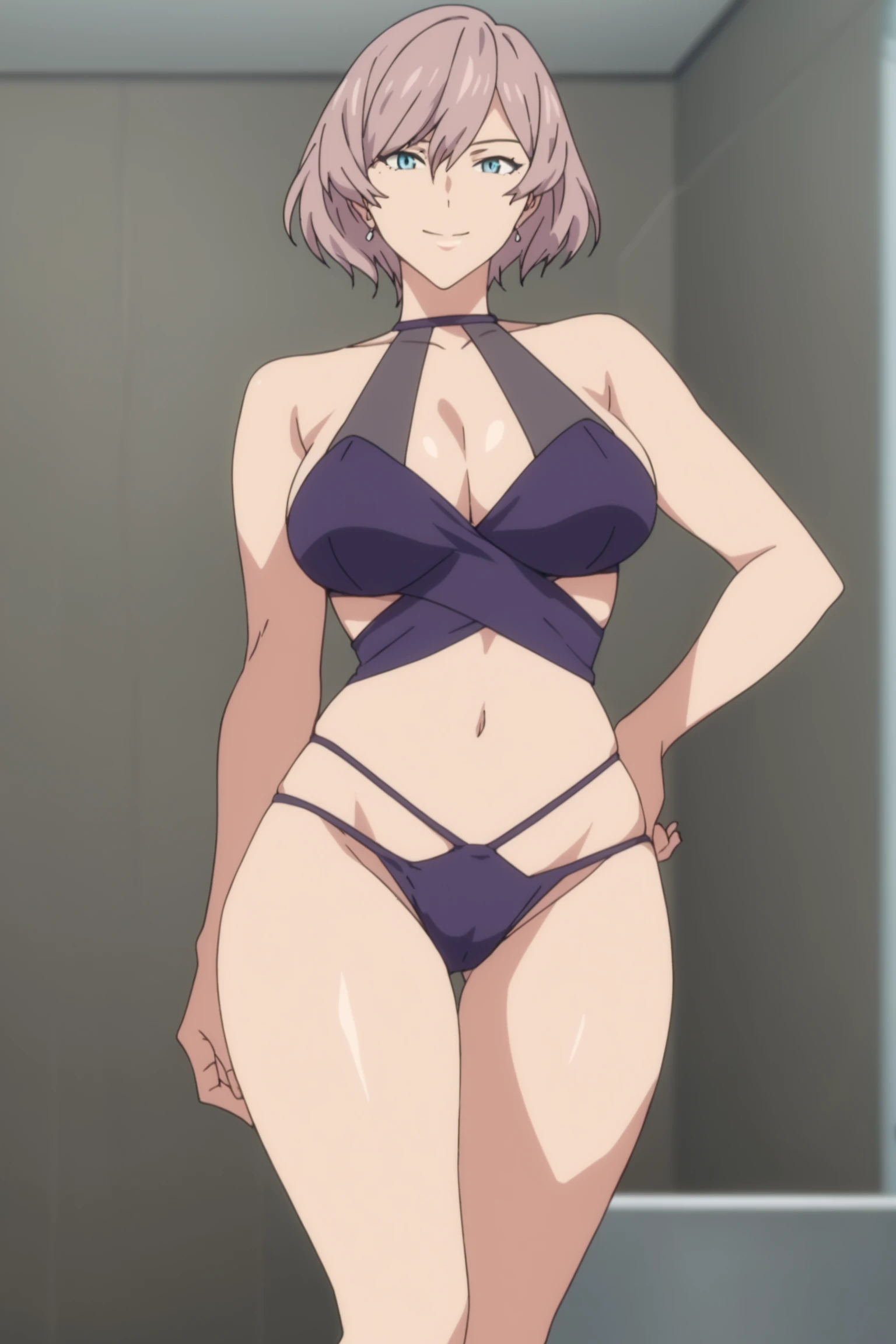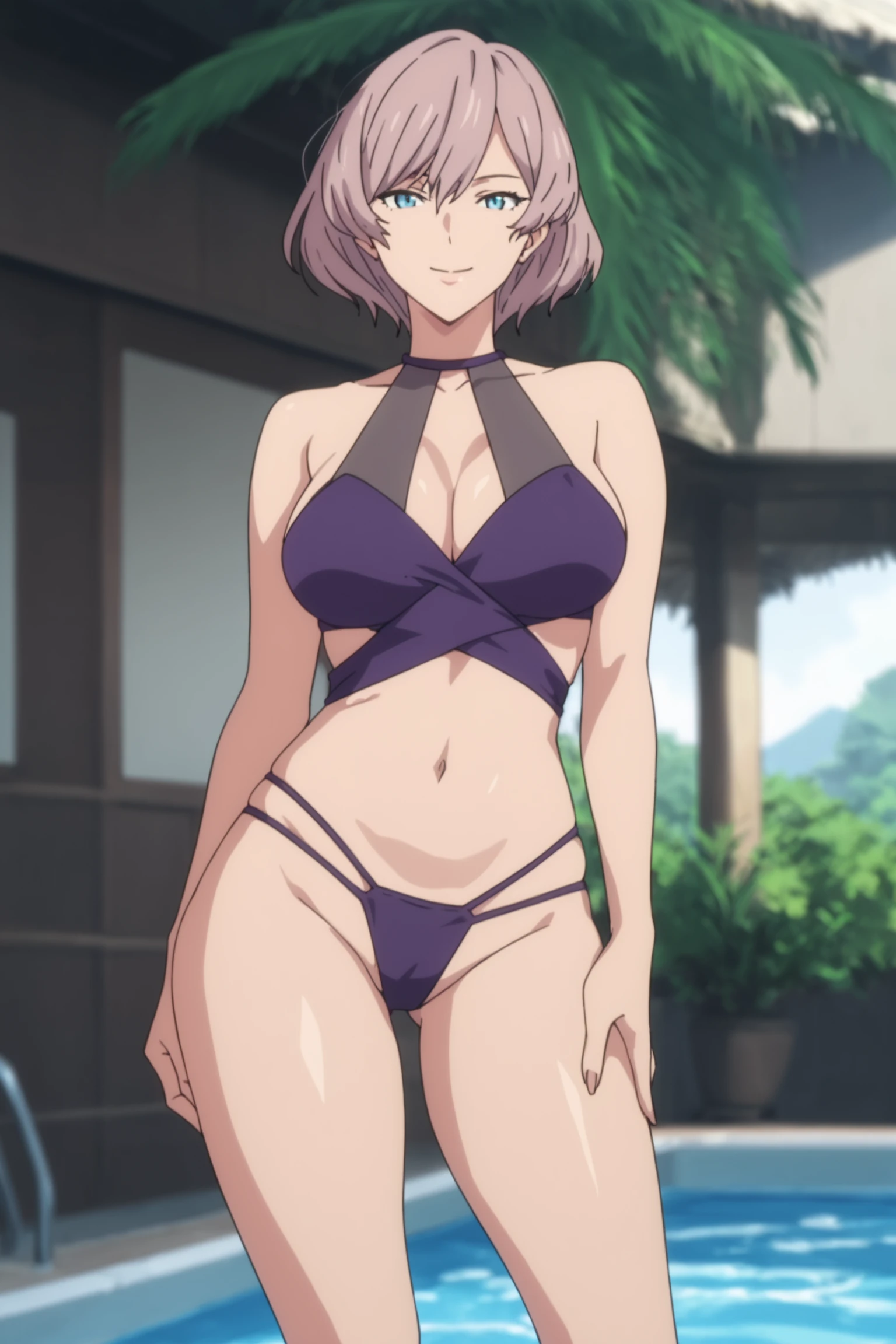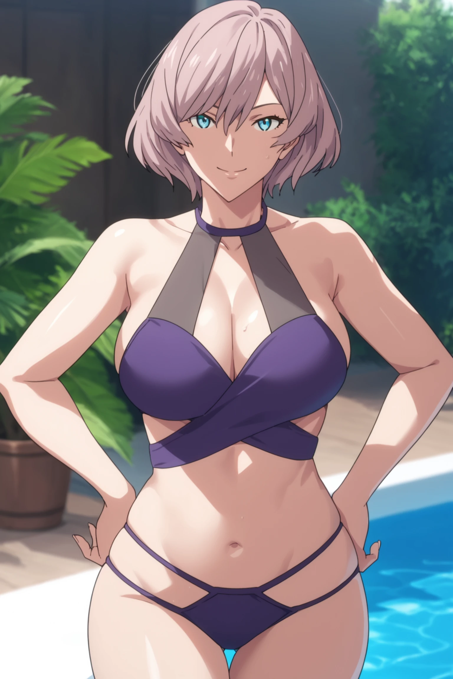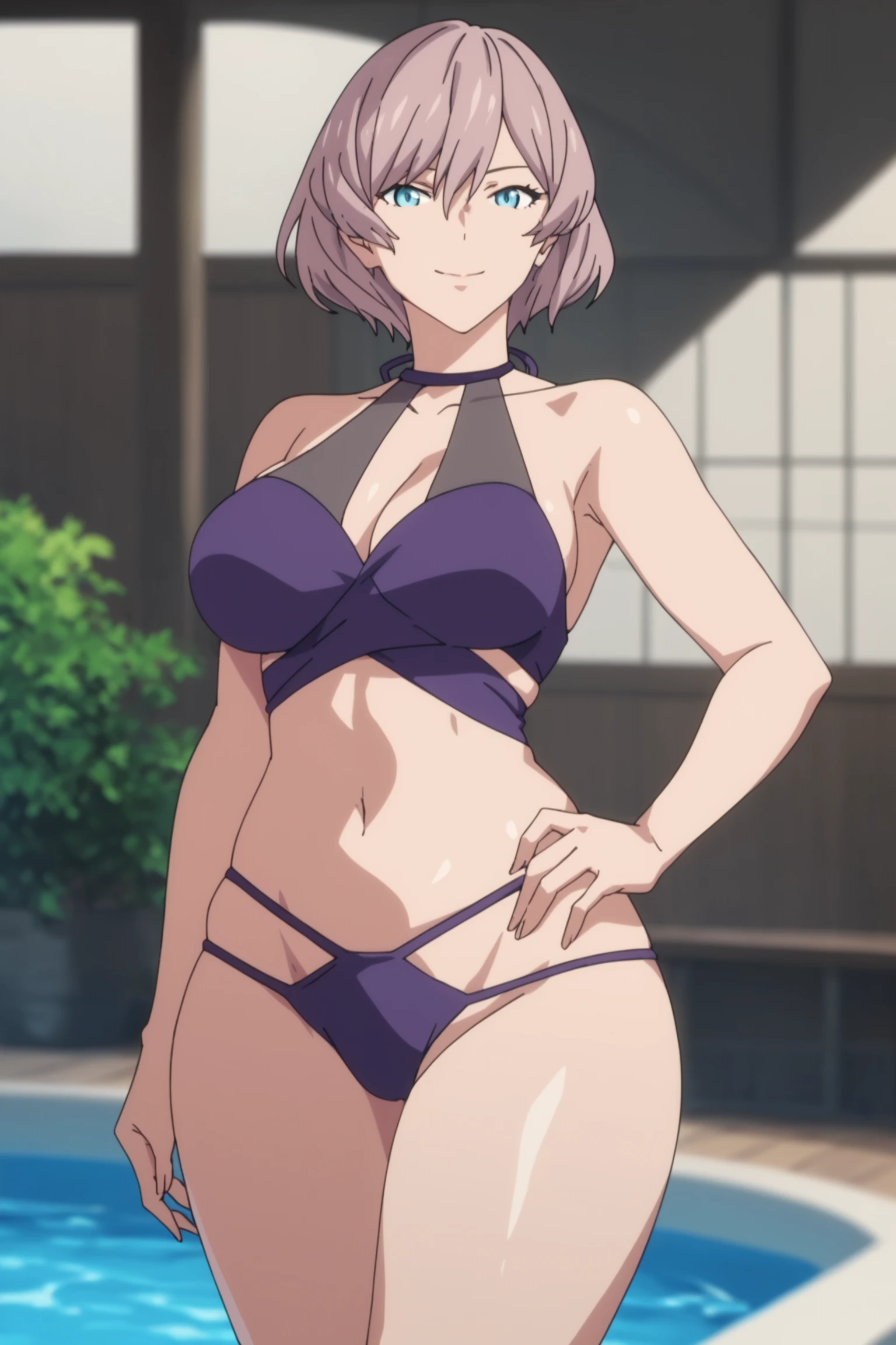 mujina, mujinabikini, blue eyes, short hair, purple hair, purple bikini, cleavage