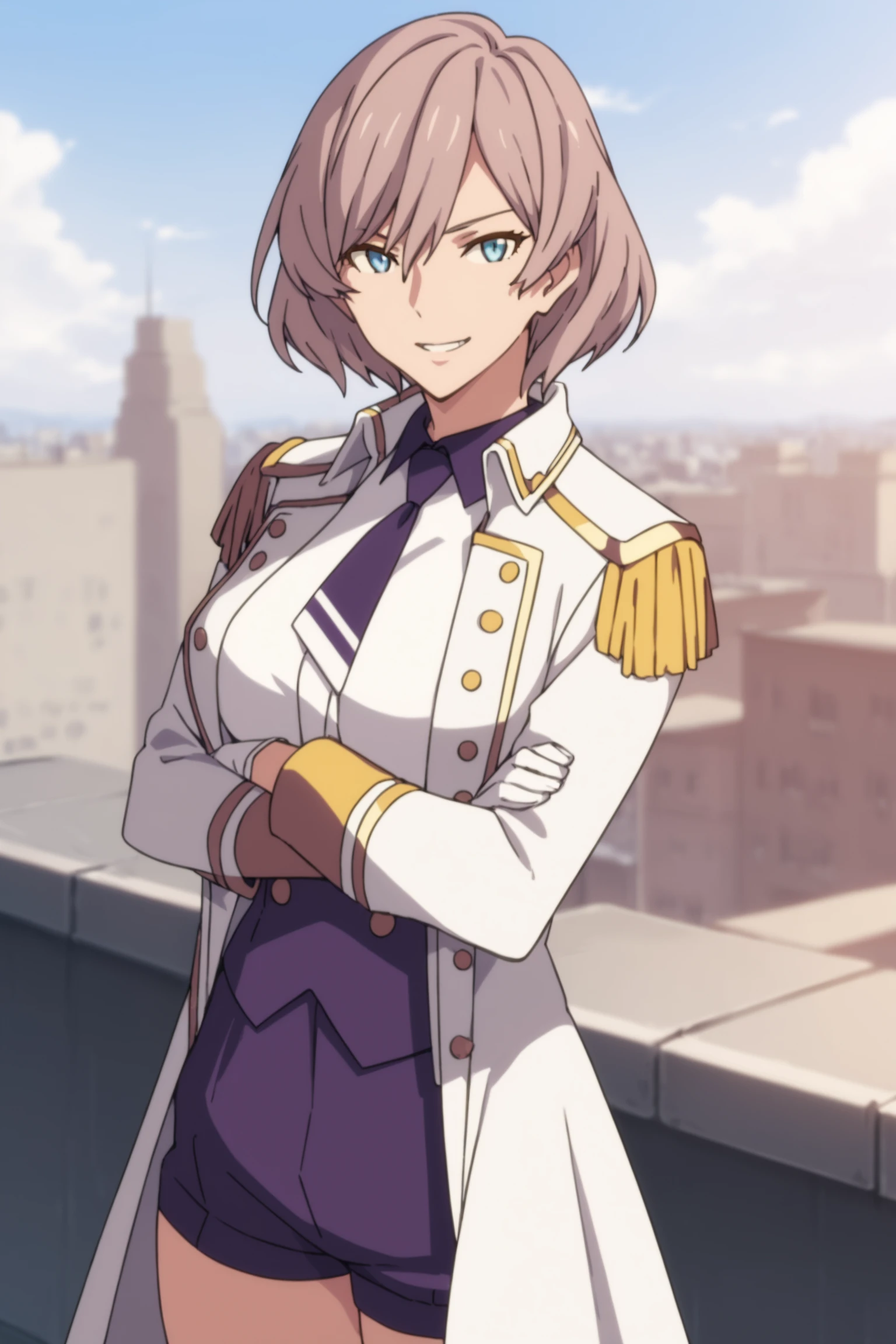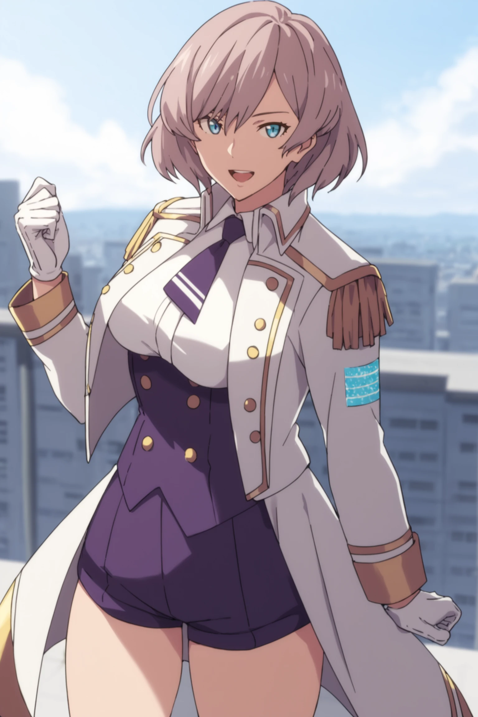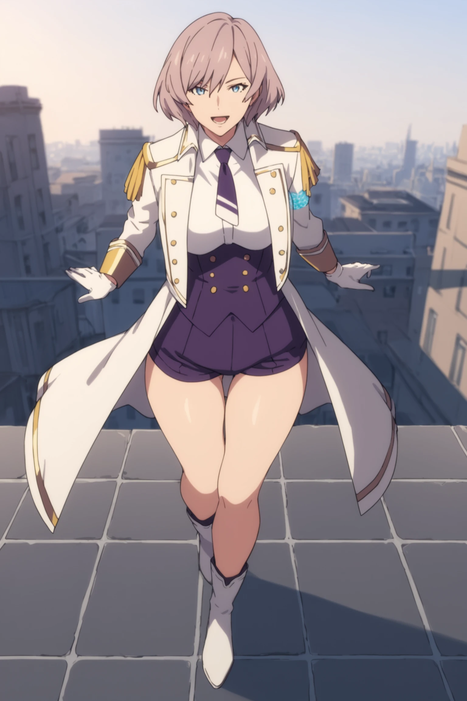 mujina, mujinanormal, blue eyes, short hair, purple hair, white gloves, necktie, purple shorts, short necktie, corset, white jacket, purple necktie, short shorts, long sleeves, open jacket, coat, bangs, white boots