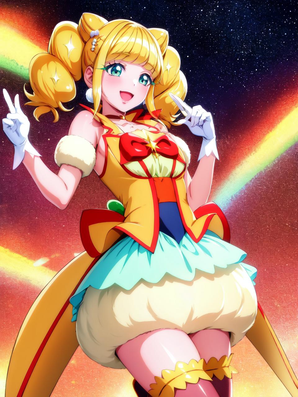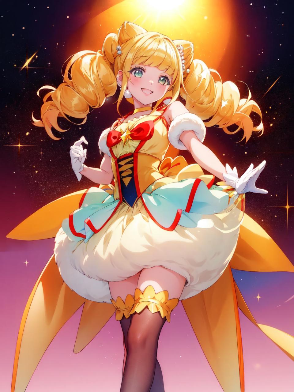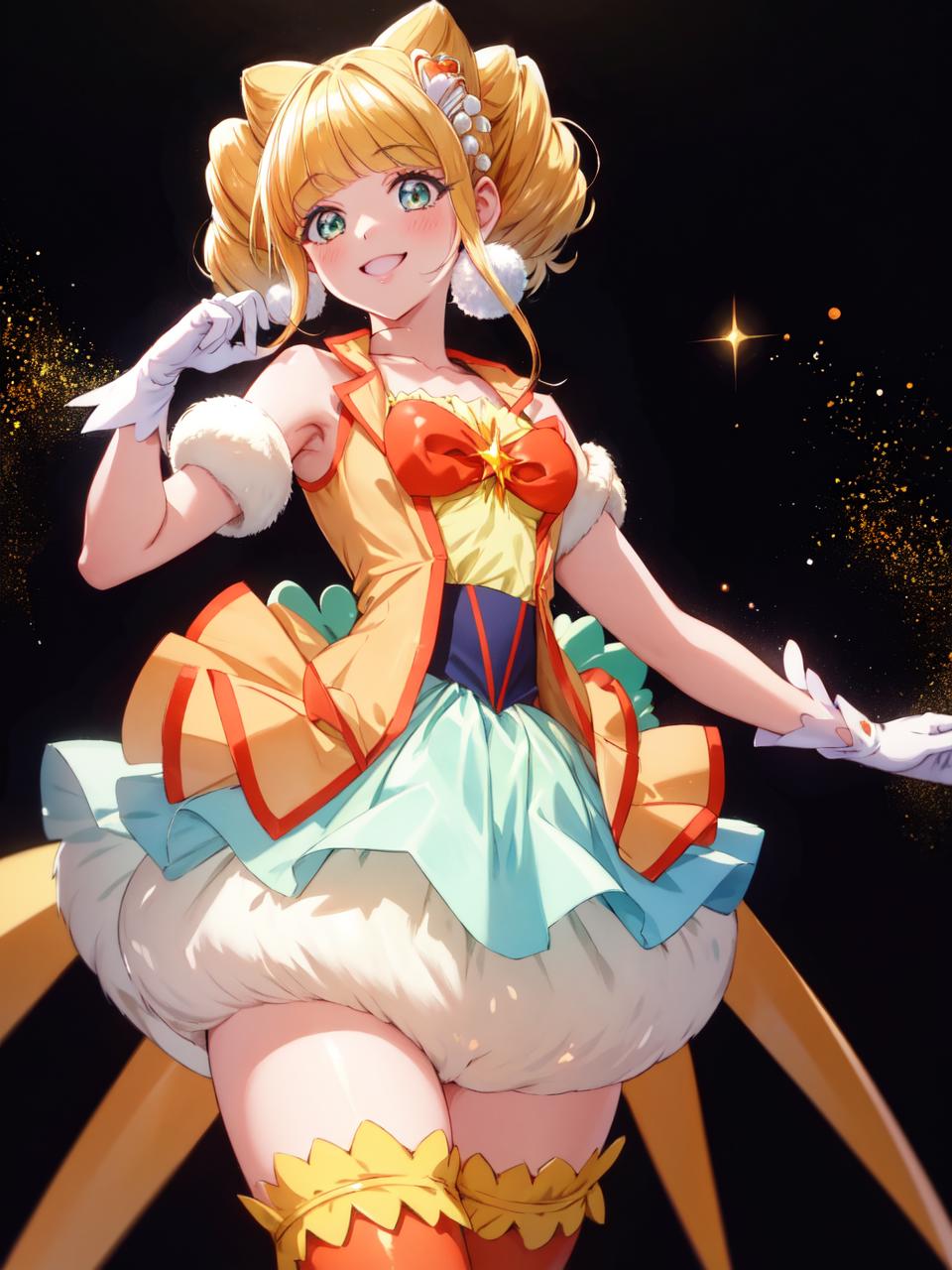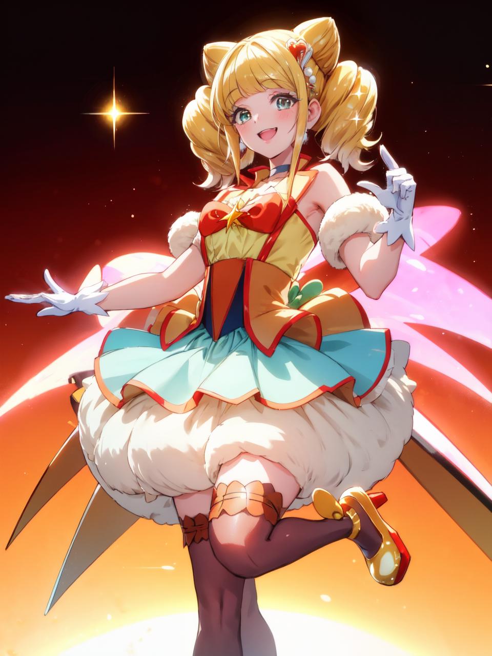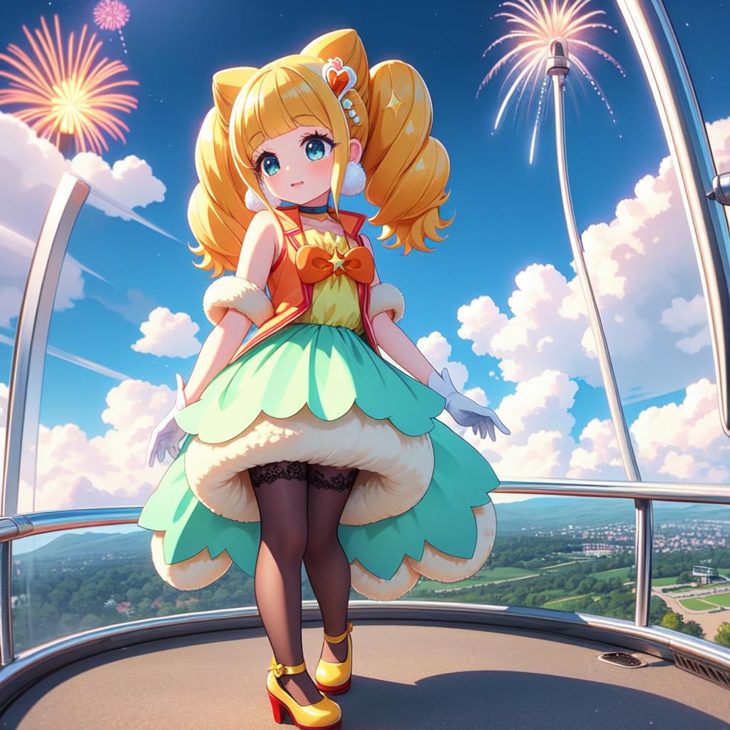 twintails, double bun, hair ornament, vest, ribbon, bubble skirt, high-waist skirt, white gloves, thighhighs, choker, petticoat, high heels